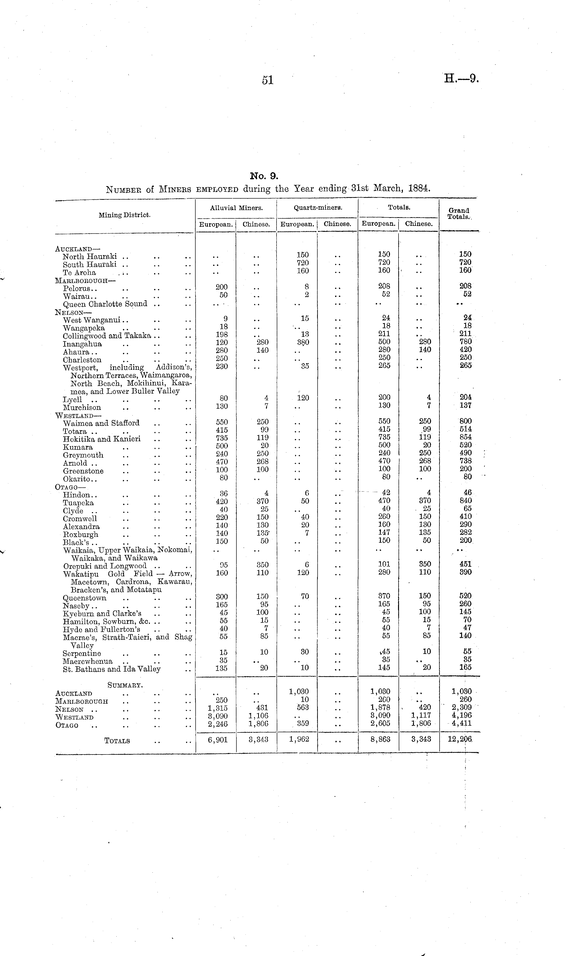 Alluvia: Miners. Quartz-miners. T01 ials. Mining District. Grand Totals. European. Chinese. European, j Chinese. Kuropean. Chinese. Auckland — North Hauraki South Hauraki Te Aroha Mablbobough— Pelorus Wairau Queen Charlotte Sound .. Kelson — West Wanganui Wangapeka Collingwood and Takaka Inangahua Ahaura Charleston Westport, including Addison's, Northern Terraces, Waimangaroa, North Beach, Mokihinui, Karamea, and Lower Buller Valley Lyell Murchison vVestland — Waimea and Stafford Totara Hokitika and Kanieri Kumara Greymouth Arnold Greenstone Okarito.. 3tago— Hindon Tuapeka Clyde .. Cromwell Alexandra Boxburgh Black's Waikaia, Upper Waikaia, Nokomai, Waikaka, and Waikawa Orepuki and Longwood Wakatipu Gold Field — Arrow, Maeetown, Cardrona, Kawarau, Bracken's, and Motatapu Queenstown Naseby Kyeburn and Clarke's Hamilton, Sowburn, &o. Hyde and Fullerton's Macrae's, Strath-Taieri, and Shag Valley Serpentine Maerewhenua St. Bathans and Ida Valley 200 50 9 18 198 120 280 250 230 80 130 550 415 735 500 240 470 100 80 *280 140 4 7 250 99 119 20 250 208 100 150 720 160 8 2 15 "l3 380 "35 120 150 720 160 208 52 24 18 211 500 280 250 265 200 130 550 415 735 500 240 470 100 80 *280 140 4 7 250 99 119 20 250 268 100 150 720 160 208 52 24 18 211 780 420 250 265 204 137 800 514 854 520 490 738 200 80 36 420 40 220 140 140 150 4 370 25 150 130 13550 0 50 40 20 7 42 470 40 260 160 147 150 4 370 25 150 130 135 50 46 840 65 410 290 282 200 95 160 350 110 6 120 101 280 350 110 451 390 300 165 45 55 40 55 150 95 100 15 7 85 70 370 165 45 55 40 55 150 95 100 15 7 85 520 260 145 70 47 140 15 35 135 10 30 v45 35 145 10 55 35 165 "20 "lO **20 SUMMAEY. Auckland VIablbobough Kelson .. vVestlakd Dtago 250 1,315 3,090 2,246 431 1,106 1,806 1,030 10 563 1,030 260 1,878 8,090 2,605 420 1,117 1,806 1,080 260 ' 2,309 4,196 4,411 359 Totals 6,901 3,343 1,962 8,863 3,343 12,206