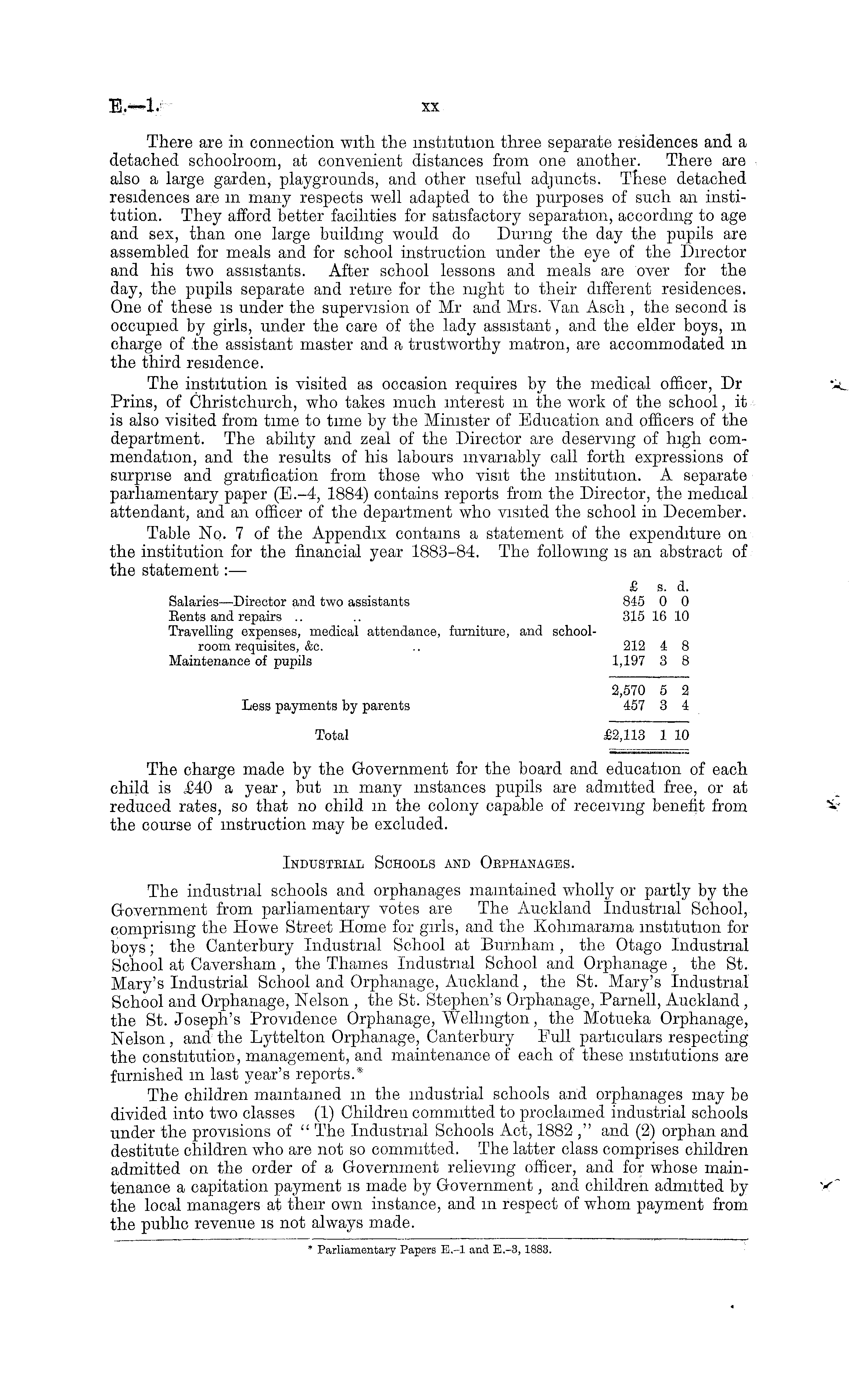 There are in connection with the institution three separate residences and a detached schoolroom, at convenient distances from one another. There are also a large garden, playgrounds, and other useful adjuncts. These detached residences are in many respects well adapted to the purposes of such an institution. They afford better facilities for satisfactory separation, according to age and sex, than one large building would do During the day the pupils are assembled for meals and for school instruction under the eye of the Director and his two assistants. After school lessons and meals are over for the day, the pupils separate and retire for the night to their different residences. One of these is under the supervision of Mr and Mrs. Van Asch , the second is occupied by girls, under the care of the lady assistant, and the elder boys, m charge of the assistant master and a trustworthy matron, are accommodated m the third residence. The institution is visited as occasion requires by the medical officer, Dr Brins, of Christchurch, who takes much interest m the work of the school, it is also visited from time to time by the Minister of Education and officers of the department. The ability and zeal of the Director are deserving of high commendation, and the results of his labours invariably call forth expressions of surprise and gratification from those who visit the institution. A separate parliamentary paper (E.-4, 1884) contains reports from the Director, the medical attendant, and an officer of the department who visited the school in December. Table No. 7 of the Appendix contains a statement of the expenditure on the institution for the financial year 1883-84. The following is an abstract of the statement: — £ s. d. Salaries—Director and two assistants 845 0 0 Bents and repairs .. .. 315 16 10 Travelling expenses, medical attendance, furniture, and schoolroom requisites, &c. .. 212 4 8 Maintenance of pupils 1,197 3 8 2,570 5 2 Less payments by parents 457 3 4 Total £2,113 1 10 The charge made by the Government for the board and education of each child is £40 a year, but m many instances pupils are admitted free, or at reduced rates, so that no child m the colony capable of receiving benefit from the course of instruction may be excluded. Industeial Schools and Oephanages. The industrial schools and orphanages maintained wholly or partly by the Government from parliamentary votes are The Auckland Industrial School, comprising the Howe Street Home for girls, and the Kohimarama institution for boys; the Canterbury Industrial School at Burnham, the Otago Industrial School at Caversham , the Thames Industrial School and Orphanage , the St. Mary's Industrial School and Orphanage, Auckland, the St. Mary's Industrial School and Orphanage, Nelson , the St. Stephen's Orphanage, Barnell, Auckland , the St. Joseph's Brovidence Orphanage, Wellington, the Motueka Orphanage, Nelson, and the Lyttelton Orphanage, Canterbury Bull particulars respecting the constitution, management, and maintenance of each of these institutions are furnished m last year's reports.* The children maintained in the industrial schools and orphanages may be divided into two classes (1) Children committed to proclaimed industrial schools under the provisions of " The Industrial Schools Act, 1882 ," and (2) orphan and destitute children who are not so committed. The latter class comprises children admitted on the order of a Government relieving officer, and for whose maintenance a capitation payment is made by Government, and children admitted by the local managers at their own instance, and m respect of whom payment from the public revenue is not always made.