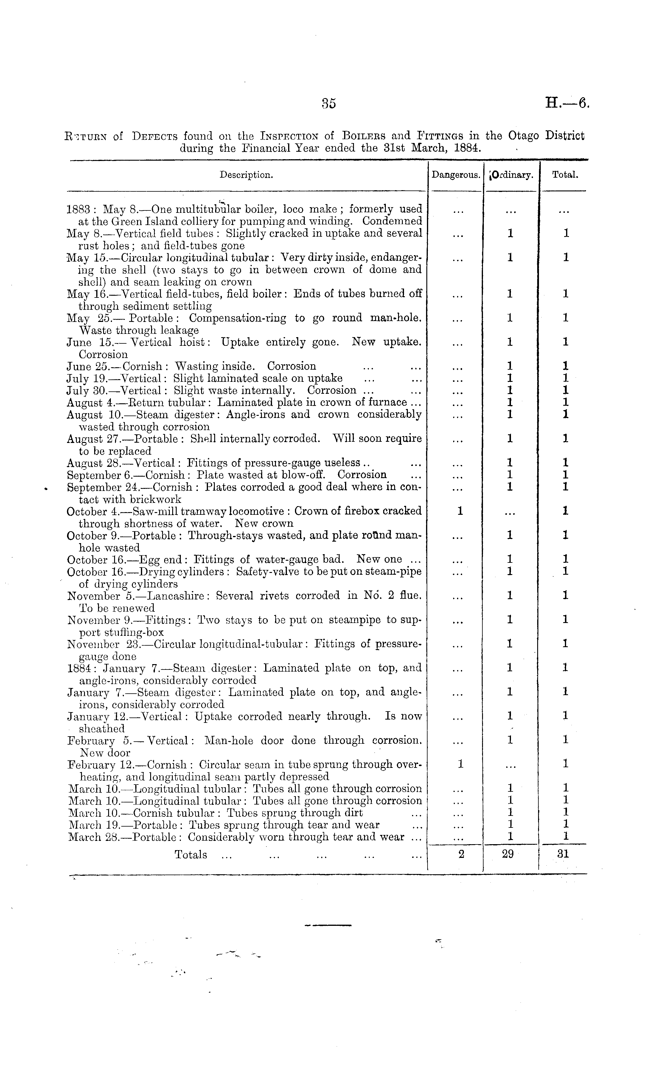 Description. Dangerous. (Ordinary. Total. 1883 : May 8.—One multitubular boiler, loco make ; formerly used at the Green Island colliery for pumping and winding. Condemned May 8.—Vertical field tubes : Slightly cracked in uptake and several rust holes ; and field-tubes gone May 15. —Circular longitudinal tubular : Very dirty inside, endangering the shell (two stays to go in between crown of dome and shell) and seam leaking on crown May 16.—Vertical field-tubes, field boiler: Ends of tubes burned off through sediment settling May 25.— Portable : Compensation-ring to go round man-hole. Waste through leakage June 15.— Vertical hoist: Uptake entirely gone. New uptake. Corrosion June 25.— Cornish: Wasting inside. Corrosion July 19. —Vertical: Slight laminated scale on uptake July 30.—Vertical: Slight waste internally. Corrosion ... August 4.—Eeturn tubular : Laminated plate in crown of furnace ... August 10. —Steam digester: Angle-irons and crown considerably wasted through corrosion August 27.—Portable : Shell internally corroded. Will soon require to be replaced August 28. —Vertical: Fittings of pressure-gauge useless .. September 6. —Cornish : Plate wasted at blow-off. Corrosion September 24.—Cornish : Plates corroded a good deal where in contact with brickwork October 4.—Saw-mill tramway locomotive : Crown of firebox cracked through shortness of water. New crown October 9. —Portable : Through-stays wasted, and plate round manhole wasted October 16.—Egg end: Fittings of water-gauge bad. New one ... October 16.—Drying cylinders : Safety-valve to be put on steam-pipe of drying cylinders November 5. —Lancashire: Several rivets corroded in No. 2 flue. To be renewed November 9.—Fittings: Two stays to be put on steampipe to support stuffing-box November 23. —Circular longitudinal-tubular : Fittings of pressuregauge done 1884: January 7.—Steam digester: Laminated plate on top, and angle-irons, considerably corroded January 7. —Steam digester: Laminated plate on top, and angleirons, considerably corroded January 12. —Vertical: Uptake corroded nearly through. Is now - sheathed February 5.— Vertical: Man-hole door done through corrosion. New door February 12.—Cornish : Circular seam in tube sprung through overheating, and longitudinal seam partly depressed March 10. —Longitudinal tubular : Tubes all gone through corrosion March 10.—Longitudinal tubular : Tubes all gone through corrosion March 10. —Cornish tubular : Tubes sprung through dirt March 19.—Portable: Tubes sprung through tear and wear March 28.—Portable : Considerably worn through tear and wear ... 1 1 1 1 1 1 1 1 1 1 1 1 1 1 1 1 1 1 1 1 1 1 1 1 1 1 1 1 1 1 1 1 1 1 1 1 1 1 1 1 1 1 1 1 1 1 1 1 1 1 1 1 1 1 1 1 1 1 1 1 1 1 Totals ... 29 81