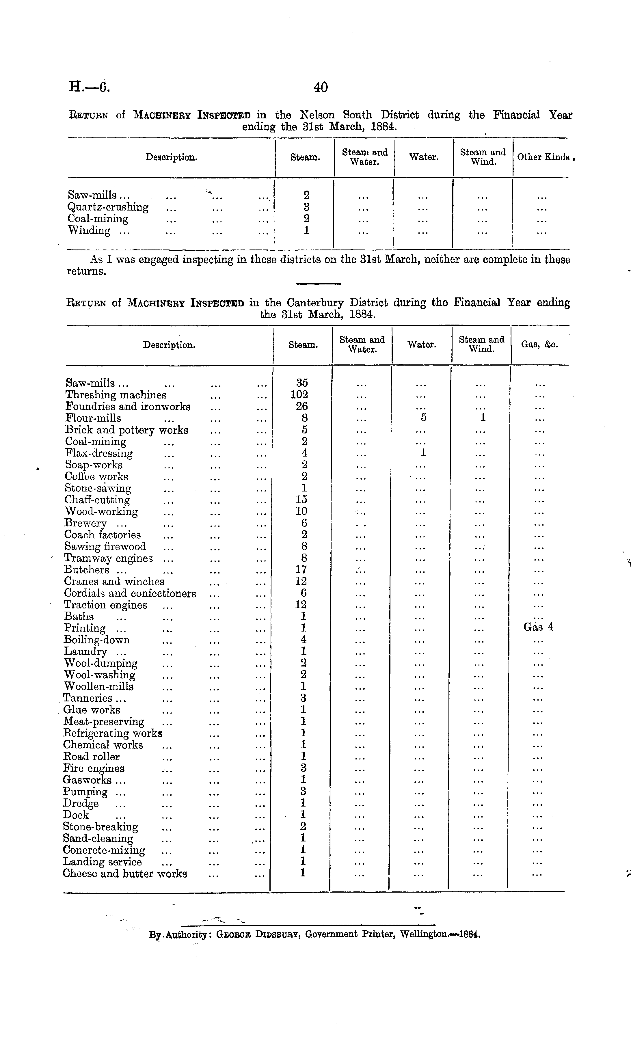 Return of Machinery Inspected in the Nelson South District during the Financial Year ending the 31st March, 1884.