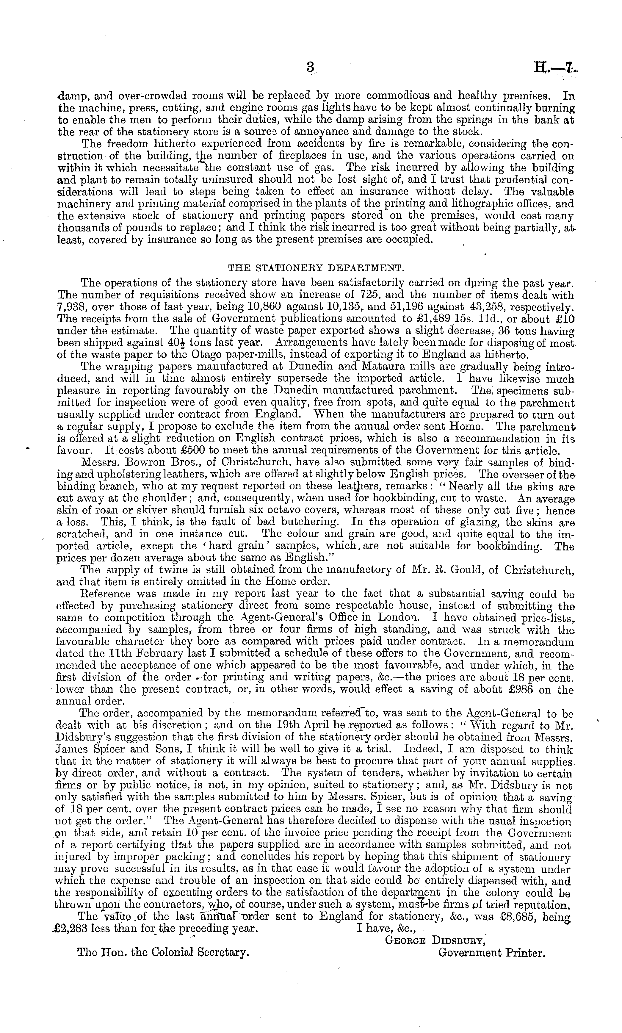 damp, and over-crowded rooms will be replaced by more commodious and healthy premises. In the machine, press, cutting, and engine rooms gas lights have to be kept almost continually burning to enable the men to perform their duties, while the damp arising from the springs in the bank at the rear of the stationery store is a source of annoyance and damage to the stock. The freedom hitherto experienced from accidents by fire is remarkable, considering the construction of the building, the number of fireplaces in use, and the various operations carried on within it which necessitate the constant use of gas. The risk incurred by allowing the building and plant to remain totally uninsured should not be lost sight of, and I trust that prudential considerations will lead to steps being taken to effect an insurance without delay. The valuable machinery and printing material comprised in the plants of the printing and lithographic offices, and the extensive stock of stationery and printing papers stored on the premises, would cost many thousands of pounds to replace; and I think the risk incurred is too great without being partially, atleast, covered by insurance so long as the present premises are occupied. THE STATIONERY DEPARTMENT. The operations of the stationery store have been satisfactorily carried on during the past year. The number of requisitions received show an increase of 725, and the number of items dealt with 7,938, over those of last year, being 10,860 against 10,135, and 51,196 against 43,258, respectively. The receipts from the sale of Government publications amounted to £1,489 15s. lid., or about £10 under the estimate. The quantity of waste paper exported shows a slight decrease, 36 tons having been shipped against 40f tons last year. Arrangements have lately been made for disposing of most of the waste paper to the Otago paper-mills, instead of exporting it to England as hitherto. The wrapping papers manufactured at Dunedin and Mataura mills are gradually being introduced, and will in time almost entirely supersede the imported article. I have likewise much pleasure in reporting favourably on the Dunedin manufactured parchment. The, specimens submitted for inspection were of good even quality, free from spots, and quite equal to the parchment usually supplied under contract from England. When the manufacturers are prepared to turn out a regular supply, I propose to exclude the item from the annual order sent Home. The parchment is offered at a slight reduction on English contract prices, which is also a recommendation in its favour. It costs about £500 to meet the annual requirements of the Government for this article. Messrs. Bowron Bros., of Christchurch, have also submitted some very fair samples of binding and upholstering leathers, which are offered at slightly below English prices. The overseer of the binding branch, who at my request reported on these leathers, remarks : " Nearly all the skins are cut away at the shoulder; and, consequently, when used for bookbinding, cut to waste. An average skin of roan or skiver should furnish six octavo covers, whereas most of these only cut five ; hence a loss. This, I think, is the fault of bad butchering. In the operation of glazing, the skins are scratched, and in one instance cut. The colour and grain are good, and quite equal to the imported article, except the 'hard grain' samples, which, are not suitable for bookbinding. The prices per dozen average about the same as English." The supply of twine is still obtained from the manufactory of Mr. E. Gould, of Christchurch, and that item is entirely omitted in the Home order. Eeference was made in my report last year to the fact that a substantial saving could be effected by purchasing stationery direct from some respectable house, instead of submitting the same to competition through the Agent-General's Office in London. I have obtained price-lists, accompanied by samples, from three or four firms of high standing, and was struck with the favourable character they bore as compared with prices paid under contract. In a memorandum dated the 11th February last I submitted a schedule of these offers to the Government, and recommended the acceptance of one which appeared to be the most favourable, and under which, in the first division of the order-^for printing and writing papers, &c.—the prices are about 18 per cent, lower than the present contract, or, in other words, would effect a saving of about £986 on. the annual order. The order, accompanied by the memorandum referred to, was sent to the Agent-General to be dealt with at his discretion; and on the 19th April he reported as follows : " With regard to Mr. Didsbury's suggestion that the first division of the stationery order should be obtained from Messrs. James Spicer and Sons, I think it will be well to give it a trial. Indeed, I am disposed to think that in the matter of stationery it will always be best to procure that part of your annual supplies by direct order, and without a contract. The system of tenders, whether by invitation to certain firms or by public notice, is not, in my opinion, suited to stationery; and, as Mr. Didsbury is not only satisfied with the samples submitted to him by Messrs. Spicer, but is of opinion that a saving of 18 per cent, over the present contract prices can be made, I see no reason why that firm should not get the order." The Agent-General has therefore decided to dispense with the usual inspection Qn that side, and retain 10 per cent, of the invoice price pending the receipt from the Government of a report certifying that the papers supplied are in accordance with samples submitted, and not injured by improper packing; and concludes his report by hoping that this shipment of stationery may prove successful in its results, as in that case it would favour the adoption of a system under which the expense and trouble of an inspection on that side could be entirely dispensed with, and the