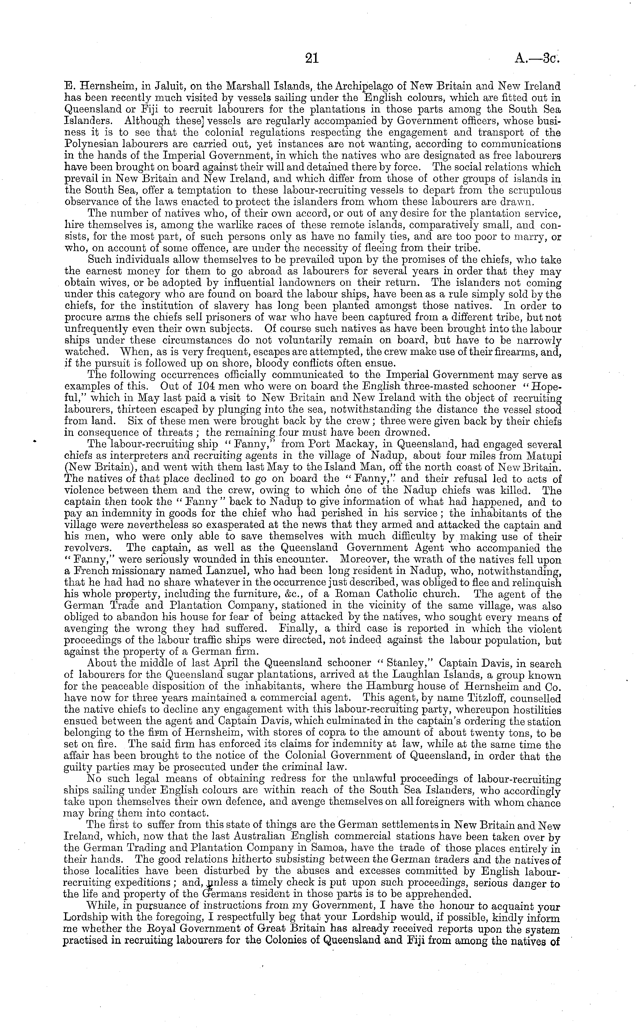 E. Hernsheim, in Jaluit, on the Marshall Islands, the Archipelago of New Britain and New Ireland has been recently much visited by vessels sailing under the English colours, which are fitted out in Queensland or Fiji to recruit labourers for the plantations in those parts among the South Sea Islanders. Although these! vessels are regularly accompanied by Government officers, whose business it is to see that the colonial regulations respecting the engagement and transport of the Polynesian labourers are carried out, yet instances are not wanting, according to communications in the hands of the Imperial Government, in which the natives who are designated as free labourers have been brought on board against their will and detained there by force. The social relations which prevail in New Britain and New Ireland, and which differ from those of other groups of islands in the South Sea, offer a temptation to these labour-recruiting vessels to depart from the scrupulous observance of the laws enacted to protect the islanders from whom these labourers are drawn. The number of natives who, of their own accord, or out of any desire for the plantation service, hire themselves is, among the warlike races of these remote islands, comparatively small, and consists, for the most part, of such persons only as have no family ties, and are too poor to marry, or who, on account of some offence, are under the necessity of fleeing from their tribe. Such individuals allow themselves to be prevailed upon by the promises of the chiefs, who take the earnest money for them to go abroad as labourers for several years in order that they may obtain wives, or be adopted by influential landowners on their return. The islanders not coming under this category who are found on board the labour ships, have been as a rule simply sold by the chiefs, for the institution of slavery has long been planted amongst those natives. In order to procure arms the chiefs sell prisoners of war who have been captured from a different tribe, but not unfrequently even their own subjects. Of course such natives as have been brought into the labour ships under these circumstances do not voluntarily remain on board, but have to be narrowly watched. When, as is very frequent, escapes are attempted, the crew make use of their firearms, and, if the pursuit is followed up on shore, bloody conflicts often ensue. The following occurrences officially communicated to the Imperial Government may serve as examples of this. Out of 104 men who were on board the English three-masted schooner " Hopeful," which in May last paid a visit to New Britain and New Ireland with the object of recruiting labourers, thirteen escaped by plunging into the sea, notwithstanding the distance the vessel stood from land. Six of these men were brought back by the crew; three were given back by their chiefs in consequence of threats ; the remaining four must have been drowned. The labour-recruiting ship " Fanny," from Port Mackay, in Queensland, had engaged several chiefs as interpreters and recruiting agents in the village of Nadup, about four miles from. Matupi (New Britain), and went with them last May to the Island Man, off the north coast of New Britain. The natives of that place declined to go on board the " Fanny,'.' and their refusal led to acts of violence between them and the crew, owing to which one of the Nadup chiefs was killed. The captain then took the " Fanny " back to Nadup to give information of what had happened, and to pay an indemnity in goods for the chief who had perished in his service; the inhabitants of the village were nevertheless so exasperated at the news that they armed and attacked the captain and his men, who were only able to save themselves with much difficulty by making use of their revolvers. The captain, as well as the Queensland Government Agent who accompanied the " Fanny," were seriously wounded in this encounter. Moreover, the wrath of the natives fell upon a French missionary named Lanzuel, who had been long resident in Nadup, who, notwithstanding, that he had had no share whatever in the occurrence just described, was obliged to flee and relinquish his whole property, including the furniture, &c, of a Eoman Catholic church. The agent of the German Trade and Plantation Company, stationed in the vicinity of the same village, was also obliged to abandon his house for fear of being attacked by the natives, who sought every means of avenging the wrong they had suffered. Finally, a third case is reported in which the violent proceedings of the labour traffic ships were directed, not indeed against the labour population, but against the property of a German firm. About the middle of last April the Queensland schooner " Stanley," Captain Davis, in search of labourers for the Queensland sugar plantations, arrived at the Laughlan Islands, a group known for the peaceable disposition of the inhabitants, where the Hamburg house of Hernsheim and Co. have now for three years maintained a commercial agent. This agent, by name Titzloff, counselled the native chiefs to decline any engagement with this labour-recruiting party, whereupon hostilities ensued between the agent and Captain Davis, which culminated in the captain's ordering the station belonging to the fir-m of Hernsheim, with stores of copra to the amount of about twenty tons, to be set on fire. The said firm has enforced its claims for indemnity at law, while at the same time the affair has been brought to the notice of the Colonial Government of Queensland, in order that the guilty parties may be prosecuted under the criminal law. No such legal means of obtaining redress for the unlawful proceedings of labour-recruiting ships sailing under English colours are within reach of the South Sea Islanders, who accordingly take upon themselves their own defence, and avenge themselves on all foreigners with whom chance may bring them into contact. The first to suffer from this state of things are 