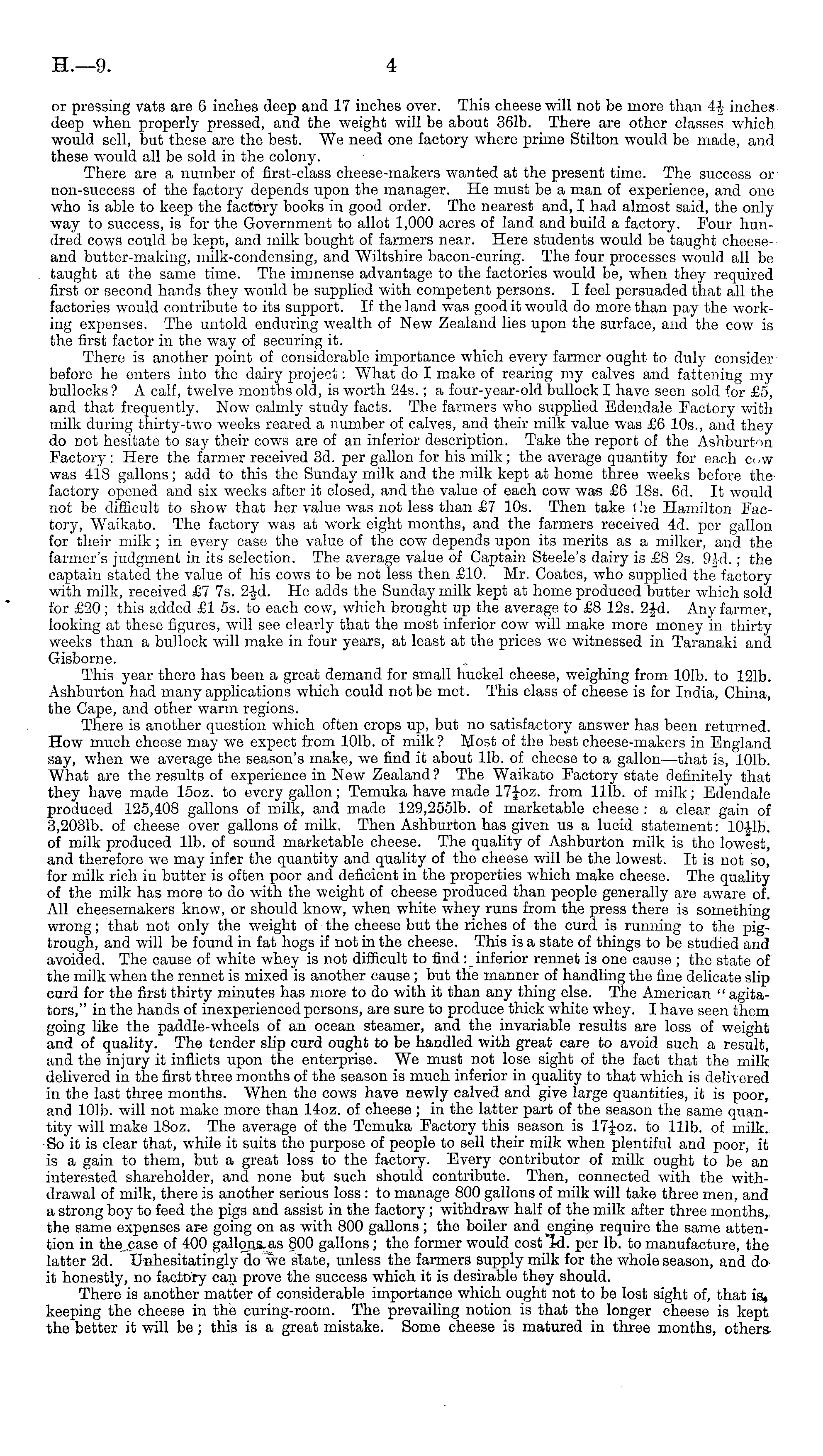or pressing vats are 6 inches deep and 17 inches over. This cheese will not be more than 4|- inches deep when properly pressed, and the weight will be about 361b. There are other classes which would sell, but these are the best. We need one factory where prime Stilton would be made, and these would all be sold in the colony. There are a number of first-class cheese-makers wanted at the present time. The success or non-success of the factory depends upon the manager. He must be a man of experience, and one who is able to keep the factory books in good order. The nearest and, I had almost said, the only way to success, is for the Government to allot 1,000 acres of land and build a factory. Four hundred cows could be kept, and milk bought of farmers near. Here students would be taught cheeseand butter-making, milk-condensing, and Wiltshire bacon-curing. The four processes would all be taught at the same time. The immense advantage to the factories would be, when they required first or second hands they would be supplied with competent persons. I feel persuaded that all the factories would contribute to its support. If the land was good it would do more than pay the working expenses. The untold enduring wealth of New Zealand lies upon the surface, and the cow is the first factor in the way of securing it. There is another point of considerable importance which every farmer ought to duly consider before he enters into the dairy project: What do I make of rearing my calves and fattening my bullocks ? A calf, twelve months old, is worth 245.; a four-year-old bullock I have seen sold for £5, and that frequently. Now calmly study facts. The farmers who supplied Bdendale Factory with milk during thirty-two weeks reared a number of calves, and their milk value was £6 10s., and they do not hesitate to say their cows are of an inferior description. Take the report of the Ashburton Factory: Here the farmer received 3d. per gallon for his milk; the average quantity for each Ci.w was 418 gallons; add to this the Sunday milk and the milk kept at home three weeks before thefactory opened and six weeks after it closed, and the value of each cow was £6 18s. 6d. It would not be difficult to show that her value was not less than £7 10s. Then take 1 lie Hamilton Factory, Waikato. The factory was at work eight months, and the farmers received 4d. per gallon for their milk ; in every case the value of the cow depends upon its merits as a milker, and the farmer's judgment in its selection. The average value of Captain Steele's dairy is £8 2s. 9id.; the captain stated the value of his cows to be not less then £10. Mr. Coates, who supplied the factory with milk, received £7 7s. 2-|d. He adds the Sunday milk kept at home produced butter which sold for £20; this added £1 ss. to each cow, which brought up the average to £8 12s. 2|-d. Any farmer, looking at these figures, will see clearly that the most inferior cow will make more money in thirty weeks than a bullock will make in four years, at least at the prices we witnessed in Taranaki and Gisborne. This year there has been a great demand for small huckel cheese, weighing from 101b. to 121b. Ashburton had many applications which could not be met. This class of cheese is for India, China, the Cape, and other warm regions. There is another question which often crops up, but no satisfactory answer has been returned. How much cheese may we expect from 101b. of milk? Most of the best cheese-makers in England say, when we average the season's make, we find it about lib. of cheese to a gallon—that is, 101b. What are the results of experience in New Zealand ? The Waikato Factory state definitely that they have made 15oz. to every gallon; Temuka have made 17Joz. from 111b. of milk; Bdendale produced 125,408 gallons of milk, and made 129,2551b. of marketable cheese : a clear gain of 3,2031b. of cheese over gallons of milk. Then Ashburton has given us a lucid statement: lOJlb. of milk produced lib. of sound marketable cheese. The quality of Ashburton milk is the lowest, and therefore we may infer the quantity and quality of the cheese will be the lowest. It is not so, for milk rich in butter is often poor and deficient in the properties which make cheese. The quality of the milk has more to do with the weight of cheese produced than people generally are aware of. All cheesemakers know, or should know, when white whey runs from the press there is something wrong; that not only the weight of the cheese but the riches of the curd is running to the pigtrough, and will be found in fat hogs if not in the cheese. This is a state of things to be studied and avoided. The cause of white whey is not difficult to find: inferior rennet is one cause ; the state of the milk when the rennet is mixed is another cause ; but the manner of handling the fine delicate slip curd for the first thirty minutes has more to do with it than any thing else. The American " agitators," in the hands of inexperienced persons, are sure to produce thick white whey. I have seen them going like the paddle-wheels of an ocean steamer, and the invariable results are loss of weight and of quality. The tender slip curd ought to be handled with great care to avoid such a result, and the injury it inflicts upon the enterprise. We must not lose sight of the fact that the milk delivered in the first three months of the season is much inferior in quality to that which is delivered in the last three months. When the cows have newly calved and give large quantities, it is poor, and 101b. will not make more than 14oz. of cheese ; in the latter part of the season the same quantity will make 18oz. The average of the Temuka Factory this season is 17Joz. to 111b. of milk. So it is clear that, while it suits the purpose of people to sell their milk when plentiful and poor, it is a gain to them, but a great loss to the factory. Every contributor of milk ought to be an interested shareholder, and none but such should contr