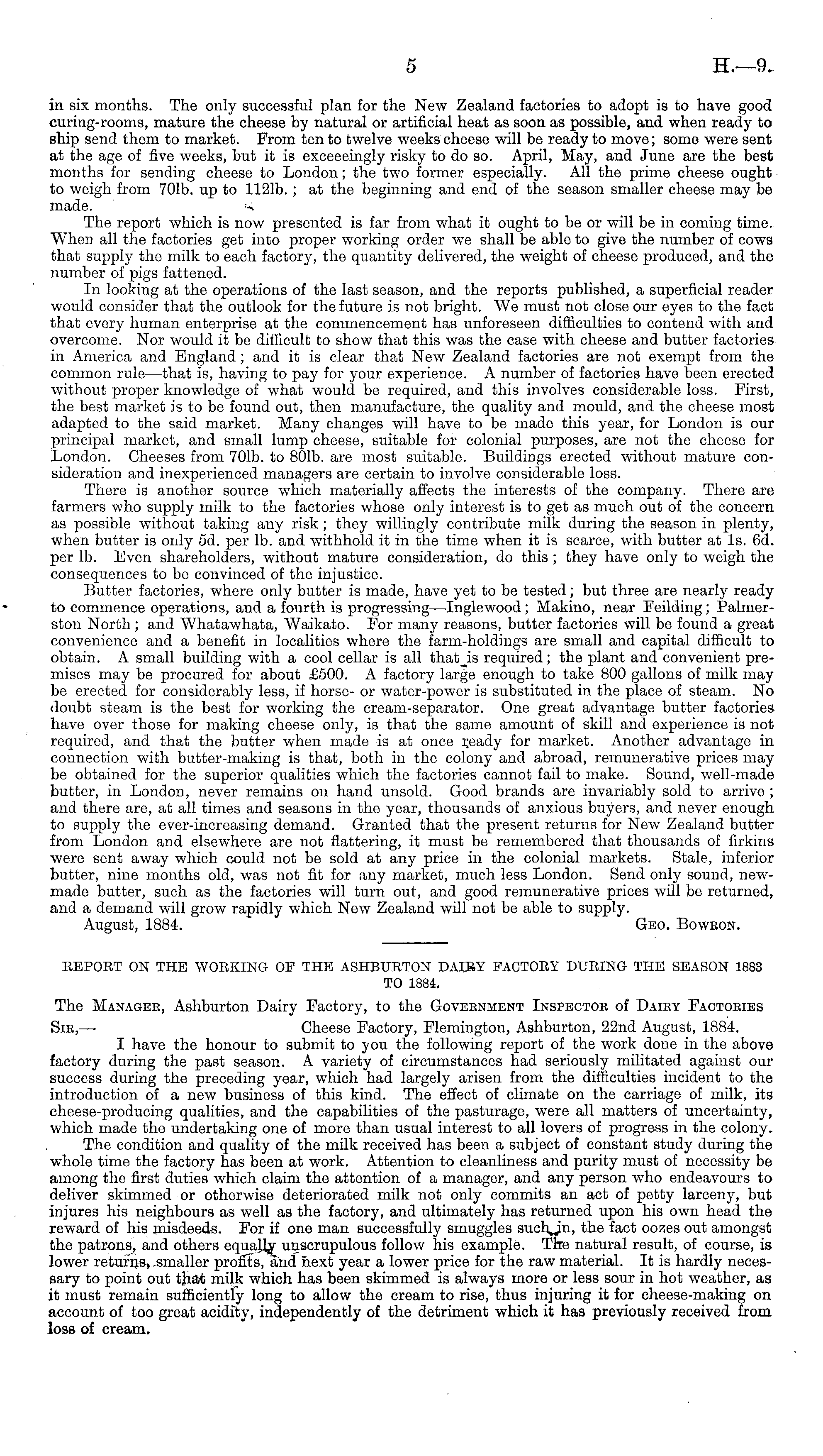 REPORT ON THE WORKING OF THE ASHBURTON DAIRY FACTORY DURING THE SEASON 1883 TO 1884. The Manages, Ashburton Dairy Factory, to the Goveenment Inspectok of Dairy Factories Sir, — Cheese Factory, Flemington, Ashburton, 22nd August, 1884. I have the honour to submit to you the following report of the work done in the above factory during the past season. A variety of circumstances had seriously militated against our success during the preceding year, which had largely arisen from the difficulties incident to the introduction of a new business of this kind. The effect of climate on the carriage of milk, its cheese-producing qualities, and the capabilities of the pasturage, were all matters of uncertainty, which made the undertaking one of more than usual interest to all lovers of progress in the colony. The condition and quality of the milk received has been a subject of constant study during the whole time the factory has been at work. Attention to cleanliness and purity must of necessity be among the first duties which claim the attention of a manager, and any person who endeavours to deliver skimmed or otherwise deteriorated milk not only commits an act of petty larceny, but injures his neighbours as well as the factory, and ultimately has returned upon his own head the reward of his misdeeds. For if one man successfully smuggles suchjn, the fact oozes out amongst the patrons, and others equally unscrupulous follow his example. The natural result, of course, is lower returns, smaller profits, and next year a lower price for the raw material. It is hardly necessary to point out that milk which has been skimmed is always more or less sour in hot weather, as it must remain sufficiently long to allow the cream to rise, thus injuring it for cheese-making on account of too great acidity, independently of the detriment which it has previously received from loss of cream.