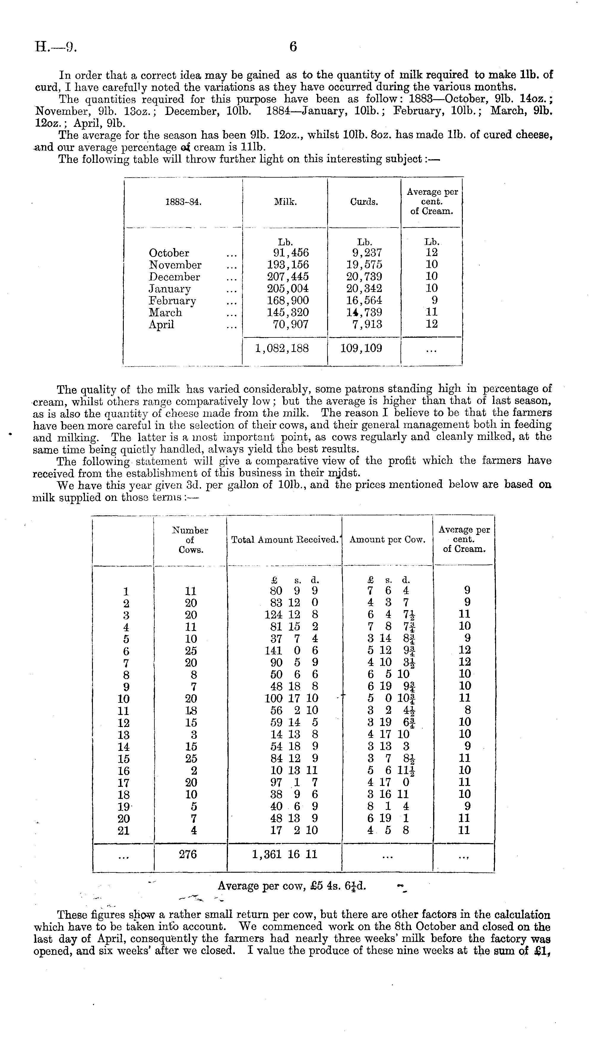 In order that a correct idea may be gained as to the quantity of milk required to make lib. of curd, I have carefully noted the variations as they have occurred during the various months. The quantities required for this purpose have been as follow: 1883—October, 91b. 140z.; November, 91b. 130z.; December, 101b. 1884 —January, 101b.; February, 101b.; March, 91b. 120z.; April, 91b. The average for the season has been 91b. 120z., whilst 101b. Boz. has made lib. of cured cheese, and our average percentage of cream is 111b. The following table will throw further light on this interesting subject:—