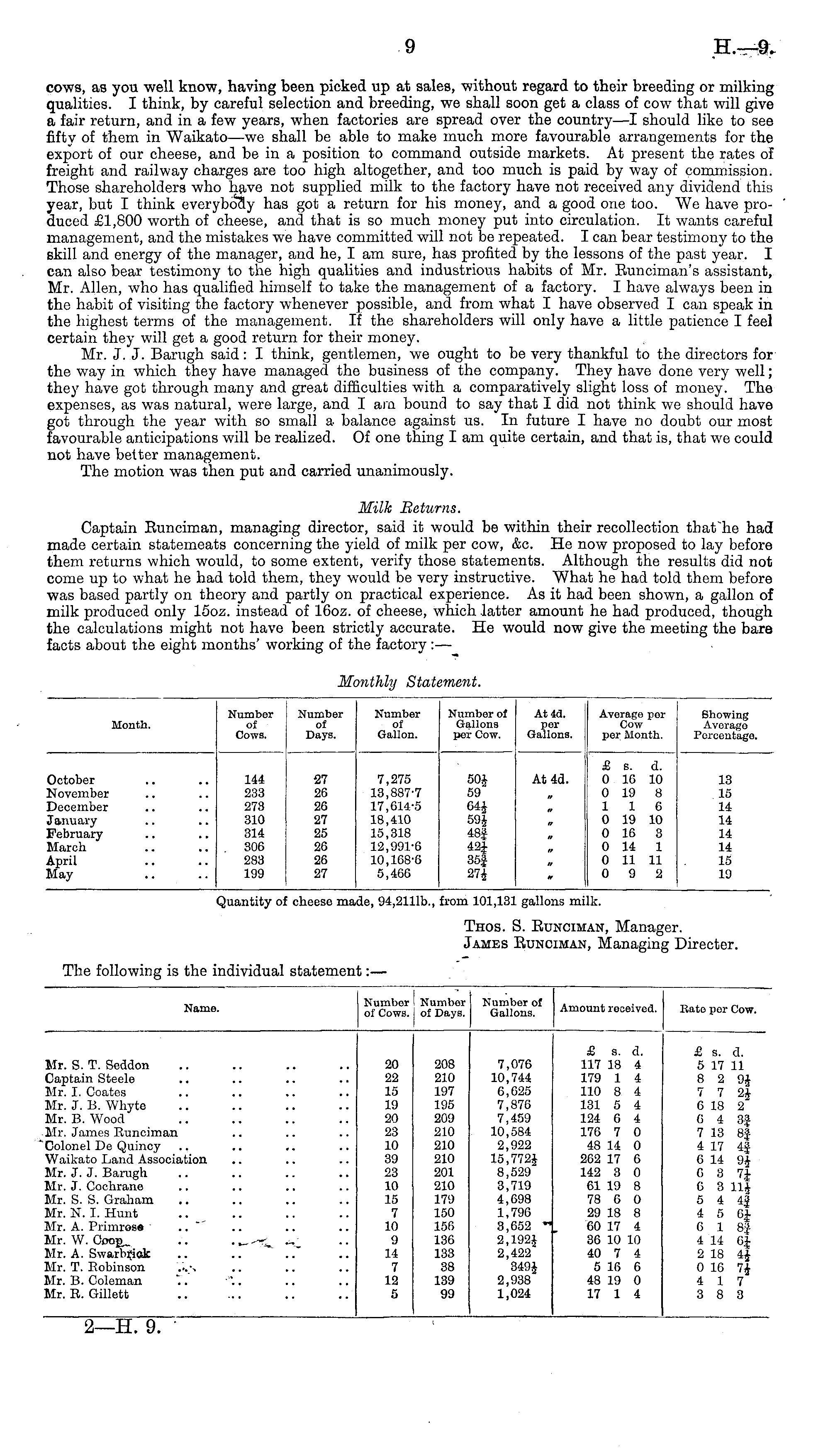 cows, as you well know, having been picked up at sales, without regard to their breeding or milking qualities. I think, by careful selection and breeding, we shall soon get a class of cow that will give a fair return, and in a few years, when factories are spread over the country—I should like to see fifty of them in Waikato—we shall be able to make much more favourable arrangements for the export of our cheese, and be in a position to command outside markets. At present the rates of freight and railway charges are too high altogether, and too much is paid by way of commission. Those shareholders who have not supplied milk to the factory have not received any dividend this year, but I think everybody has got a return for his money, and a good one too. We have produced £1,800 worth of cheese, and that is so much money put into circulation. It wants careful management, and the mistakes we have committed will not be repeated. I can bear testimony to the skill and energy of the manager, and he, lam sure, has profited by the lessons of the past year. I can also bear testimony to the high qualities and industrious habits of Mr. Eunciman's assistant, Mr. Allen, who has qualified himself to take the management of a factory. I have always been in the habit of visiting the factory whenever possible, and from what I have observed I can speak in the highest terms of the management. If the shareholders will only have a little patience I feel certain they will get a good return for their money. Mr. J. J. Barugh said: I think, gentlemen, we ought to be very thankful to the directors for the way in which they have managed the business of the company. They have done very well; they have got through many and great difficulties with a comparatively slight loss of money. The expenses, as was natural, were large, and I am bound to say that I did not think we should have got through the year with so small a balance against us. In future I have no doubt our most favourable anticipations will be realized. Of one thing lam quite certain, and that is, that we could not have better management. The motion was then put and carried unanimously. Milk Beturns. Captain Eunciman, managing director, said it would be within their recollection that he had made certain statemeats concerning the yield of milk per cow, &c. He now proposed to lay before them returns which would, to some extent, verify those statements. Although the results did not come up to what he had told them, they would be very instructive. "What he had told them before was based partly on theory and partly on practical experience. As it had been shown, a gallon of milk produced only 15oz. instead of 16oz. of cheese, which latter amount he had produced, though the calculations might not have been strictly accurate. He would now give the meeting the bare facts about the eight months' working of the factory:—
