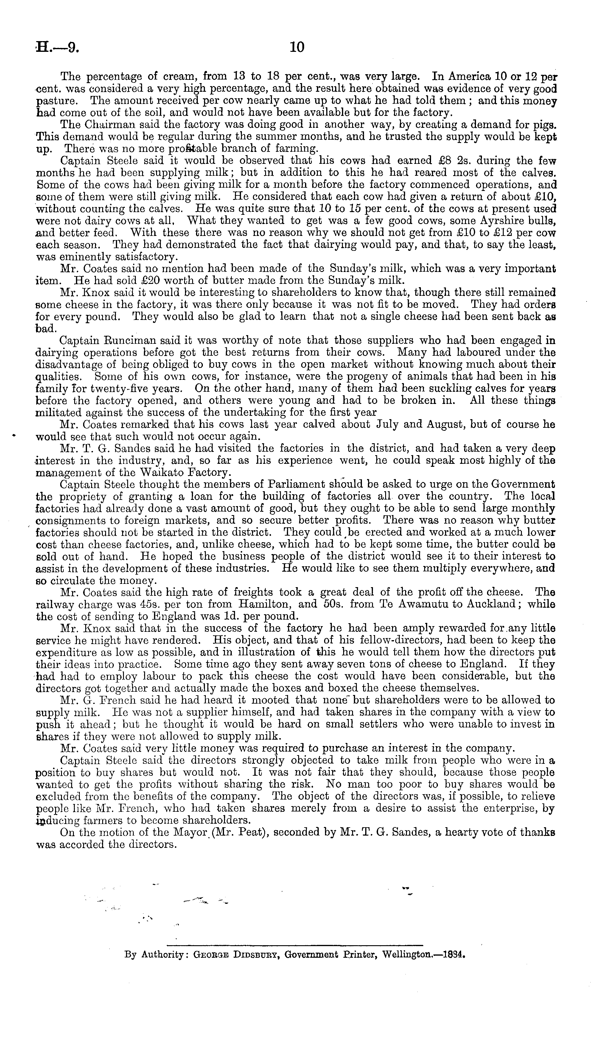 The percentage of cream, from 13 to 18 per cent., was very large. In America 10 or 12 per cent, was considered a very high percentage, and the result here obtained was evidence of very good pasture. The amount received per cow nearly came up to what he had told them ; and this money had come out of the soil, and would not have been available but for the factory. The Chairman said the factory was doing good in another way, by creating a demand for pigs. This demand would be regular during the summer months, and he trusted the supply would be kept up. There was no more profitable branch of farming. Captain Steele said it would be observed that his cows had earned £8 2s. during the few months he had been supplying milk; but in addition to this he had reared most of the calves. Some of the cows had been giving milk for a month before the factory commenced operations, and some of them were still giving milk. He considered that each cow had given a return of about £10, without counting the calves. He was quite sure that 10 to 15 per cent, of the cows at present used were not dairy cows at all, What they wanted to get was a few good cows, some Ayrshire bulls, and better feed. With these there was no reason why we should not get from £10 to £12 per cow each season. They had demonstrated the fact that dairying would pay, and that, to say the least, was eminently satisfactory. Mr. Coates said no mention had been made of the Sunday's milk, which was a very important item. He had sold £20 worth of butter made from the Sunday's milk. Mr. Knox said it would be interesting to shareholders to know that, though there still remained some cheese in the factory, it was there only because it was not fit to be moved. They had orders for every pound. They would also be glad to learn that not a single cheese had been sent back as bad. Captain Eunciman said it was worthy of note that those suppliers who had been engaged in dairying operations before got the best returns from their cows. Many had laboured under the disadvantage of being obliged to buy cows in the open market without knowing much about their qualities. Some of his own cows, for instance, were the progeny of animals that had been in his family Tor twenty-five years. On the other hand, many of them had been suckling calves for years before the factory opened, and others were young and had to be broken in. All these things militated against the success of the undertaking for the first year Mr. Coates remarked that his cows last year calved about July and August, but of course he would see that such would not occur again. Mr. T. G. Sandes said he had visited the factories in the district, and had taken a very deep interest in the industry, and, so far as his experience went, he could speak most highly of the management of the Waikato Factory. Captain Steele thought the members of Parliament should be asked to urge on the Government the propriety of granting a loan for the building of factories all over the country. The local factories had already done a vast amount of good, but they ought to be able to send large monthly consignments to foreign markets, and so secure better profits. There was no reason why butter factories should not be started in the district. They could be erected and worked at a much lower cost than cheese factories, and, unlike cheese, which had to be kept some time, the butter could be Bold out of hand. He hoped the business people of the district would see it to their interest to assist in the development of these industries. He would like to see them multiply everywhere, and bo circulate the money. Mr. Coates said the high rate of freights took a great deal of the profit off the cheese. The railway charge was 455. per ton from Hamilton, and 50s. from Te Awamutu to Auckland; while the cost of sending to England was Id. per pound. Mr. Knox said that in the success of the factory he had been amply rewarded for any little service he might have rendered. His object, and that of his fellow-directors, had been to keep the expenditure as low as possible, and in illustration of this he would tell them how the directors put their ideas into practice. Some time ago they sent away seven tons of cheese to England. If they had had to employ labour to pack this cheese the cost would have been considerable, but the directors got together and actually made the boxes and boxed the cheese themselves. Mr. G. French said he had heard it mooted that none but shareholders were to be allowed to supply milk. He was not a supplier himself, and had taken shares in the company with a view to push it ahead; but he thought it would be hard on small settlers who were unable to invest in shares if they were not allowed to supply milk. Mr. Coates said very little money was required to purchase an interest in the company. Captain Steele said the directors strongly objected to take milk from people who were in a position to buy shares but would not. It was not fair that they should, because those people wanted to get the profits without sharing the risk. No man too poor to buy shares would be excluded from the benefits of the company. The object of the directors was, if possible, to relieve people like Mr. French, who had taken shares merely from a desire to assist the enterprise, by inducing farmers to become shareholders. On the motion of the Mayor (Mr. Peat), seconded by Mr. T. G. Sandes, a hearty vote of thanks was accorded the directors.