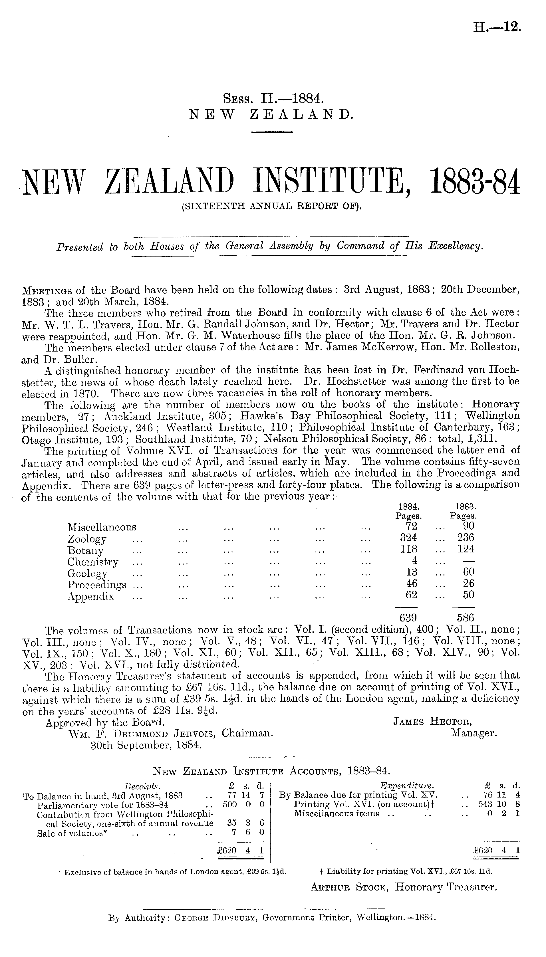 NEW ZEALAND INSTITUTE, 1883-84 (SIXTEENTH ANNUAL REPORT OF).