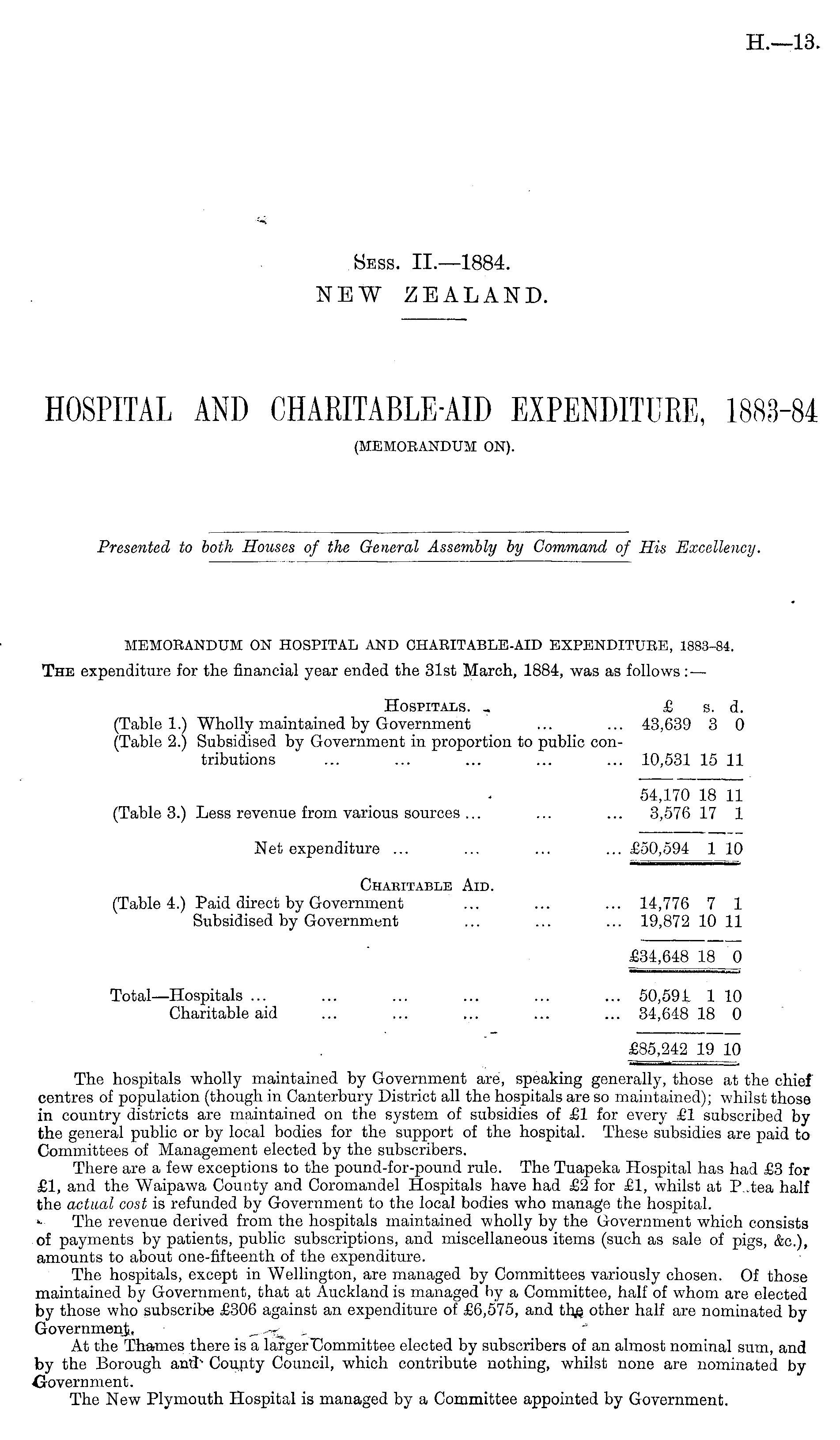 MEMORANDUM ON HOSPITAL AND CHARITABLE-AID EXPENDITURE, 1883-84. The expenditure for the financial year ended the 31st March, 1884, was as follows :— > Hospitals. _ £ s. d. (Table 1.) Wholly maintained by Government ... ... 43,639 3 0 (Table 2.) Subsidised by Government in proportion to public contributions ... ... ... ... ... 10,531 15 11 54,170 18 11 (Table 3.) Less revenue from various sources ... ... ... 3,576 17 1 Net expenditure ... ... ... ... £50,594 1 10 Chaeitable Aid. (Table 4.) Paid direct by Government ... ... ... 14,776 7 1 Subsidised by Government ... ... ... 19,872 10 11 £34,648 18 0 Total—Hospitals ... ... ... ... ... ... 50,591 1 10 Charitable aid ... ... ... ... ... 34,648 18 0 £85,242 19 10 The hospitals wholly maintained by Government are, speaking generally, those at the chief centres of population (though in Canterbury District all the hospitals are so maintained); whilst those in country districts are maintained on the system of subsidies of £1 for every £1 subscribed by the general public or by local bodies for the support of the hospital. These subsidies are paid to Committees of Management elected by the subscribers. There are a few exceptions to the pound-for-pound rule. The Tuapeka Hospital has had £3 for £1, and the Waipawa County and Coromandel Hospitals have had £2 for £1, whilst at P..tea half the actual cost is refunded by Government to the local bodies who manage the hospital. The revenue derived from the hospitals maintained wholly by the Government which consists of payments by patients, public subscriptions, and miscellaneous items (such as sale of pigs, &c), amounts to about one-fifteenth of the expenditure. The hospitals, except in Wellington, are managed by Committees variously chosen. Of those maintained by Government, that at Auckland is managed by a Committee, half of whom are elected by those who subscribe £306 against an expenditure of £6,575, and the other half are nominated by Government. At the Thames there is a larger "Committee elected by subscribers of an almost nominal sum, and by the Borough and' County Council, which contribute nothing, whilst none are nominated by Government. The New Plymouth Hospital is managed by a Committee appointed by Government.