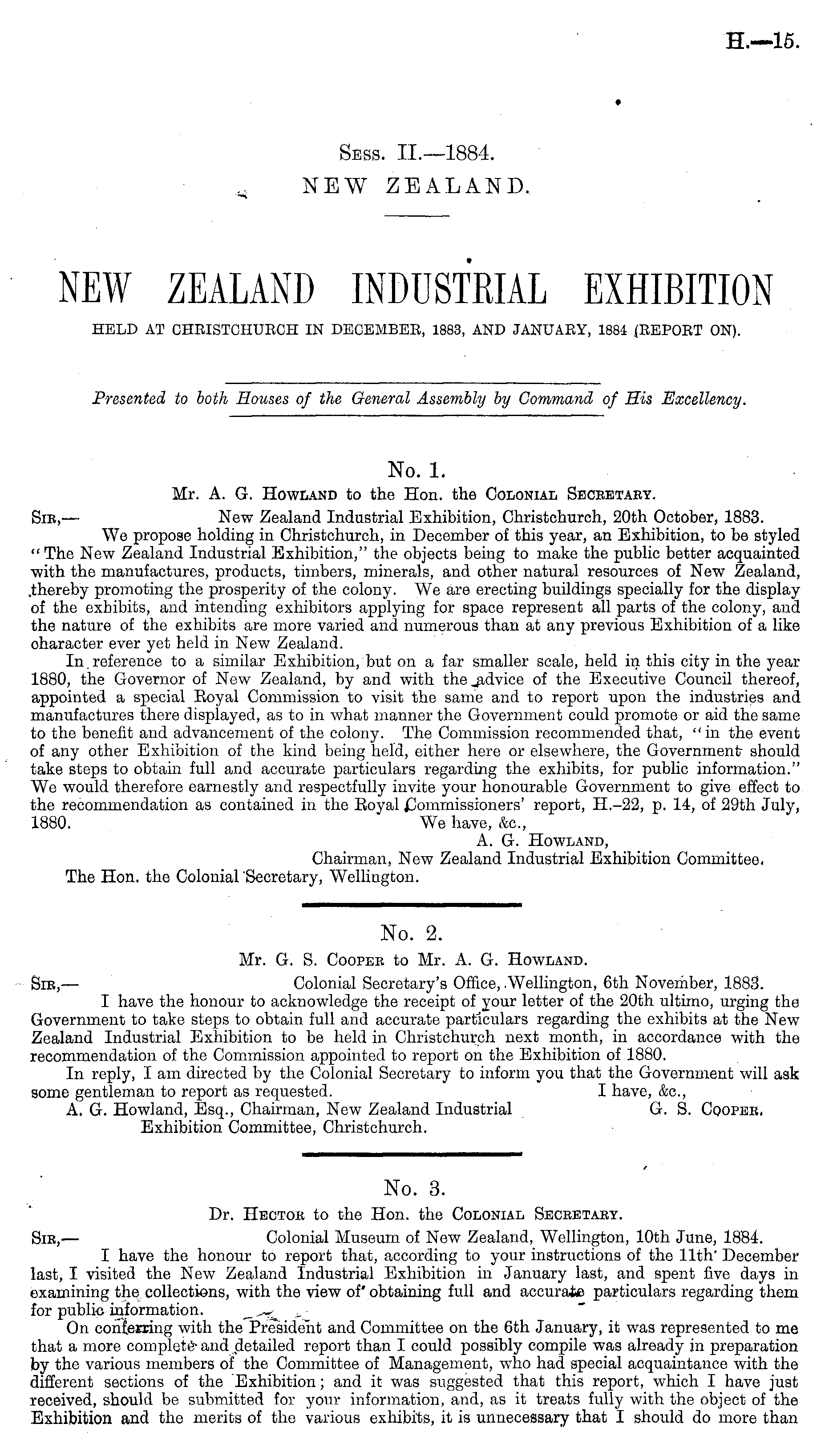 No. 1. Mr. A. G. Howland to the Hon. the Colonial Seceetaey. Sic, — New Zealand Industrial Exhibition, Christchurch, 20th October, 1883. We propose holding in Christchurch, in December of this year, an Exhibition, to be styled "The Now Zealand Industrial Exhibition," the objects being to make the public better acquainted with the manufactures, products, timbers, minerals, and other natural resources of New Zealand, .thereby promoting the prosperity of the colony. We are erecting buildings specially for the display of the exhibits, and intending exhibitors applying for space represent all parts of the colony, and the nature of the exhibits are more varied and numerous than at any previous Exhibition of a like oharacter ever yet held in New Zealand. In.reference to a similar Exhibition, but on a far smaller scale, held in this city in the year 1880, the Governor of New Zealand, by and with the .advice of the Executive Council thereof, appointed a special Boyal Commission to visit the same and to report upon the industries and manufactures there displayed, as to in what manner the Government could promote or aid the same to the benefit and advancement of the colony. The Commission recommended that, "in the event of any other Exhibition of the kind being held, either here or elsewhere, the Government should take steps to obtain full and accurate particulars regarding the exhibits, for public information." We would therefore earnestly and respectfully invite your honourable Government to give effect to the recommendation as contained in the Boyal Commissioners' report, H.-22, p. 14, of 29th July, 1880. We have, &c, A. G. Howland, Chairman, New Zealand Industrial Exhibition Committee. The Hon. the Colonial Secretary, Wellington.