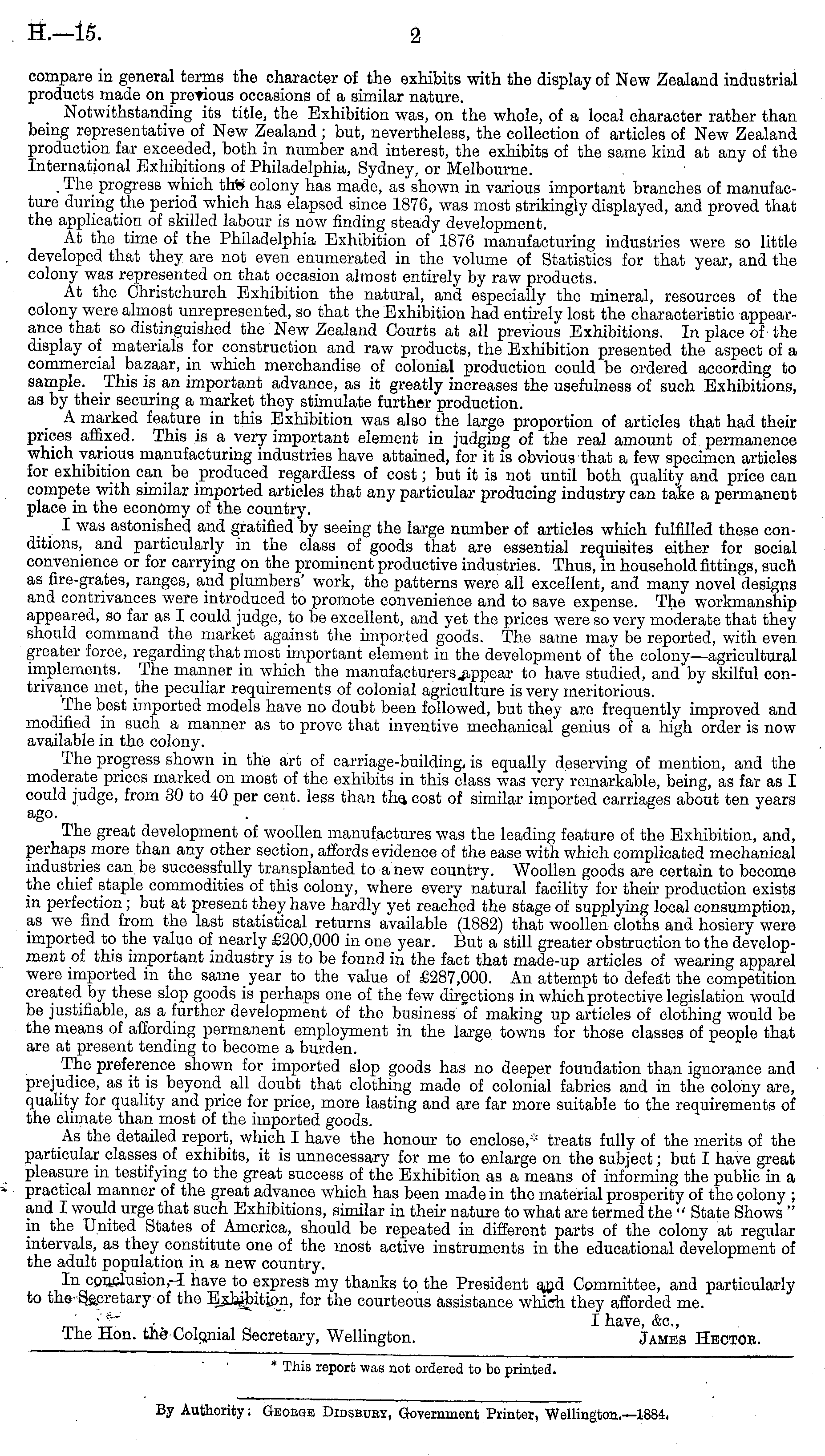 compare in general terms the character of the exhibits with the display of New Zealand industrial products made on previous occasions of a similar nature. Notwithstanding its title, the Exhibition was, on the whole, of a local character rather than being representative of New Zealand ; but, nevertheless, the collection of articles of New Zealand production far exceeded, both in number and interest, the exhibits of the same kind at any of the International Exhibitions of Philadelphia, Sydney, or Melbourne. . The progress which th» colony has made, as shown in various important branches of manufacture during the period which has elapsed since 1876, was most strikingly displayed, and proved that the application of skilled labour is now finding steady development. At the time of the Philadelphia Exhibition of 1876 manufacturing industries were so little developed that they are not even enumerated in the volume of Statistics for that year, and the colony was represented on that occasion almost entirely by raw products. At the Christchurch Exhibition the natural, and especially the mineral, resources of the colony were almost unrepresented, so that the Exhibition had entirely lost the characteristic appearance that so distinguished the New Zealand Courts at all previous Exhibitions. In place of' the display of materials for construction and raw products, the Exhibition presented the aspect of a commercial bazaar, in which merchandise of colonial production could be ordered according to sample. This is an important advance, as it greatly increases the usefulness of such Exhibitions, as by their securing a market they stimulate further production. A marked feature in this Exhibition was also the large proportion of articles that had their prices affixed. This is a very important element in judging of the real amount of permanence which various manufacturing industries have attained, for it is obvious that a few specimen articles for exhibition can be produced regardless of cost; but it is not until both quality and price can compete with similar imported articles that any particular producing industry can take a permanent place in the economy of the country. I was astonished and gratified by seeing the large number of articles which fulfilled these conditions, and particularly in the class of goods that are essential requisites either for social convenience or for carrying on the prominent productive industries. Thus, in household fittings, such as fire-grates, ranges, and plumbers' work, the patterns were all excellent, and many novel designs and contrivances were introduced to promote convenience and to save expense. The workmanship appeared, so far as I could judge, to be excellent, and yet the prices were so very moderate that they should command the market against the imported goods. The same may be reported, with even greater force, regarding that most important element in the development of the colony—agricultural implements. The manner in which the manufacturers .appear to have studied, and by skilful contrivance met, the peculiar requirements of colonial agriculture is very meritorious. The best imported models have no doubt been followed, but they are frequently improved and modified in such a manner as to prove that inventive mechanical genius of a high order is now available in the colony. The progress shown in the art of carriage-building, is equally deserving of mention, and the moderate prices marked on most of the exhibits in this class was very remarkable, being, as far as I could judge, from 30 to 40 per cent, less than the, cost of similar imported carriages about ten years ago. The great development of woollen manufactures was the leading feature of the Exhibition, and, perhaps more than any other section, affords evidence of the ease with which complicated mechanical industries can be successfully transplanted to a new country. Woollen goods are certain to become the chief staple commodities of this colony, where every natural facility for their production exists in perfection; but at present they have hardly yet reached the stage of supplying local consumption, as we find from the last statistical returns available (1882) that woollen cloths and hosiery were imported to the value of nearly £200,000 in one year. But a still greater obstruction to the development of this important industry is to be found in the fact that made-up articles of wearing apparel were imported in the same year to the value of £287,000. An attempt to defeat the competition created by these slop goods is perhaps one of the few directions in which protective legislation would be justifiable, as a further development of the business of making up articles of clothing would be the means of affording permanent employment in the large towns for those classes of people that are at present tending to become a burden. _ The preference shown for imported slop goods has no deeper foundation than ignorance and prejudice, as it is beyond all doubt that clothing made of colonial fabrics and in the colony are, quality for quality and price for price, more lasting and are far more suitable to the requirements of the climate than most of the imported goods. As the detailed report, which I have the honour to enclose,* treats fully of the merits of the particular classes of exhibits, it is unnecessary for me to enlarge on the subject; but I have great pleasure in testifying to the great success of the Exhibition as a means of informing the public in a practical manner of the great advance which has been made in the material prosperity of the colony ; and I would urge that such Exhibitions, similar in their nature to what are termed the " State Shows " in the United States of America, should be repeated in different parts of the colony at regular intervals, as they constitute one of the most active instruments in the educational development of the adult population in a new country. In conclusion,-1 have to express m