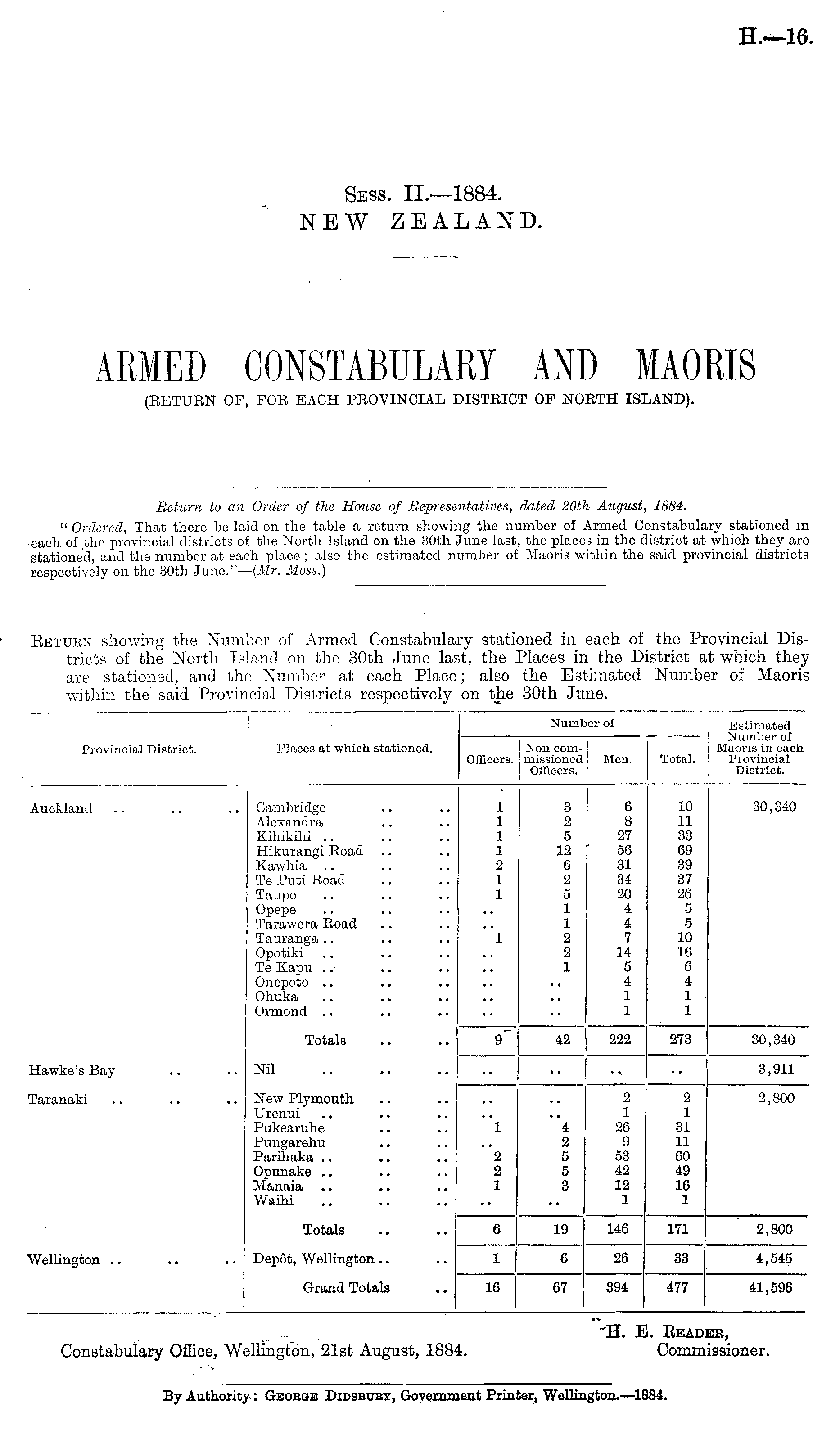 Return to an Order of the House of Representatives, dated 20th August, 1884. " Ordered, That there be laid on the table a return showing the number of Armed Constabulary stationed in each of the provincial districts of the North Island on the 30th June last, the places in the district at which they are stationed, and the number at each place; also the estimated number of Maoris within the said provincial districts respectively on the 30th Juno." — (Mr. Moss.)