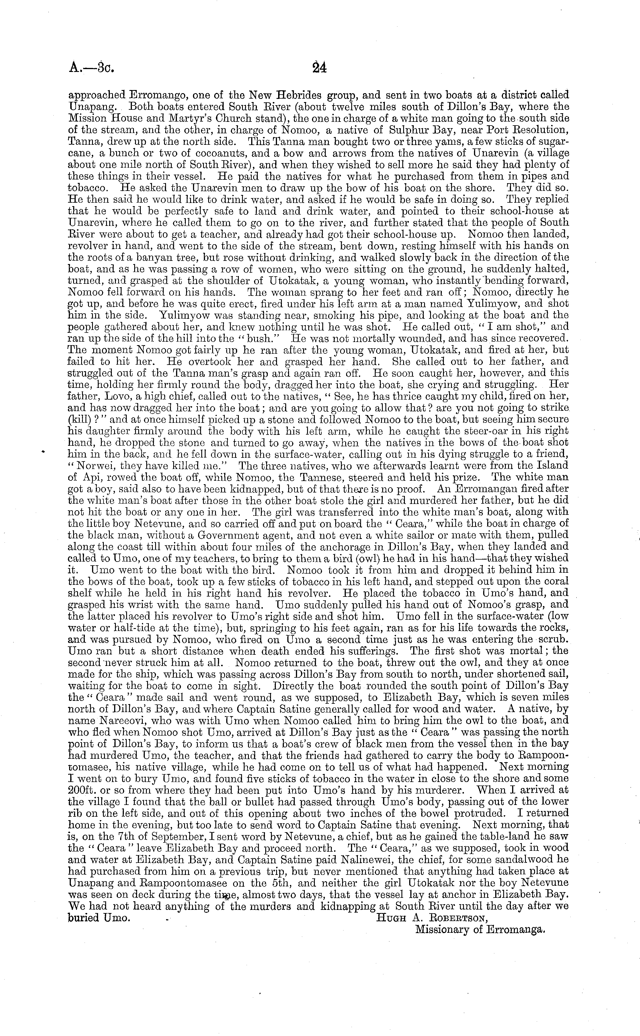 approached Erromango, one of the New Hebrides group, and sent in two boats at a district called Unapang. Both boats entered South Eiver (about twelve miles south of Dillon's Bay, where the Mission House and Martyr's Church stand), the one in charge of a white man going to the south side of the stream, and the other, in charge of Nomoo, a native of Sulphur Bay, near Port Resolution, Tanna, drew up at the north side. This Tanna man bought two or three yams, a few sticks of sugarcane, a bunch or two of cocoanuts, and a bow and arrows from the natives of Unarevin (a village about one mile north of South Eiver), and when they wished to sell more he said they had plenty of these things in their vessel. He paid the natives for what he purchased from them in pipes and tobacco. He asked the Unarevin men to draw up the bow of his boat on the shore. They did so. He then said he would like to drink water, and asked if he would be safe in doing so. They replied that he would be perfectly safe to land and drink water, and pointed to their school-house at Unarevin, where he called them to go on to the river, and further stated that the people of South Eiver were about to get a teacher, and already had got their school-house up. Nomoo then landed, revolver in hand, and went to the side of the stream, bent down, resting himself with his hands on the roots of a banyan tree, but rose without drinking, and walked slowly back in the direction of the boat, and as he was passing a row of women, who were sitting on the ground, he suddenly halted, turned, and grasped at the shoulder of Utokatak, a young woman, who instantly bending forward, Nomoo fell forward on his hands. The woman sprang to her feet and ran off; Nomoo, directly he got up, and before he was quite erect, fired under his left arm at a man named Yulimyow, and shot him in the side. Yulimyow was standing near, smoking his pipe, and looking at the boat and the people gathered about her, and knew nothing until he was shot. He called out, "I am shot," and ran up the side of the hill into the " bush." He was not mortally wounded, and has since recovered. The moment Nomoo got fairly up he ran after the young woman, Utokatak, and fired at her, but failed to hit her. He overtook her and grasped her hand. She called out to her father, and struggled out of the Tanna man's grasp and again ran off. He soon caught her, however, and this time, holding her firmly round the body, dragged her into the boat, she crying and struggling. Her father, Lovo, a high chief, called out to the natives, " See, he has thrice caught my child, fired on her, and has now dragged her into the boat; and are you going to allow that ? are you not going to strike (kill) ? " and at once himself picked up a stone and followed Nomoo to the boat, but seeing him secure his daughter firmly around the body with his left arm, while he caught the sfceer-oar in his right hand, he dropped the stone and turned to go away, when the natives in the bows of the boat shot him in the back, and he fell down in the surface-water, calling out in his dying struggle to a friend, " Norwei, they have killed me." The three natives, who we afterwards learnt were from the Island of Api, rowed the boat off, while Nomoo, the Tannese, steered and held his prize. The white man got a boy, said also to have been kidnapped, but of that there is no proof. An Erromangan fired after the white man's boat after those in the other boat stole the girl and murdered her father, but he did not hit the boat or any one in her. The girl was transferred into the white man's boat, along with the little boy Netevune, and so carried off and put onboard the " Ceara," while the boat in charge of the black man, without a Government agent, and not even a white sailor or mate with them, pulled along the coast till within about four miles of the anchorage in Dillon's Bay, when they landed and called to Umo, one of my teachers, to bring to them a bird (owl) he had in his hand —that they wished it. Umo went to the boat with the bird. Nomoo took it from him and dropped it behind him in the bows of the boat, took up a few sticks of tobacco in his left hand, and stepped out upon the coral shelf while he held in his right hand his revolver. He placed the tobacco in Umo's hand, and grasped his wrist with the same hand. Umo suddenly pulled his hand out of Nomoo's grasp, and the latter placed his revolver to Umo's right side and shot him. Umo fell in the surface-water (low water or half-tide at the time), but, springing to his feet again, ran as for his life towards the rocks, and was pursued by Nomoo, who fired on Umo a second time just as he was entering the scrub. Umo ran but a short distance when death ended his sufferings. The first shot was mortal; the second never struck him at all. Nomoo returned to the boat, threw out the owl, and they at once made for the ship, which was passing across Dillon's Bay from south to north, under shortened sail, waiting for the boat to come in sight. Directly the boat rounded the south point of Dillon's Bay the " Ceara " made sail and went round, as we supposed, to Elizabeth Bay, which is seven miles north of Dillon's Bay, and where Captain Satine generally called for wood and water. A native, by name Nareeovi, who was with Umo when Nomoo called him to bring him the owl to the boat, and who fled when Nomoo shot Umo, arrived at Dillon's Bay just as the " Ceara " was passing the north point of Dillon's Bay, to inform us that a boat's crew of black men from the vessel then in the bay had murdered Umo, the teacher, and that the friends had gathered to carry the body to Bampoontomasee, his native village, while he had come on to tell us of what had happened. Next morning I went on to bury Umo, and found five sticks of tobacco in the water in close to the shore and some 200 ft. or so from where they had been put into Umo's hand by his murderer. When I arrived at the village I found that the ball or bullet had passed t