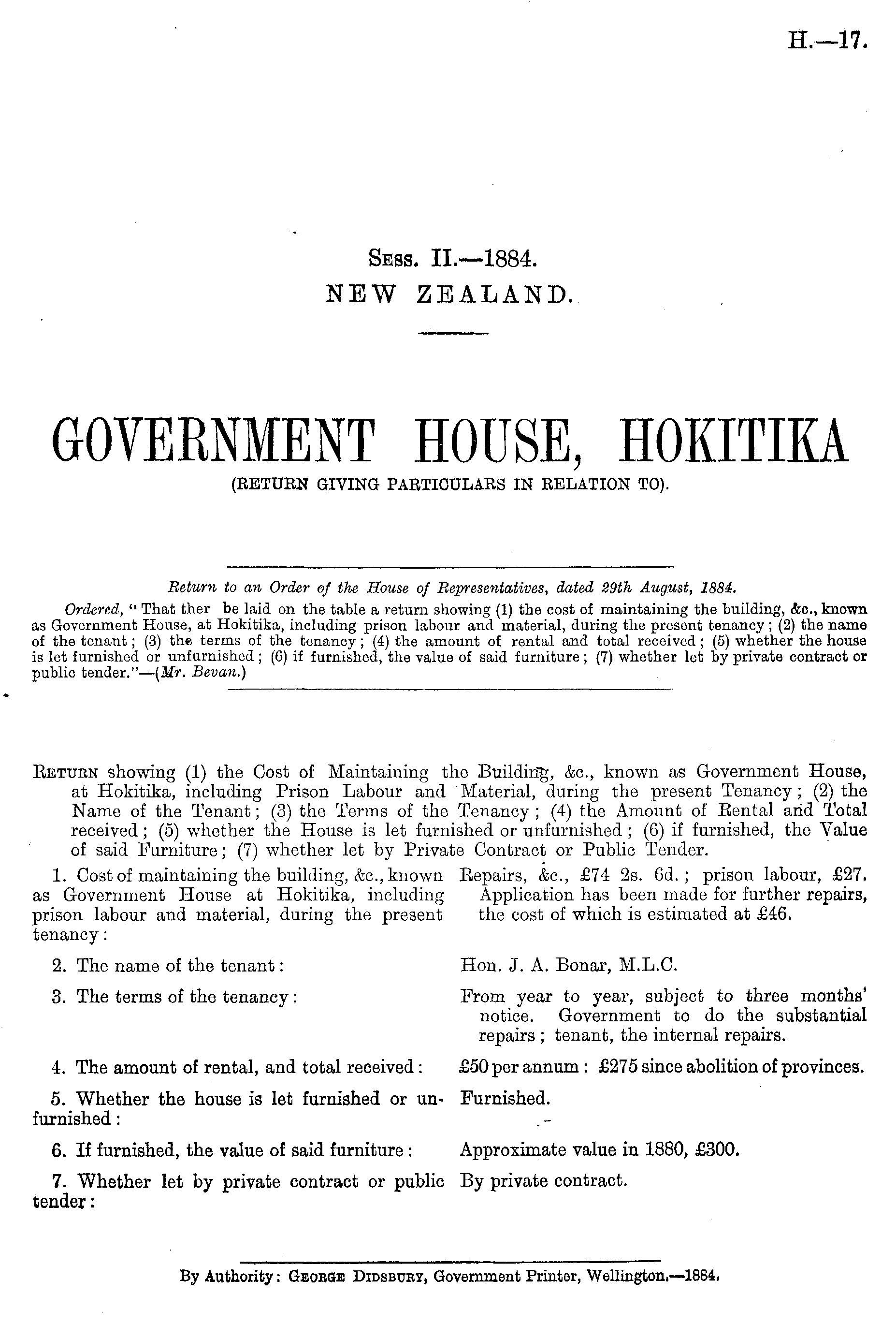 Return to an Order of the House of Representatives, dated 29th August, 1884. Ordered, " That ther be laid on the table a return showing (1) the cost of maintaining the building, &0., known as Government House, at Hokitika, including prison labour and material, during the present tenancy ; (2) the name of the tenant; (3) the terms of the tenancy; (4) the amount of rental and total received ; (5) whether the house is let furnished or unfurnished ; (6) if furnished, the value of said furniture ; (7) whether let by private contract or public tender."— (Mr. Bevan.)