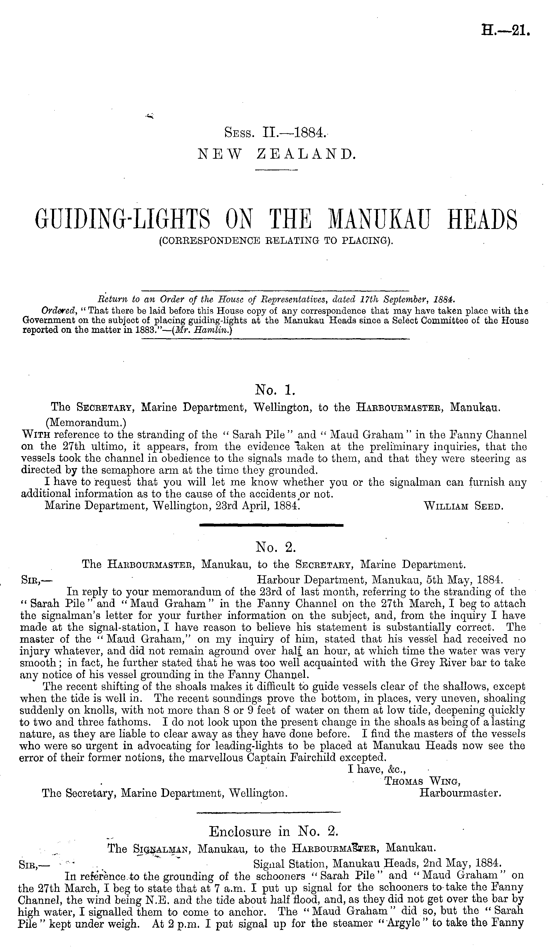 No. 1. The Sbceetaey, Marine Department, Wellington, to the Haeboukmastee, Manukau. (Memorandum.) With reference to the stranding of the " Sarah Pile ". and " Maud Graham " in the Fanny Channel on the 27th ultimo, it appears, from the evidence laken at the preliminary inquiries, that the vessels took the channel in obedience to the signals made to them, and that they wore steering as directed by the semaphore arm at the time they grounded. I have to request that you will let me know whether you or the signalman can furnish any additional information as to the cause of the accidents 4 or not. Marine Department, Wellington, 23rd April, 1884. William Seed.
