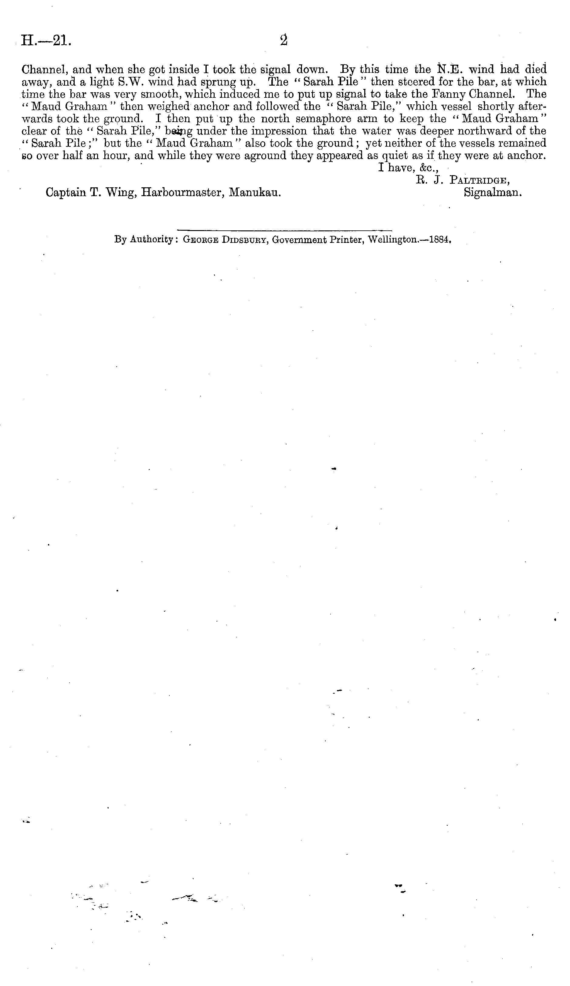Channel, and when she got inside I took the signal down. By this time the N.E. wind had died away, and a light S.W. wind had sprung up. The " Sarah Pile " then steered for the bar, at which time the bar was very smooth, which induced me to put up signal to take the Fanny Channel. The " Maud Graham " then weighed anchor and followed the " Sarah Pile," which vessel shortly afterwards took the ground. I then put up the north semaphore arm to keep the "Maud Graham" clear of the " Sarah Pile," being under the impression that the water was deeper northward of the " Sarah Pile;" but the " Maud Graham " also took the ground; yet neither of the vessels remained so over half an hour, and while they were aground they appeared as quiet as if they were at anchor. I have, &c, E. J. Palteidge, Captain T. Wing, Harbourmaster, Manukau. Signalman.