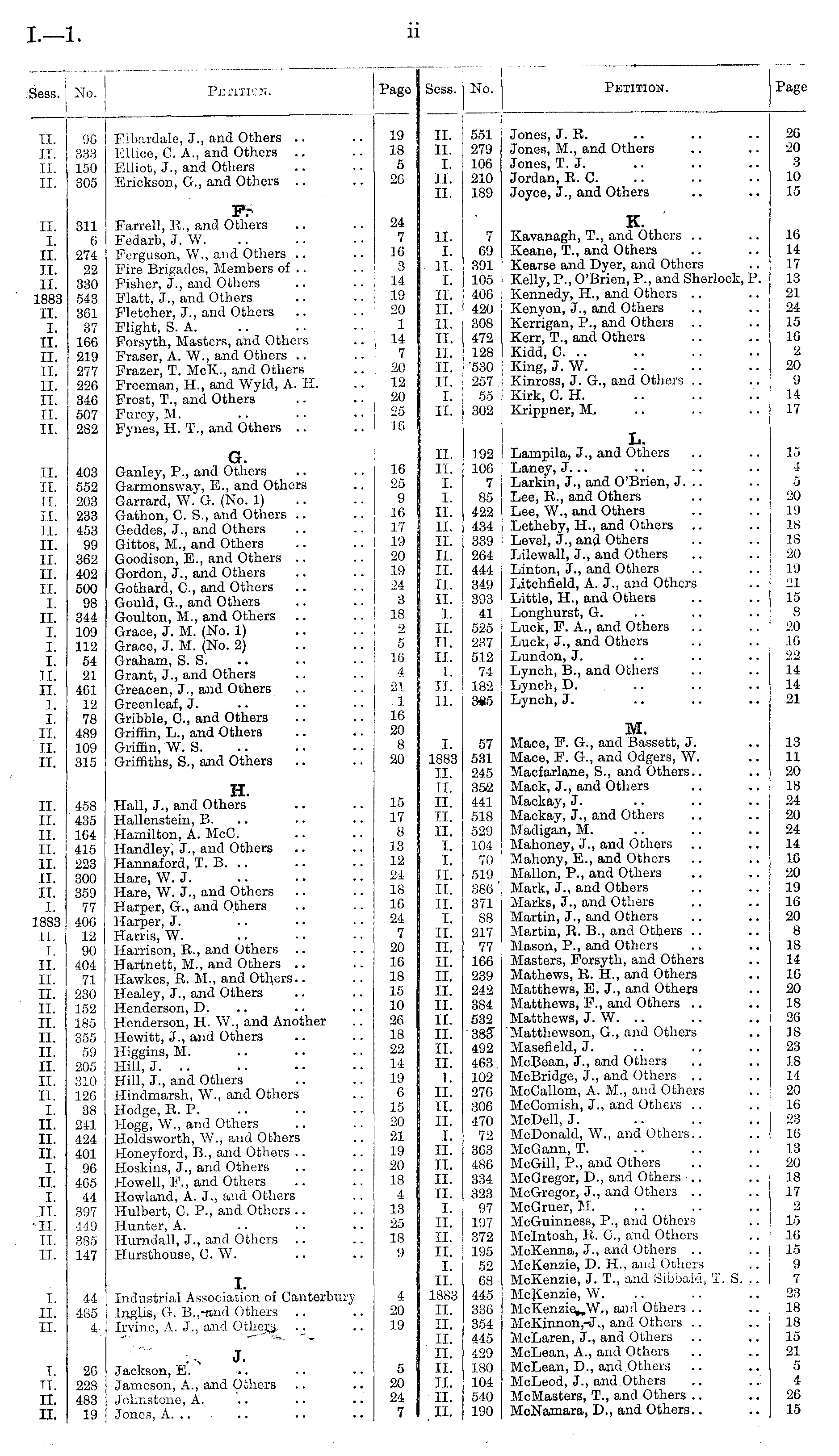 Sess. No. I Peiiticn. I Page Sess. j No. Petition. Page I II. If. II. II. 90 333 150 305 Eibardale, J., and Others Elliee, C. A., and Others Elliot, J., and Others Erickson, G., and Others .. 19 18 5 26 II. II. I. II. II. 551 279 106 210 189 Jones, J. R. Jones, M.| and Others Jones, T. J. Jordan, R. C. Joyce, J., and Others 26 20 3 10 15 II. I. II. II. II. 1883 II. I. II. II. II. II. II. II. II. 311 6 274 22 330 543 301 37 160 219 277 226 346 507 282 P. Farrell, R., and Others Fedarb, J. W. Ferguson, W., and Others Fire Brigades, Members of .. Fisher, J., and Others Flatt, J., and Others Fletcher, J., and Others Plight, S. A. Forsyth, Masters, and Others Eraser, A. W., and Others .. Frazer, T. McK., and Others Freeman, II., and Wyld, A. H. Frost, T., and Others Furey, M. Fynes, H. T., and Others .. 24 7 16 3 14 19 20 1 14 7 20 12 20 25 16 II. I. II. I. II. II. II. II. II. II. II. I. II. 69 391 105 406 420 308 472 128 530 257 55 302 K. Kavanagh, T., and Others Keano, T., and Others Kearse and Dyer, and Others Kelly, P., O'Brien, P., and Sherlock, P. Kennedy, H, and Others Kenyon, J., and Others Kerrigan, P., and Others Kerr, T., and Others Kidd, C. .. King, J. W. Kinross, J. G., and Others Kirk, C. H. Krippner, M. 16 14 17 13 21 24 15 16 2 20 9 14 17 II. II, II. II. n. ii. ii. ii. ii. i. ii. i. i. i. ii. ii. i. i. ii. ii. ri. 403 552 203 233 453 99 362 402 500 98 344 109 112 54 21 461 12 78 489 109 315 G. Ganley, P., and Others Garmonsway, E., and Others Garrard, W. G. (No. 1) Gathon, C. S., and Others Geddes, J., and Others Gittos, _., and Others Goodison, E., and Others .. Gordon, J., and Others Gothard, 0., and Others Gould, G., and Others Goulton, _., ond Others Grace, J. M. (No. 1) Grace, J. M. (No. 2) Graham, S. S. Grant, J., and Others Greacen, J., and Others. Greenleaf, J. Grihble, C, and Others Griffin, L., and Others Griffin, W. S. Griffiths, S., and Others 16 25 9 16 17 19 20 19 24 3 18 2 5 Hi 21 1 16 20 8 20 II. IT. I. I. II. II. II. II. II. II. II. I. II. IT. IT. I. IT. IT. 192 106 7 85 422 434 339 264 444 349 393 41 525 237 512 74 182 325 L. Lampila, J., and Others Laney, J... Larkin, J., and O'Brien, J. .. Lee, R., and Others Lee, W., and Others Letheby, II., and Others Level, J., and Others Lilewall, J., and Others Linton, J., and Others Litchfield, A. J., and Others Little, H, and Others Longhurst, G. Luck, F. A., and Others Luck, J., and Others Lundon, J. Lynch, B., and Others Lynch, D. Lynch, J. 15 4 5 20 19 18 18 20 19 21 15 8 20 16 22 14 14 21 ii. ii. n. ii. ii. ii. ii. i. 1883 tl. I. II. II. II. II. II. II. II. II. II. II. I. II. II. II. I. II. I. II. II. II. IT. 458 435 164 415 223 300 359 77 406 12 90 404 71 230 152 185 355 59 205 310 126 38 241 424 401 96 465 44 397 449 385 147 H. Hall, J., and Others Hallenstein, B. .. Hamilton, A. McC. Handley', J., and Others Hannaford, T. B. .. Hare, W. J. Hare, W. J., and Others Harper, G., and Others Harper, J. Harris, W. Harrison, R., and Others Hartnett, M., and Others llawkes, R. M., and Others.. Healey, J., and Others Henderson, D. Henderson, H. W., and Another Hewitt, J., and Others Higgins, M. Hill, J Hill, J., and Others Hindmarsh, W., and Others Hodge, R. P. Hogg, W., and Others Holdsworth, W., and Others Honeyford, B., and Others Hoskins, J., and Others Howell, F., and Others Howland, A. J., and Others Hulbert, C. P., and Others Hunter, A. Hurndall, J., and Others Hursthouse, C. W. 15 17 8 13 12 24 18 16 24 7 20 16 18 15 10 26 18 22 14 19 6 15 20 21 19 20 18 4 13 25 18 9 I. 1883 II. II. IT. II. II. I. I. IX II. II. I. II. II. II. II. II. II. II. II. II. II. T. II. II. II. I. II. II. II. II. I. II. II. II. I. II. 1883 II. II. II. II. II. II. II. II. 57 531 245 352 441 518 529 104 70 519 386' 371 88 217 77 166 239 242 384 532 383" 492 4.63 102 276 306 470 72 803 486 334 323 97 197 372 1<J5 52 68 445 336 354 445 429 180 104 5-10 190 M. Mace, F. G., and Bassett, J. Mace, F. G., and Odgers, W. Macfarlane, S., and Others.. Mack, J., and Others Mackay, J. Mackay, J., and Others Madigan, M. Mahoney, J., and Others Mahony, E., and Others Mallon, P., and Others Mark, J., and Others Marks, J., and Others Martin, J., and Others Martin, R. B., and Others Mason, P., and Others Masters, Forsyth, and Others Mathews, R. H, and Others Matthews, E. J., and Others Matthews, F., and Others Matthews, J. W. .. Matthowson, G., and Others Masefield, J. McBean, J., and Others MoBridgo, J., and Others McCallom, A. M., and Others McComish, J., and Others McDell, J. McDonald, W., and Others.. McGann, T. McGill, P., and Others McGregor, D., and Others .. McGregor, J., and Others McGruer, M. McGuinness, P., and Others Mcintosh, R. 0., and Others McKonna, J., and Others McKenzie, D. H, and Others McKenzie, J. T., and Sibbald, T. S. .. McKenzie, W. McKenzie.^W., ami Others .. McKinnon,-J., and Others McLaren, J., and Others McLean, A., and Others McLean, D., and Others McLeod, J., and Others McMasters, T., and Others McNamara, D., and Others.. 13 11 20 18 24 20 24 14 16 20 19 16 20 8 18 14 n; 20 18 26 18 23 18 14 20 16 23 16 13 20 18 17 2 15 16 15 9 7 23 18 18 15 21 5 4 26 15 T. II. II. 44 485 I. Industrial Association of Canterbury tnglis, G. B.,-nnd Others Irvijie, A. J., and Others 4 20 19 T. TT. II. II. 26 228 483 19 ... ;•, J. Jackson, E." Jameson, A., and Others Johnstone, A. Jones, A. .. 5 20 24 7