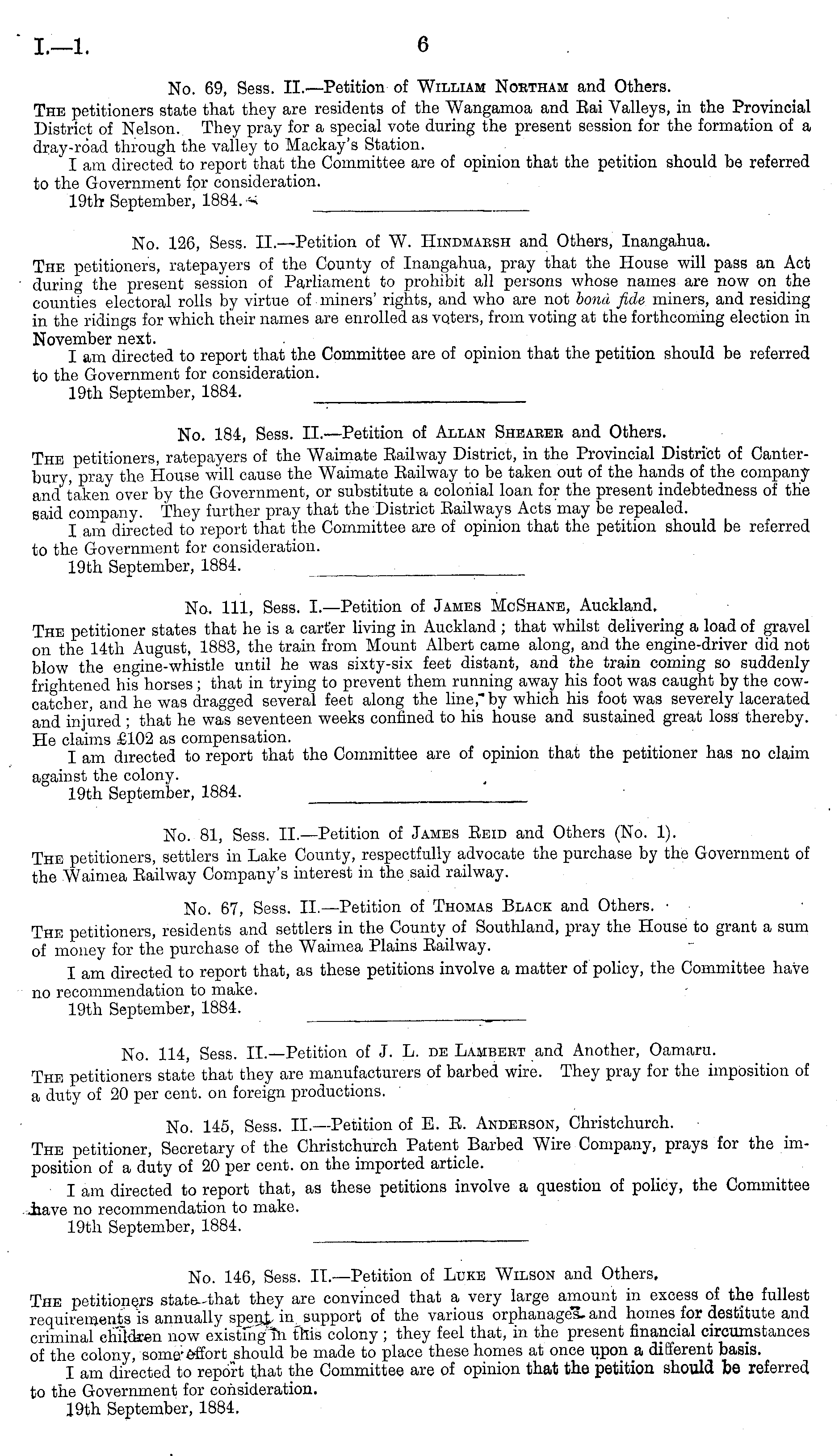 No. 81, Sess. ll.—Petition of James Eeid and Others (No. 1). The petitioners, settlers in Lake County, respectfully advocate the purchase by the Government of the Waimea Eailway Company's interest in the said railway. No. 67, Soss. II. —Petition of Thomas Black and Others. ■ The petitioners, residents and settlers in the County of Southland, pray the House to grant a sum of money for the purchase of the Waimea Plains Eailway. I am directed to report that, as these petitions involve a matter of policy, the Committee have no recommendation to make. 19th September, 1884.
