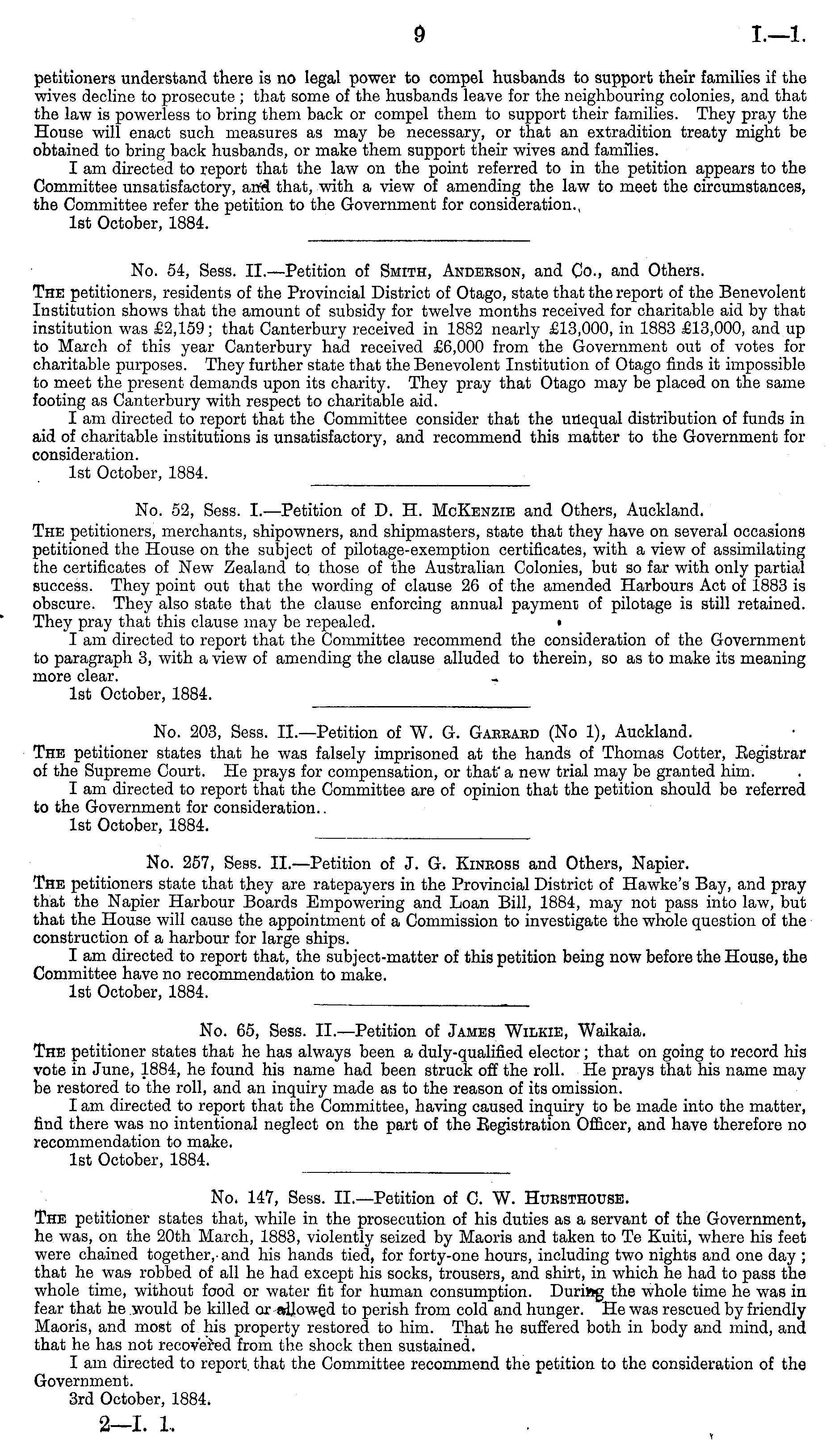 No. 257, Sess. ll.—Petition of J. G. Kineoss and Others, Napier. The petitioners state that they are ratepayers in the Provincial District of Hawke's Bay, and pray that the Napier Harbour Boards Empowering and Loan Bill, 1884, may not pass into law, but that the House will cause the appointment of a Commission to investigate the whole question of the construction of a harbour for large ships. I am directed to report that, the subject-matter of this petition being now before the House, the Committee have no recommendation to make. Ist October, 1884.