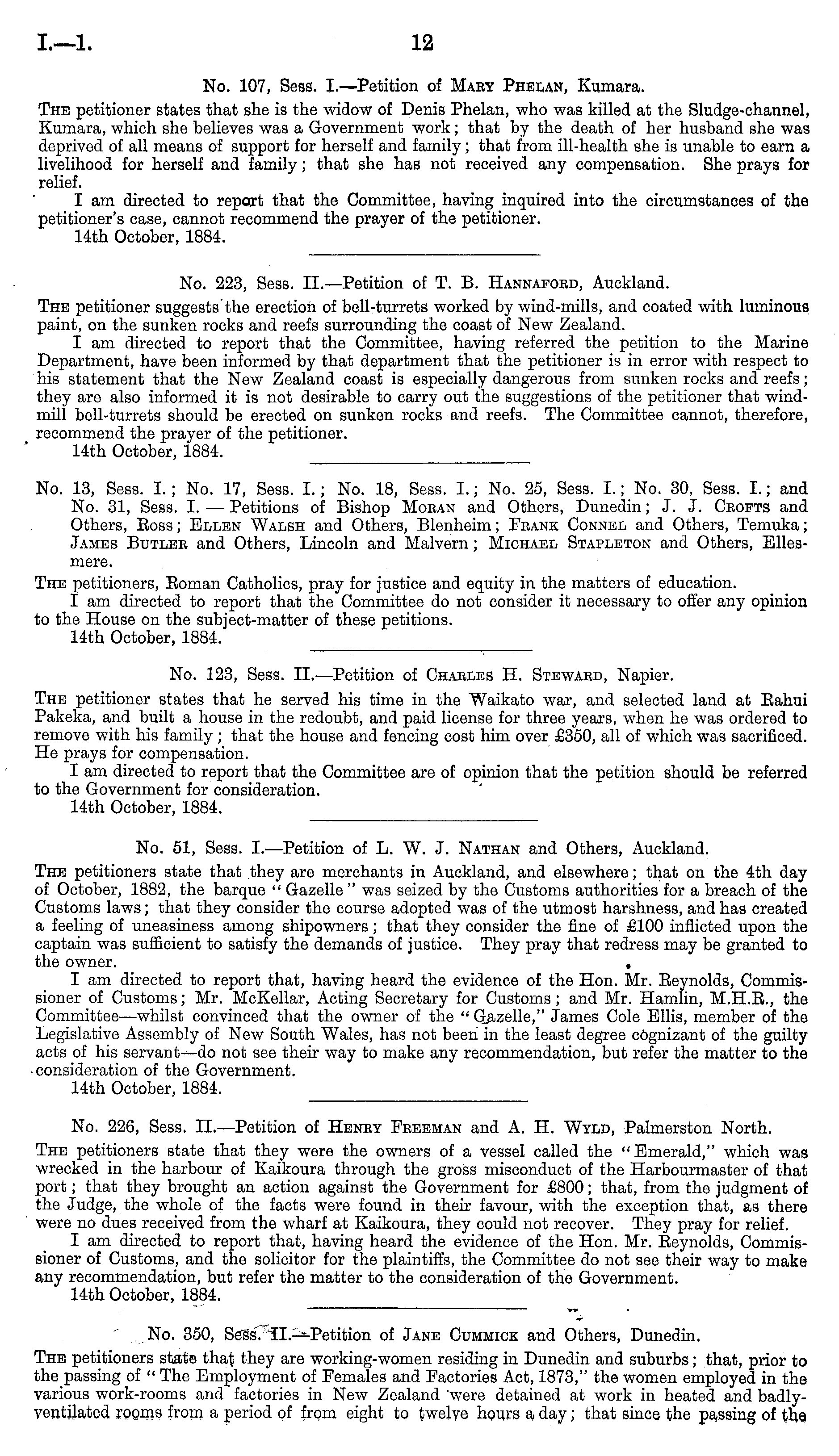 No. 107, Sess. I.—Petition of Mary Phelan, Kumara. The petitioner states that she is the widow of Denis Phelan, who was killed at the Sludge-channel, Kumara, which she believes was a Government work; that by the death of her husband she was deprived of all means of support for herself and family; that from ill-health she is unable to earn a livelihood for herself and family; that she has not received any compensation. She prays for relief. I am directed to report that the Committee, having inquired into the circumstances of the petitioner's case, cannot recommend the prayer of the petitioner. 14th October, 1884.