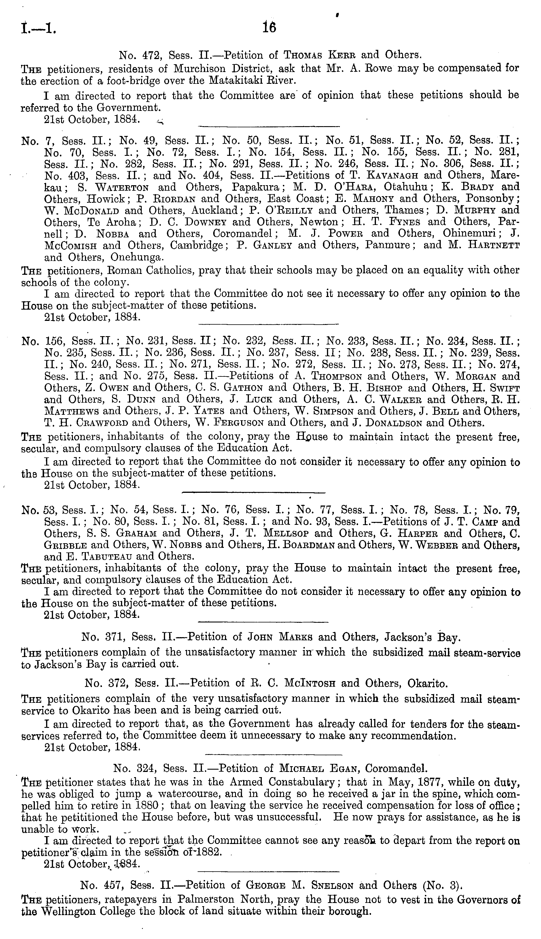 No. 53, Sess. I.; No. 54, Sess. I.; No. 76, Sess. I.; No. 77, Sess. I.; No. 78, Sess. I.; No. 79, Sess. I.; No. 80, Sess. I.; No. 81, Sess. I.; and No. 93, Sess. I.—Petitions of J. T. Camp and Others, S. S. Graham and Others, J. T. Mbllsop and Others, G. Haepee and Others, C. Geibble and Others, W. Nobbs and Others, H. Boaedman and Others, W. Webber and Others, and E. Tabuteau and Others. The petitioners, inhabitants of the colony, pray the House to maintain intact the present free, secular, and compulsory clauses of the Education Act. I am directed to report that the Committee do not consider it necessary to offer any opinion to the House on the subject-matter of these petitions. 21st October, 1884.