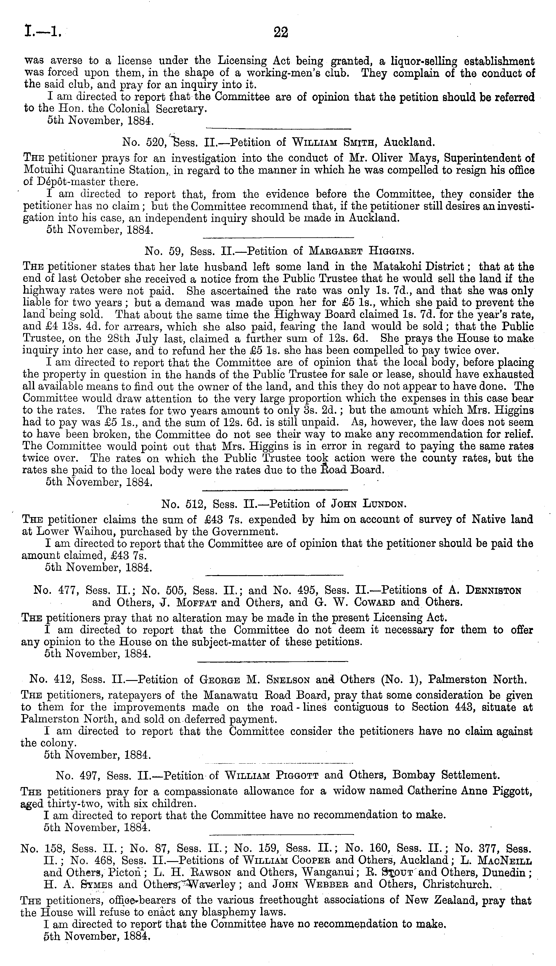 No. 520, Sess. ll.—Petition of William Smith, Auckland. The petitioner prays for an investigation into the conduct of Mr. Oliver Mays, Superintendent of Motuihi Quarantine Station,, in regard to the manner in which he was compelled to resign his office of Depot-master there. I am directed to report that, from the evidence before the Committee, they consider the petitioner has no claim; but the Committee recommend that, if the petitioner still desires an investigation into his case, an independent inquiry should be made in Auckland. sth November, 1884.