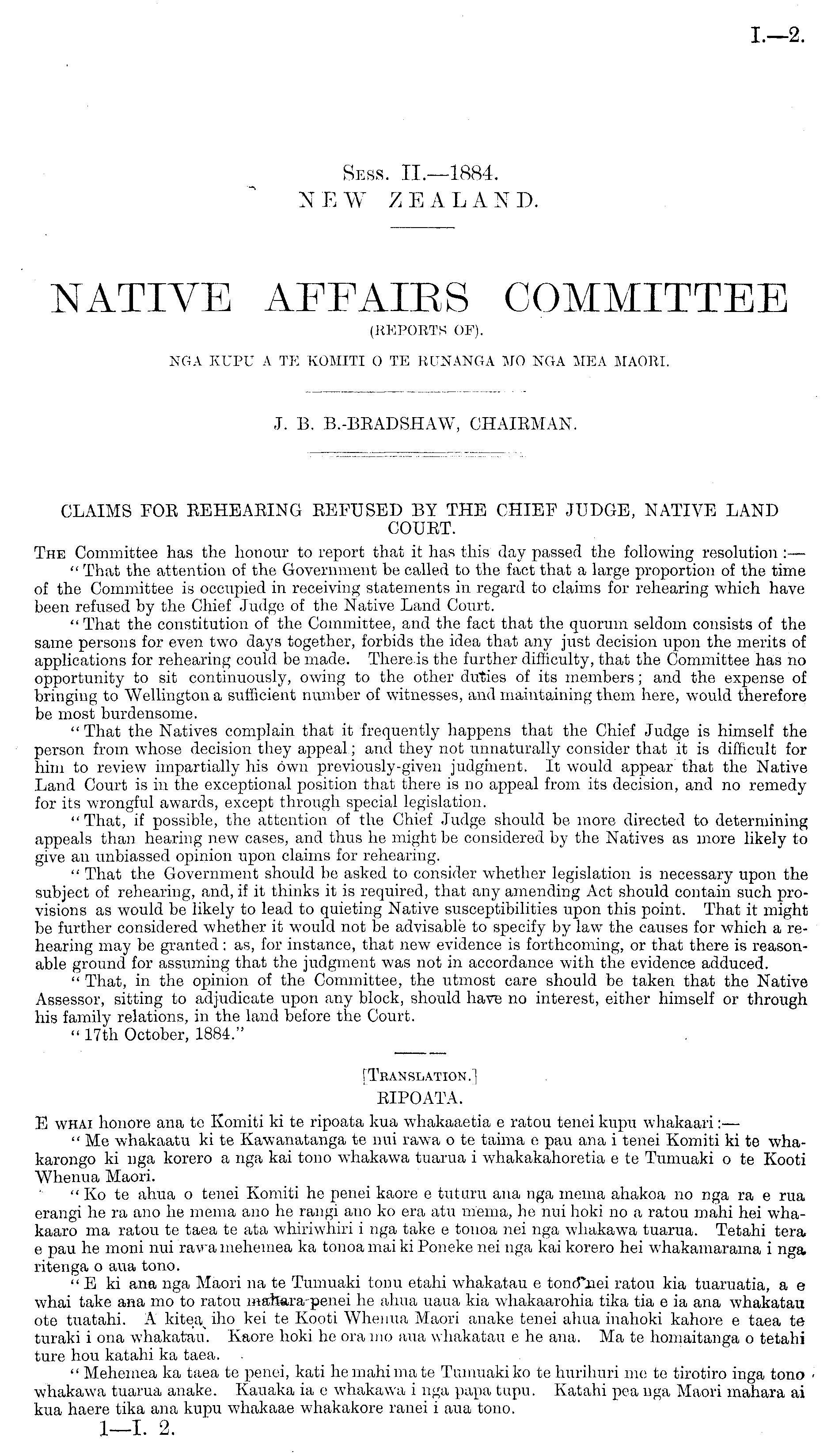 [Translation.] RIPOATA. E wHAi honore ana te Komiti kite ripoata kua whakaaetia c ratou tenei kupu wliakaari: — " Me whakaatu kite Kawanatanga te nui rawa o te taima c pau ana i tenei Komiti kite whakarongo ki nga korero a nga kai tono whakawa tuarua i whakakahoretia c te Tumuaki o te Kooti Whenua Maori. " Ko te ahua o tenei Komiti he penei kaore c tuturu ana nga mema ahakoa no nga ra c rua erangi he ra ano he mema ano he rangi auo ko era atu niema, he nui hoki no a ratou mahi hei whakaaro ma ratou te taea te ata whiriwhiri i nga take c tonoa nei nga whakawa tuarua. Tetahi tera. c pau he moni nui rawa mehemea ka tonoa mad ki Poneke nei nga kai korero hei whakainarama i nga ritenga o aua tono. " E ki ana nga Maori na te Tumuaki tonu etahi whakatau c tond\uei ratou kia tuaruatia, a c whai take ana mo to ratou mahara penei he ahua uaua kia whakaarohia tika tia c ia ana whakatau ote tuatahi. A kitea, iho kei te Kooti Whenua Maori anake tenei ahua inahoki kahore c taea te turaki i ona whakatau. Kaore hoki he ora mo aua whakatau ehe ana. Ma te homaitanga o tetabi ture hou katahi ka taea. - " Mehemea ka taea te penei, kati he mahi mate Tumuaki ko te hurihuri me te tirotiro inga tono whakawa tuarua anake. Kauaka ia c whakawa i nga papa tupu. Katahi pea nga Maori mahara ai kua haere tika ana kupu whakaae whakakore ranei i aua tono. I—l. 2.