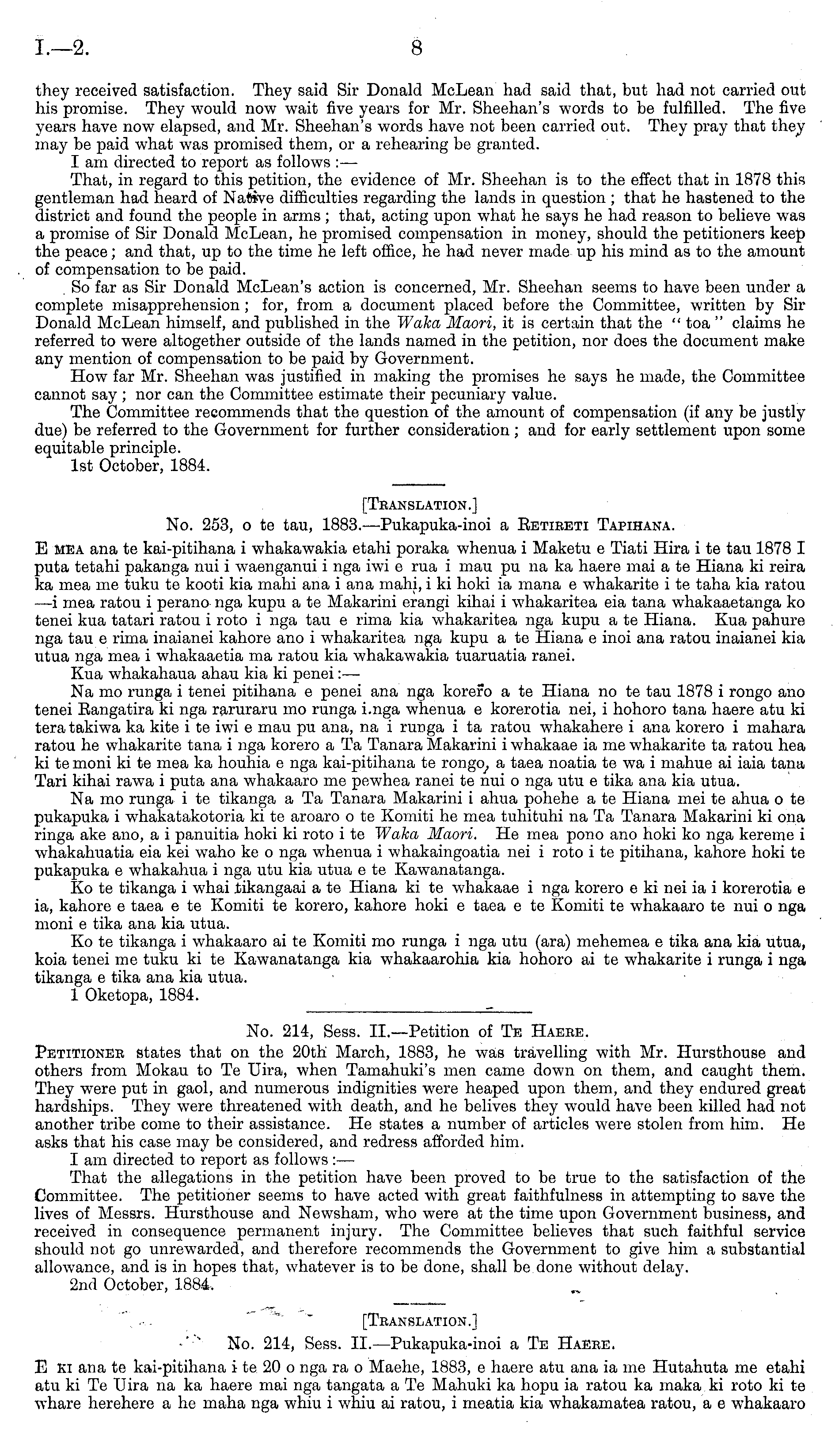 [Translation.] No. 253, o te tau, 1883.—Pukapuka-inoi a Betireti Tapihana. E mea ana te kai-pitihana i whakawakia etahi poraka whenua i Maketu c Tiati Hira i te tau 1878 I puta tetahi pakanga nui i waenganui i nga iwi c rua i man puna ka haere mai a te Hiana ki reira ka mea me tuku te kooti kia mahi ana i ana mahi, i ki hoki ia mana c whakarite i te taha kia ratou —i mea ratou i perano nga kupu a te Makarini erangi kihai i whakaritea eia tana whakaaetanga ko tenei kua tatari ratou i roto i nga tau c rima kia whakaritea nga kupu ate Hiana. Kua pahure nga tau c rima inaianei kahore ano i whakaritea nga kupu a te Hiana c inoi ana ratou inaianei kia utua nga mea i whakaaetia ma ratou kia whakawakia tuaruatia ranei. Kua whakahaua ahau kia ki penei:— Na mo runga i tenei pitihana c penei ana nga korero a te Hiana no te tau 1878 i rongo ano tenei Bangatira ki nga raruraru mo runga i.nga whenua c korerotia nei, i hohoro tana haere atu ki tera takiwa ka kite i te iwi c mau pu ana, na i runga i ta ratou whakahere i ana korero i mahara ratou he whakarite tana i nga korero a Ta Tanara Makarini i whakaae ia me whakarite ta ratou hea kite moni kite mea ka houhia c nga kai-pitihana te rongo, a taea noatia te wa i mahue ai iaia tana Tari kihai rawa i puta ana whakaaro me pewhea ranei te hui o nga utu c tika ana kia utua. Na mo runga i te tikanga a Ta Tanara Makarini i ahua pohehe a te Hiana mci te ahua o te pukapuka i whakatakotoria kite aroaro o te Korniti he mea tuhituhi na Ta Tanara Makarini ki ona ringa ake ano, a i panuitia hoki ki roto ite Waka Maori. He mea pono ano hoki ko nga kereme i whakahuatia eia kei waho ke o nga whenua i whakaingoatia nei i roto i te pitihana, kahore hoki te pukapuka c whakahua i nga utu kia utua c te Kawanatanga. Ko te tikanga i whai tikangaai a te Hiana kite whakaae i nga korero c ki nei ia i korerotia c ia, kahore c taea c te Komiti te korero, kahore hoki c taea c te Komiti te whakaaro te nui o nga moni c tika ana kia utua. Ko te tikanga i whakaaro ai te Komiti mo runga i nga utu (ara) mehemea c tika ana kia utua, koia tenei me tuku kite Kawanatanga kia whakaarohia kia hohoro ai te whakarite i runga i nga tikanga c tika ana kia utua. 1 Oketopa, 1884.