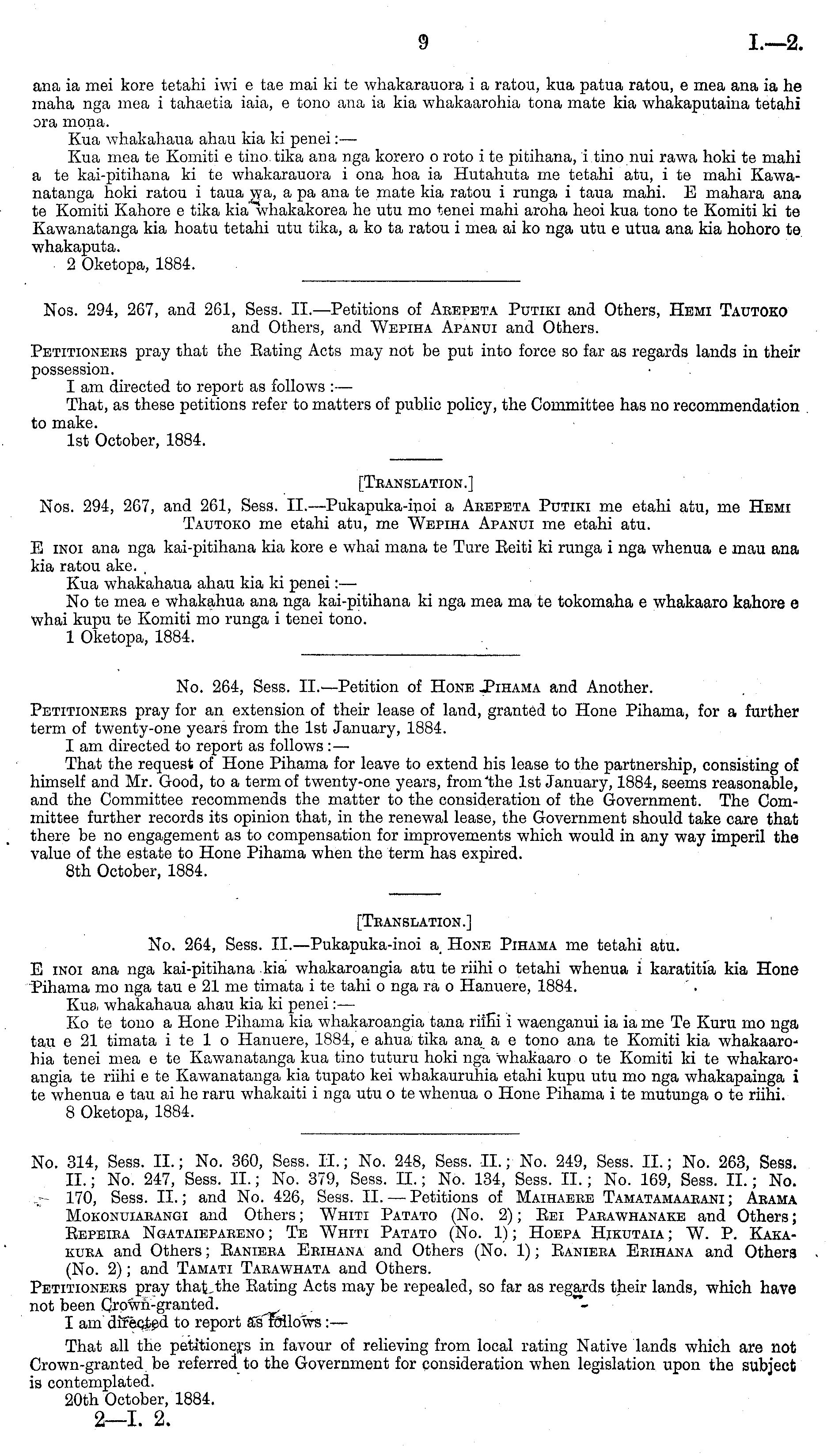 [Translation.] No. 264, Sess. ll.—Pukapuka-inoi a Hone Pihama me tetahi atu. E inoi ana nga kai-pitihana kia whakaroangia atu te riihi o tetahi whenua i karatitia kia Hone Pihama mo nga tau c 21 me timata i te tahi o nga ra o Hanuere, 1884. Kua, whakahaua ahau kia ki penei:— Ko te tono a Hone Pihama kia whakaroangia tana riihi i waengamii ia ia me Te Kuru mo nga tau c 21 timata i te 1 o Hanuere, 1884, c ahua tika ana a c tono ana te Komiti kia whakaarobia tenei mea c te Kawanatanga kua tino tuturu hoki nga whakaaro o te Komiti kite whakaroangia te riihi c te Kawanatanga kia tupato kei whakauruhia etahi kupu utu mo nga whakapainga i te whenua c tau ai he raru whakaiti i nga utu o te whenua o Hone Pihama i te mutunga o te riihi. 8 Oketopa, 1884.