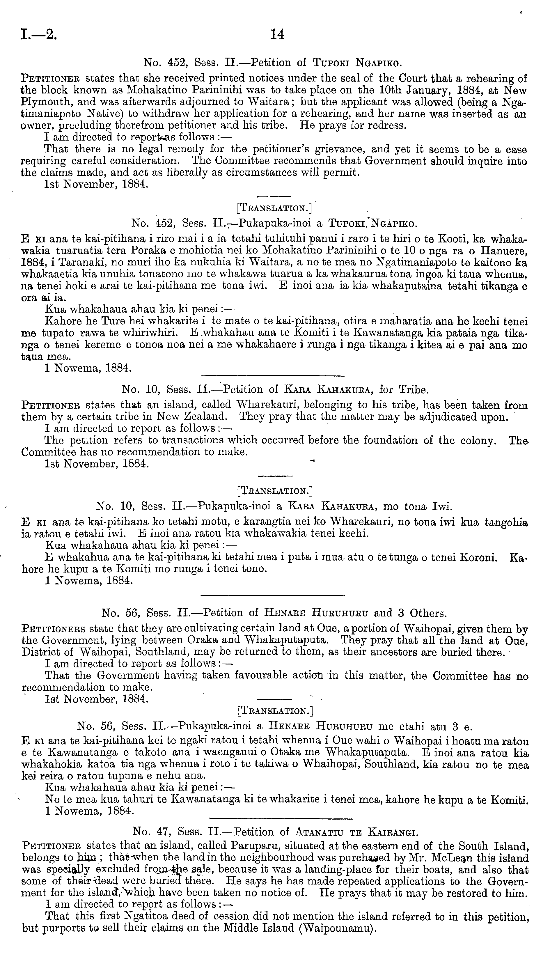 [Translation.] No. 452, Sess. ll.—Pukapuka-inoi a Tupoki.'Ngapiko. E ki ana te kai-pitihana i riro mai i a ia tetahi tuhituhi panui i raro i te hiri o te Kooti, ka whakawakia tuaruatia tera Poraka c mohiotia nei ko Mohakatino Parininihi o te 10 o nga ra o Hanuere, 1884, i Taranaki, no muri iho ka nukuhia ki Waitara, a no te mea no Ngatimaniapoto te kaitono ka whakaaetia kia unuhia tonatono mo te whakawa tuarua a ka whakaurua tona ingoa ki taua whenua, na tenei hoki c arai te kai-pitihana me tona iwi. E inoi ana ia kia whakaputaina tetahi tikanga c ora ai ia. Kua whakahaua ahau kia ki penei:— Kahore he Ture hei whakarite i te mate o te kai-pitihana, otira c maharatia ana he keehi tenei me tupato rawa te whiriwhiri. E .whakahau ana te Komiti ite Kawanatanga kia pataia nga tikanga o tenei kereme c tonoa noa nei a me whakahaere i runga i nga tikanga i kitea ai c pai ana mo taua mea. 1 Nowema, 1884.
