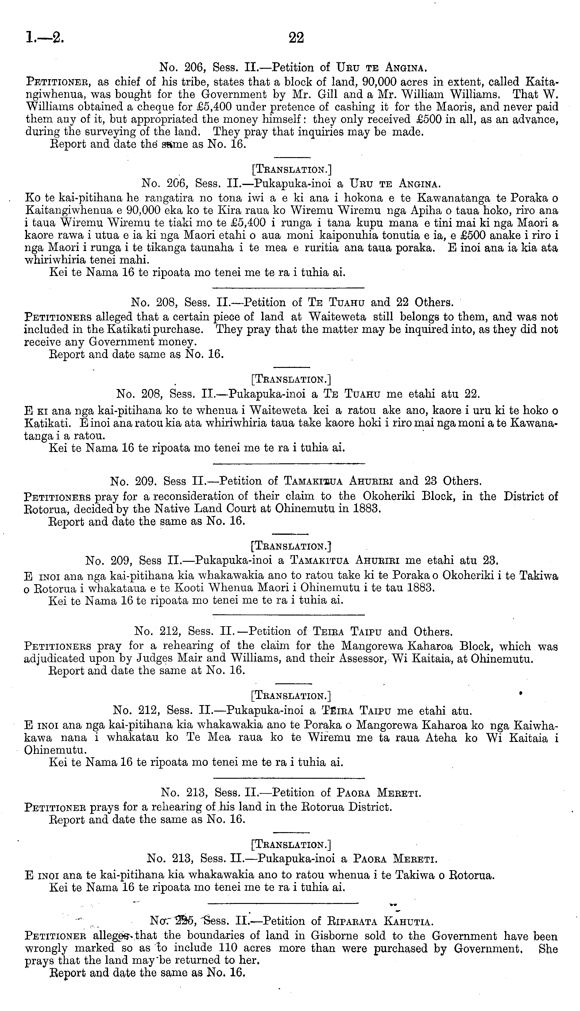 [Translation.] No. 212, Sess. ll.—Pukapuka-inoi a Teira Taipu me etahi atu. E inoi ana nga kai-pitihana kia whakawakia ano te Poraka o Mangorewa Kaharoa ko nga Kaiwhakawa nana i whakatau ko Te Mea raua ko te Wiremu me ta raua Ateha ko Wi Kaitaia i Ohinemutu. Kei te Nama 16 te ripoata mo tenei me te ra i tuhia ai.
