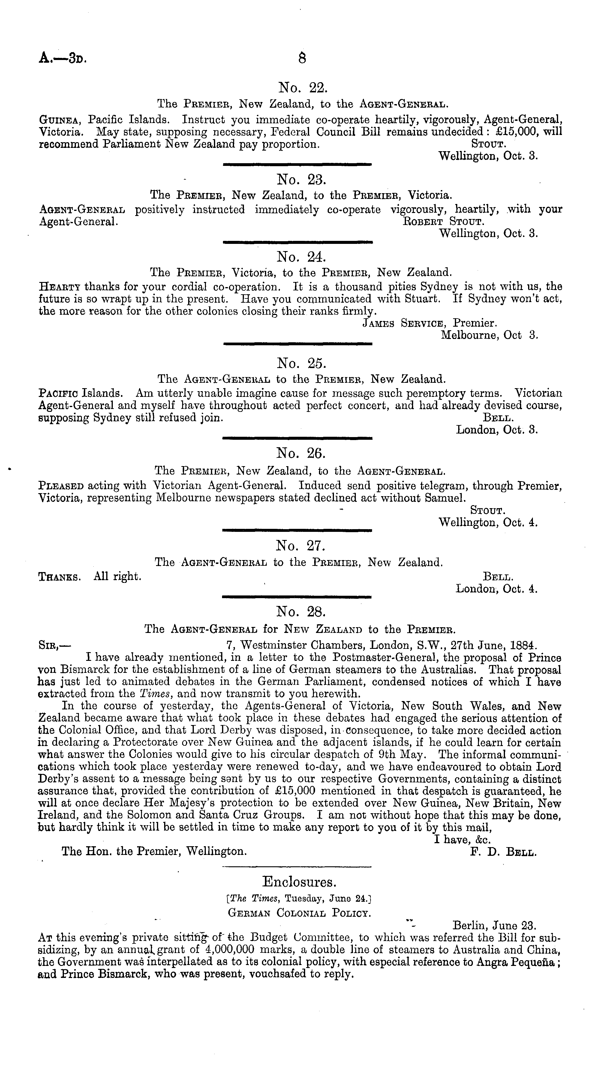 No. 28. The Agent-Geneeal for New Zealand to the Peemiee. Sic,— 7, Westminster Chambers, London, S.W., 27th June, 1884. I have already mentioned, in a letter to the Postmaster-General, the proposal of Prince yon Bismarck for the establishment of a line of German steamers to the Australias. That proposal has just led to animated debates in the German Parliament, condensed notices of which I have extracted from the Times, and now transmit to you herewith. In the course of yesterday, the Agents-General of Victoria, New South Wales, and New Zealand became aware that what took place in these debates had engaged the serious attention of the Colonial Office, and that Lord Derby was disposed, in consequence, to take more decided action in declaring a Protectorate over New Guinea and the adjacent islands, if he could learn for certain what answer the Colonies would give to his circular despatch of 9th May. The informal communications which took place yesterday were renewed to-day, and we have endeavoured to obtain Lord Derby's assent to a message being sant by us to our respective Governments, containing a distinct assurance that, provided the contribution of £15,000 mentioned in that despatch is guaranteed, he will at once declare Her Majesy's protection to be extended over New Guinea, New Britain, New Ireland, and the Solomon and Santa Cruz Groups. I am not without hope that this may be done, but hardly think it will be settled in time to make any report to you of it by this mail, I have, &c. The Hon. the Premier, Wellington. F. D. Bell.