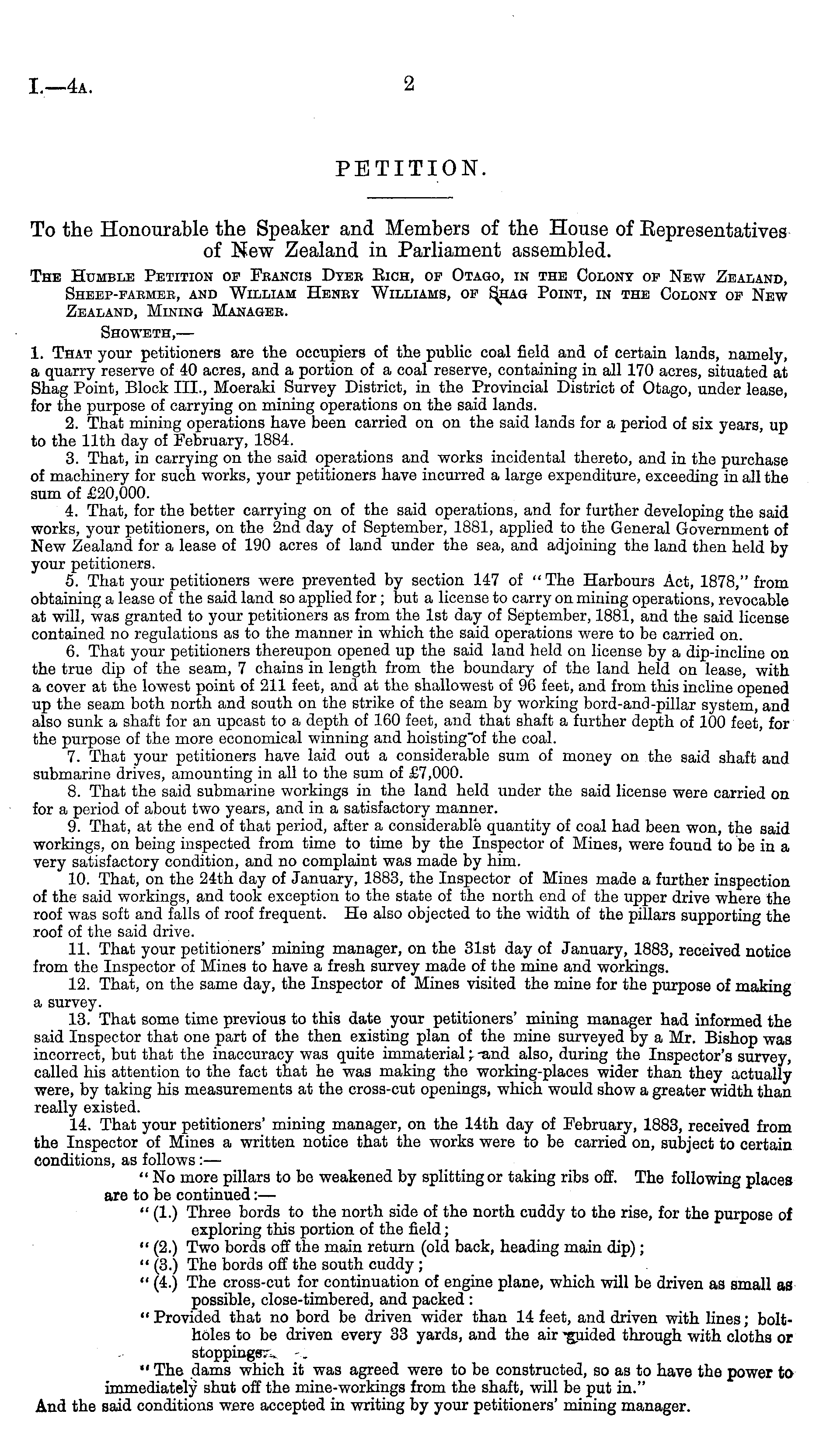 To the Honourable the Speaker and Members of the House of Bepresentatives of New Zealand in Parliament assembled. The Humble Petition of Francis Dyer Eich, of Otago, in the Colony of New Zealand, Sheep-farmer, and William Henry Williams, of S^hag Point, in the Colony of New Zealand, Mining Manager. Showeth, — 1. That your petitioners are the occupiers of the public coal field and of certain lands, namely, a quarry reserve of 40 acres, and a portion of a coal reserve, containing in all 170 acres, situated at Shag Point, Block 111., Moeraki Survey District, in the Provincial District of Otago, under lease, for the purpose of carrying on mining operations on the said lands. 2. That mining operations have been carried on on the said lands for a period of six years, up to the 11th day of February, 1884. 3. That, in carrying on the said operations and works incidental thereto, and in the purchase of machinery for such works, your petitioners have incurred a large expenditure, exceeding in all the sum of £20,000. 4. That, for the better carrying on of the said operations, and for further developing the said works, your petitioners, on the 2nd day of September, 1881, applied to the General Government of New Zealand for a lease of 190 acres of land under the sea, and adjoining the land then held by your petitioners. 5. That your petitioners were prevented by section 147 of "The Harbours Act, 1878," from obtaining a lease of the said land so applied for; but a license to carry on mining operations, revocable at will, was granted to your petitioners as from the Ist day of September, 1881, and the said license contained no regulations as to the manner in which the said operations were to be carried on. 6. That your petitioners thereupon opened up the said land held on license by a dip-incline on the true dip of the seam, 7 chains in length from the boundary of the land held on lease, with a cover at the lowest point of 211 feet, and at the shallowest of 96 feet, and from this incline opened up the seam both north and south on the strike of the seam by working bord-and-pillar system, and also sunk a shaft for an upcast to a depth of 160 feet, and that shaft a further depth of 100 feet, for the purpose of the more economical winning and hoisting'of the coal. 7. That your petitioners have laid out a considerable sum of money on the said shaft and submarine drives, amounting in all to the sum of £7,000. 8. That the said submarine workings in the land held under the said license were carried on for a period of about two years, and in a satisfactory manner. 9. That, at the end of that period, after a considerable quantity of coal had been won, the said workings, on being inspected from time to time by the Inspector of Mines, were found to be in a very satisfactory condition, and no complaint was made by him. 10. That, on the 24th day of January, 1883, the Inspector of Mines made a further inspection of the said workings, and took exception to the state of the north end of the upper drive where the roof was soft and falls of roof frequent. He also objected to the width of the pillars supporting the roof of the said drive. 11. That your petitioners' mining manager, on the 31st day of January, 1883, received notice from the Inspector of Mines to have a fresh survey made of the mine and workings. 12. That, on tho same day, the Inspector of Mines visited the mine for the purpose of making a survey. 13. That some time previous to this date your petitioners' mining manager had informed the said Inspector that one part of the then existing plan of the mine surveyed by a Mr. Bishop was incorrect, but that the inaccuracy was quite immaterial; and also, during the Inspector's survey, called his attention to the fact that he was making the working-places wider than they actually were, by taking his measurements at the cross-cut openings, which would show a greater width than really existed. 14. That your petitioners' mining manager, on the 14th day of February, 1883, received from the Inspector of Mines a written notice that the works were to be carried on, subject to certain conditions, as follows:— "No more pillars to be weakened by splitting or taking ribs off. The following places are to be continued:— " (1.) Three bords to the north side of the north cuddy to the rise, for the purpose of exploring this portion of the field; " (2.) Two bords off the main return (old back, heading main dip); " (3.) The bords off the south cuddy; " (4.) The cross-cut for continuation of engine plane, which will be driven as small as possible, close-timbered, and packed : " Provided that no bord be driven wider than 14 feet, and driven with lines; boltholes to be driven every 33 yards, and the air -guided through with cloths or stoppings. " The dams which it was agreed were to be constructed, so as to have the power to immediately shut off the mine-workings from the shaft, will be put in." And the said conditions were accepted in writing by your petitioners' mining manager.