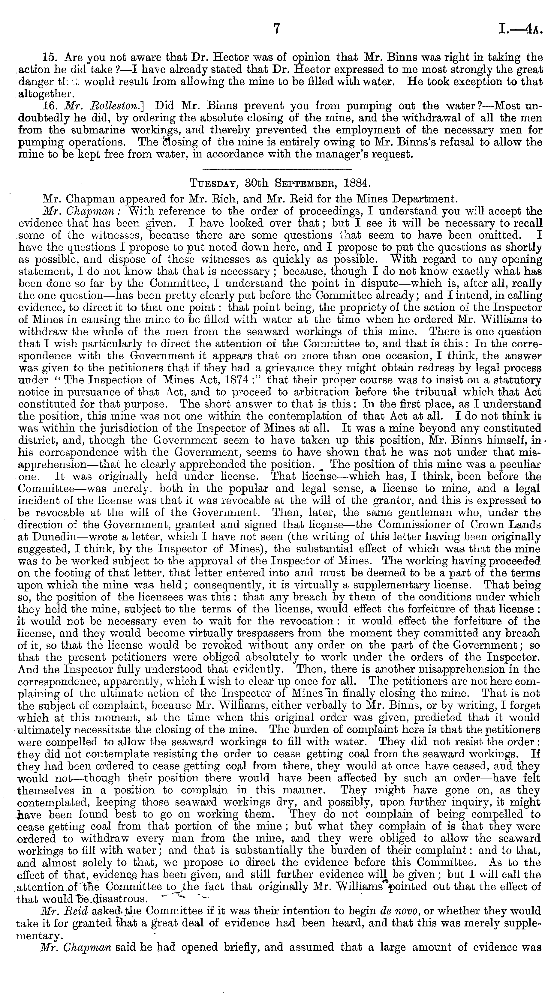 Tuesday, 30th September, 1884. Mr. Chapman appeared for Mr. Eich, and Mr. Eeid for the Mines Department. Mr. Chapman : With reference to the order of proceedings, I understand you will accept the evidence that has been given. I have looked over that; but I see it will be necessary to recall .some of the witnesses, because there are some questions that seem to have been omitted. I have the questions I propose to put noted down here, and I propose to put the questions as shortly as possible, and dispose of these witnesses as quickly as possible. With regard to any opening statement, I do not know that that is necessary ; because, though I do not know exactly what has been done so far by the Committee, I understand the point in dispute—which is, after all, really the one question—has been pretty clearly put before the Committee already; and I intend, in calling evidence, to direct it to that one point : that point being, the propriety of the action of the Inspector of Mines in causing the mine to be filled with water at the time when he ordered Mr. Williams to withdraw the whole of the men from the seaward workings of this mine. There is one question that I wish particularly to direct the attention of the Committee to, and that is this: In the correspondence with the Government it appears that on more than one occasion, I think, the answer was given to the petitioners that if they had a grievance they might obtain redress by legal process under " The Inspection of Mines Act, 1874 :" that their proper course was to insist on a statutory notice in pursuance of that Act, and to proceed to arbitration before the tribunal which that Act constituted for that purpose. The short answer to that is this : In the first place, as I understand the position, this mine was not one within the contemplation of that Act at all. Ido not think it was within the jurisdiction of the Inspector of Mines at all. It was a mine beyond any constituted district, and, though the Government seem to have taken up this position, Mr. Binns himself, in • his correspondence with the Government, seems to have shown that he was not under that misapprehension—that he clearly apprehended the position. The position of this mine was a peculiar one. It was originally held under license. That license —which has, I think, been before the Committee—was merely, both in the popular and legal sense, a license to mine, and a legal incident of the license was that it was revocable at the will of the grantor, and this is expressed to be revocable at the will of the Government. Then, later, the same gentleman who, under the direction of the Government, granted and signed that license —the Commissioner of Crown Lands at Dunedin —wrote a letter, which I have not seen (the writing of this letter having been originally suggested, I think, by the Inspector of Mines), the substantial effect of which was that the mine was to be worked subject to the approval of the Inspector of Mines. The working having proceeded on the footing of that letter, that letter entered into and must be deemed to be a part of the terms upon which the mine was held; consequently, it is virtually a supplementary license. That being so, the position of the licensees was this : that any breach by them of the conditions under which they held the mine, subject to the terms of the license, would effect the forfeiture of that license : it would not be necessary even to wait for the revocation : it would effect the forfeiture of the license, and they would become virtually trespassers from the moment they committed any breach of it, so that the license would be revoked without any order on the part of the Government; so that the present petitioners were obliged absolutely to work under the orders of the Inspector. And the Inspector fully understood that evidently. Then, there is another misapprehension in the correspondence, apparently, which I wish to clear up once for all. The petitioners are not here complaining of the ultimate action of the Inspector of Mines in finally closing the mine. That is not the subject of complaint, because Mr. Williams, either verbally to Mr. Binns, or by writing, I forget which at this moment, at the time when this original order was given, predicted that it would ultimately necessitate the closing of the mine. The burden of complaint here is that the petitioners were compelled to allow the seaward workings to fill with water. They did not resist the order: they did not contemplate resisting the order to cease getting coal from the seaward workings. If they had been ordered to cease getting coal from there, they would at once have ceased, and they would not —though their position there would have been affected by such an order—have felt themselves in a position to complain in this manner. They might have gone on, as they contemplated, keeping those seaward workings dry, and possibly, upon further inquiry, it might have been found best to go on working them. They do not complain of being compelled to cease getting coal from that portion of the mine ; but what they complain of is that they were ordered to withdraw every man from the mine, and they were obliged to allow the seaward workings to fill with water; and that is substantially the burden of their complaint: and to that, and almost solely to that, we propose to direct the evidence before this Committee. As to the effect of that, evidence has been given, and still further evidence will be given; but I will call the attention of the Committee to the fact that originally Mr. Williams pointed out that the effect of that would be disastrous. Mr. Beid asked, the Committee if it was their intention to begin de novo, or whether they would take it for granted that a great deal of evidence had been heard, and that this was merely supplementary. Mr. Chapman said he had opened briefly, and assumed that a large amount of evidence was