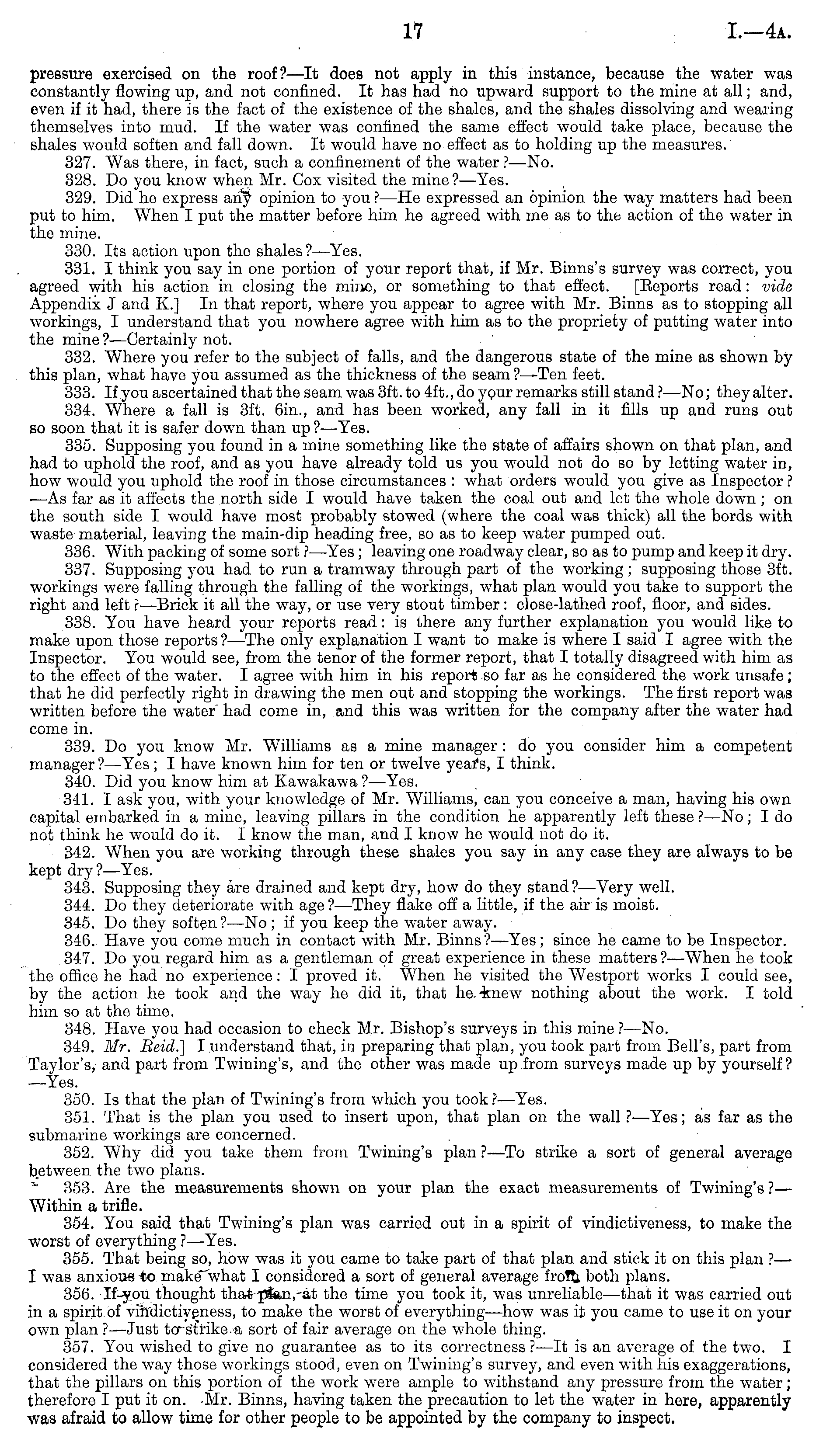 pressure exercised on the roof?—lt does not apply in this instance, because the water was constantly flowing up, and not confined. It has had no upward support to the mine at all; and, even if it had, there is the fact of the existence of the shales, and the shales dissolving and wearing themselves into mud. If the water was confined the same effect would take place, because the shales would soften and fall down. It would have no effect as to holding up the measures. 327. Was there, in fact, such a confinement of the water ?—No. 328. Do you know when Mr. Cox visited the mine? —Yes. 329. Did he express any opinion to you ? —He expressed an opinion the way matters had been put to him. When I put the matter before him he agreed with me as to the action of the water in the mine. 330. Its action upon the shales ?—Yes. 331. I think you say in one portion of your report that, if Mr. Binns's survey was correct, you agreed with his action in closing the mine, or something to that effect. [Eeports read: vide Appendix J and K.] In that report, where you appear to agree with Mr. Binns as to stopping all workings, I understand that you nowhere agree with him as to the propriety of putting water into the mine?—Certainly not. 332. Where you refer to the subject of falls, and the dangerous state of the mine as shown by this plan, what have you assumed as the thickness of the seam? —Ten feet. 333. If you ascertained that the seam was 3ft. to 4ft., do your remarks still stand ?—No; they alter. 334. Where a fall is 3ft. 6in., and has been worked, any fall in it fills up and runs out so soon that it is safer down than up ?—Yes. 335. Supposing you found in a mine something like the state of affairs shown on that plan, and had to uphold the roof, and as you have already told us you would not do so by letting water in, how would you uphold the roof in those circumstances : what orders would you give as Inspector ? —As far as it affects the north side I would have taken the coal out and let the whole down ;on the south side I would have most probably stowed (where the coal was thick) all the bords with waste material, leaving the main-dip heading free, so as to keep water pumped out. 336. With packing of some sort ?—Yes; leaving one roadway clear, so as to pump and keep it dry. 337. Supposing you had to run a tramway through part of the working ; supposing those 3ft. workings were falling through the falling of the workings, what plan would you take to support the right and left ?—Brick it all the way, or use very stout timber: close-lathed roof, floor, and sides. 338. You have heard your reports read: is there any further explanation you would like to make upon those reports ? —The only explanation I want to make is where I said I agree with the Inspector. You would see, from the tenor of the former report, that I totally disagreed with him as to the effect of the water. I agree with him in his report so far as he considered the work unsafe; that he did perfectly right in drawing the men out and stopping the workings. The first report was written before the water had come in, and this was written for the company after the water had come in. 339. Do you know Mr. Williams as a mine manager : do you consider him a competent manager? —Yes; I have known him for ten or twelve years, I think. 340. Did you know him at Kawakawa ? —Yes. 341. I ask you, with your knowledge of Mr. Williams, can you conceive a man, having his own capital embarked in a mine, leaving pillars in the condition he apparently left these ?—No; I do not think lie would do it. I know the man, and I know he would not do it. 342. When you are working through these shales you say in any case they are always to be kept dry?—Yes. 343. Supposing they are drained and kept dry, how do they stand?—Very well. 344. Do they deteriorate with age?—They flake off a little, if the air is moist. 345. Do they soften? —No; if you keep the water away. 346. Have you come much in contact with Mr. Binns?—Yes ; since he came to be Inspector. 347. Do you regard him as a gentleman of great experience in these matters? —When he took tho office he had no experience: I proved it. When he visited the Westport works I could see, by the action he took and the way he did it, that he knew nothing about the work. I told him so at the time. 348. Have you had occasion to check Mr. Bishop's surveys in this mine ?—No. 349. Mr. Beid.] I.understand that, in preparing that plan, you took part from Bell's, part from Taylor's, and part from Twining's, and the other was made up from surveys made up by yourself? —Yes. 350. Is that the plan of Twining's from which you took ? —Yes. 351. That is the plan you used to insert upon, that plan on the wall ?—Yes; as far as the submarine workings are concerned. 352. Why did you take them from Twining's plan?—To strike a sort of general average between the two plans. 353. Are the measurements shown on your plan the exact measurements of Twining's ?— Within a trifle. 354. You said that Twining's plan was carried out in a spirit of vindictiveness, to make the worst of everything ? —Yes. 355. That being so, how was it you came to take part of that plan and stick it on this plan ?— I was anxious to make what I considered a sort of general average from both plans. 356. If you thought that plan, at the time you took it, was unreliable—that it was carried out in a spirit of vindictiveness, to make the worst of everything —how was it you came to use it on your own plan ?—Just to strike a sort of fair average on the whole thing. 357. You wished to give no guarantee as to its correctness ?—lt is an average of the two. I considered the way those workings stood, even on Twining's survey, and even with his exaggerations, that the pillars on this portion of the work were ample to w-ithstand any pressure from the water; therefore I put it on. -Mr. Binns, having taken the precaution to let the water in 