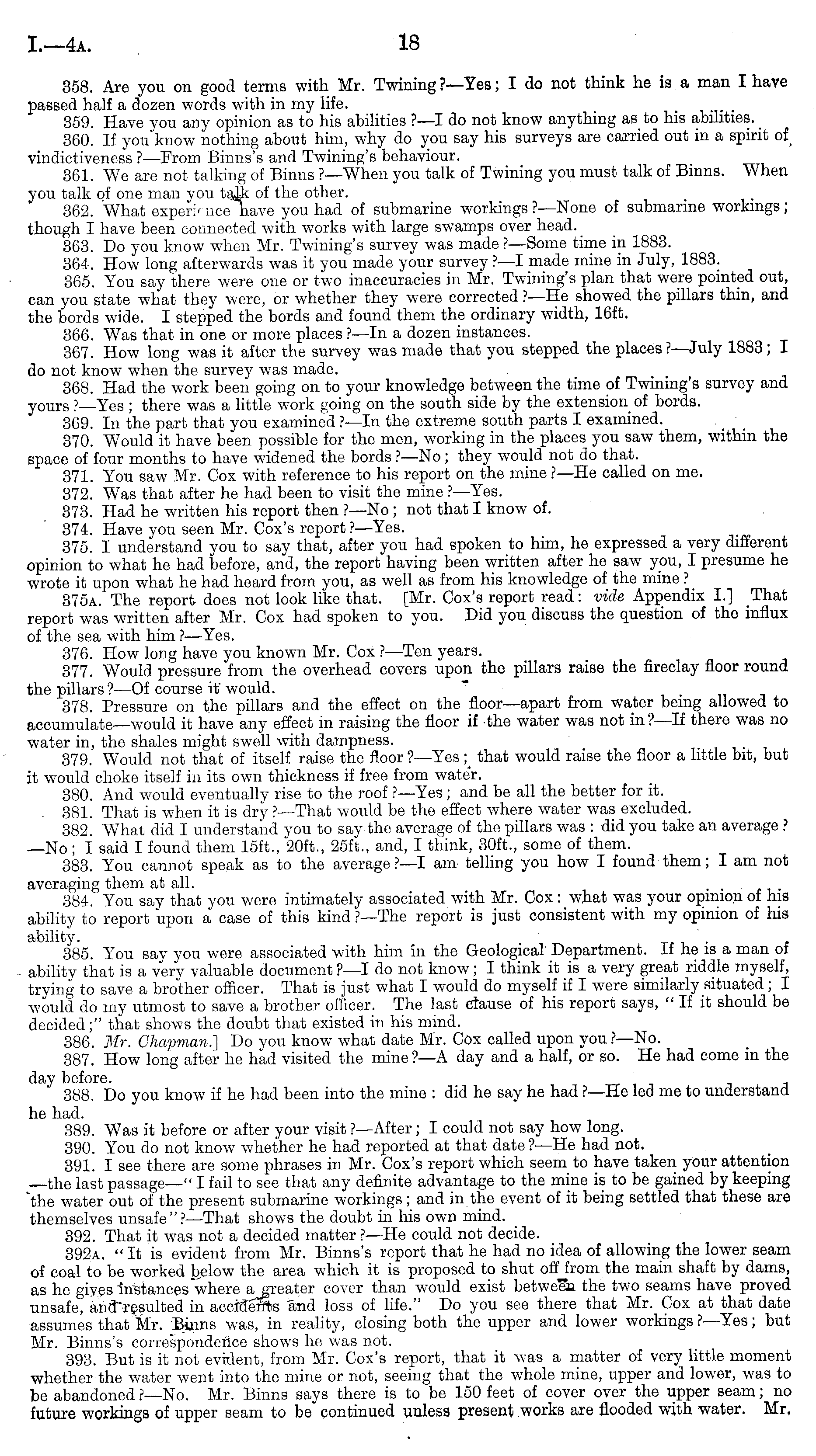 358. Are you on good terms with Mr. Twining ?—Yes; I do not think he is a man I have passed half a dozen words with in my life. _ .... 359. Have you any opinion as to his abilities ?—I do not know anything as to his abilities. _ 360. If you know nothing about him, why do you say his surveys are carried out in a spirit of vindictiveness ? —From Binns's and Twining's behaviour. 361. We are not talking of Binns ?—When you talk of Twining you must talk of Binns. When you talk of one man you talk of the other. 362. What experience have you had of submarine workings ?—None of submarine workings; though I have been connected with works with large swamps over head. 363. Do you know when Mr. Twining's survey was made ?—Some time in 1883. 364. How long afterwards was it you made your survey ?—I made mine in July, 1883. 365. You say there were one or two inaccuracies in Mr. Twining's plan that were pointed out, can you state what they were, or whether they were corrected ?—He showed the pillars thin, and the bords wide. I stepped the bords and found them the ordinary width, 16ft. 366. Was that in one or more places ?—ln a dozen instances. 367. How long was it after the survey was made that you stepped the places ?—July 1883; I do not know when the survey was made. 368. Had the work been going on to your knowledge between the time of Twining's survey and yours ?—Yes ; there was a little work going on the south side by the extension of bords. 369. In the part that you examined ?—ln the extreme south parts I examined. 370. Would it have been possible for the men, working in the places you saw them, withm the space of four months to have widened the bords ?—No; they would not do that. 371. You saw Mr. Cox with reference to his report on the mine ? —He called on me. 372. Was that after he had been to visit the mine ?—Yes. 373. Had he written his report then ?—No; not that I know of. 374. Have you seen Mr. Cox's report ?—Yes. 375. I understand you to say that, after you had spoken to him, he expressed a very different opinion to what he had before, and, the report having been written after he saw you, I presume he wrote it upon what he had heard from you, as well as from his knowledge of the imne ? 375a. The report does not look like that. [Mr. Cox's report read: vide Appendix I.] That report was written after Mr. Cox had spoken to you. Did you discuss the question of the influx of the sea with him ?—Yes. 376. How long have you known Mr. Cox ?—Ten years. 377. Would pressure from the overhead covers upon the pillars raise the fireclay floor round the pillars? —Of course if would. 378. Pressure on the pillars and the effect on the floor—apart from water being allowed to accumulate—would it have any effect in raising the floor if the water was not in ?—lf there was no water in, the shales might swell with dampness. 379. Would not that of itself raise the floor ?—Yes;_ that would raise the floor a little bit, but it would choke itself in its own thickness if free from water. 380. And would eventually rise to the roof ?—Yes ; and be all the better for it. . 381. That is when it is dry .'—That would be the effect where water was excluded. 382. What did I understand you to say the average of the pillars was : did you take an average ? —No; I said I found them 15ft., 20ft., 25ft., and, I think, 30ft., some of them. 383. You cannot speak as to the average ?—I am- telling you how I found them; lam not averaging them at all. .... 384. You say that you were intimately associated with Mr. Cox : what was your opinion of his ability to report upon a case of this kind ?—The report is just consistent with my opinion of his ability. '. 385. You say you were associated with him in the Geological Department. If he is a man of ability that is a very valuable document ?—I do not know ; I think it is a very great riddle myself, trying to save a brother officer. That is just what I would do myself if I were similarly situated ; I would do my utmost to save a brother officer. The last clause of his report says, "If it should be decided;" that shows the doubt that existed in his mind. 386. Mr. Chapman.] Do you know what date Mr. Cox called upon you ?—No. 387. How long after he had visited the mine?—A day and a half, or so. He had come in the day before. 388. Do you know if he had been into the mine : did he say he had ?—He led me to understand he had. 389. Was it before or after your visit ?—After; I could not say how long. 390. You do not know whether he had reported at that date?—He had not. 391. I see there are some phrases in Mr. Cox's report which seem to have taken your attention —the last passage—" I fail to see that any definite advantage to the mine is to be gained by keeping the water out of the present submarine workings; and in the event of it being settled that these are themselves unsafe"?—That shows the doubt in his own mind. 392. That it was not a decided matter ? —He could not decide. 392a. " It is evident from Mr. Binns's report that he had no idea of allowing the lower seam of coal to be worked below the area which it is proposed to shut off from the main shaft by dams, as he gives instances "where agreater cover than would exist between the two seams have proved unsafe, and resulted in accidents and loss of life." Do you see there that Mr. Cox at that date assumes that Mr. Binns was, in reality, closing both the upper and lower workings ?—Yes; but Mr. Binns's correspondence shows he was not. 393. But is it not evident, from Mr. Cox's report, that it was a matter of very little moment whether the water went into the mine or not, seeing that the whole mine, upper and lower, was to be abandoned?—No. Mr. Binns says there is to be 150 feet of cover over the upper seam; no future workings of upper seam to be continued unless present works are flooded with water. Mr.