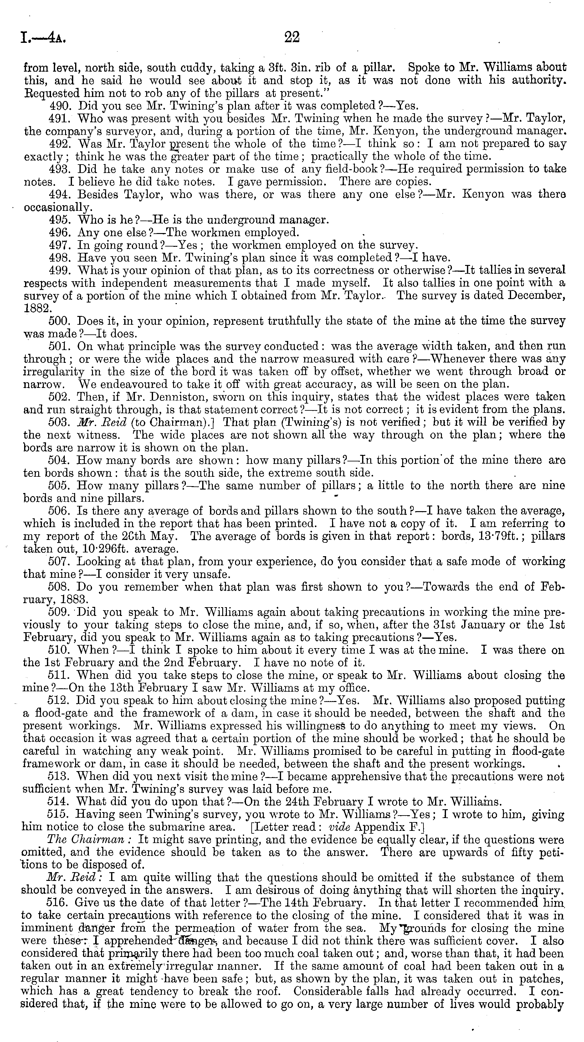 from level, north side, south cuddy, taking a 3ft. 3in. rib of a pillar. Spoke to Mr. Williams about this, and he said he would see about it and stop it, as it was not done with his authority. Eequested him not to rob any of the pillars at present." 490. Did you see Mr. Twining's plan after it was completed ? —Yes. 491. Who was present with you besides Mr. Twining when he made the survey ?—Mr. Taylor, the company's surveyor, and, during a portion of the time, Mr. Kenyon, tho underground manager. 492. Was Mr. Taylor present the whole of the time ?—I think so : I am not prepared to say exactly; think he was the greater part of the time ; practically the whole of the time. 493. Did he take any notes or make use of any field-book? —He required permission to take notes. I believe he did take notes. I gave permission. There are copies. 494. Besides Taylor, who was there, or was there any one else ? —Mr. Kenyon was there occasionally. 495. Who is he ?—He is the underground manager. 496. Any one else ?—-The workmen employed. 497. In going round?—Yes; the workmen employed on the survey. 498. Have you seen Mr. Twining's plan since it was completed ? —I have. 499. What is your opinion of that plan, as to its correctness or otherwise?—lt tallies in several respects with independent measurements that I made myself. It also tallies in one point with a survey of a portion of the mine which I obtained from Mr. Taylor. The survey is dated December, 1882. 500. Does it, in your opinion, represent truthfully the state of the mine at the time the survey was made?—lt does. 501. On what principle was the survey conducted : was the average width taken, and then run through ; or were the wide places and the narrow measured with care ? —Whenever there was any irregularity in the size of the bord it was taken off by offset, whether we went through broad or narrow. We endeavoured to take it off with great accuracy, as will be seen on the plan. 502. Then, if Mr. Denniston, sworn on this inquiry, states that the widest places were taken and run straight through, is that statement correct ? —lt is not correct; it is evident from the plans. 503. Mr. Beid (to Chairman).] That plan (Twining's) is not verified; but it will be verified by the next witness. The wide places are not shown all the way through on the plan; where the bords are narrow it is shown on the plan. 504. How many bords are shown : how many pillars?—ln this portion'of the mine there are ten bords shown: that is the south side, the extreme south side. 505. How many pillars ?—The same number of pillars; a little to the north there are nine bords and nine pillars. 506. Is there any average of bords and pillars shown to the south?—l have taken the average, which is included in the report that has been printed. I have not a copy of it. lam referring to my report of the 2Cth May. The average of bords is given in that report: bords, 13*79ft.; pillars taken out, 10*296ft. average. 507. Looking at that plan, from your experience, do you consider that a safe mode of working that mine ? —I consider it very unsafe. 508. Do you remember when that plan was first shown to you?—Towards the end of February, 1883. 509. Did you speak to Mr. Williams again about taking precautions in working the mine previously to your taking steps to close the mine, and, if so, when, after the 31st January or the Ist February, did you speak to Mr. Williams again as to taking precautions ? —Yes. 510. When ?—I think I spoke to him about it every time I was at the mine. I was there on the Ist February and the 2nd February. I have no note of it. 511. When did you take steps to close the mine, or speak to Mr. Williams about closing the mine ? —On the 13th February I saw Mr. Williams at my office. 512. Did you speak to him about closing the mine?—Yes. Mr. Williams also proposed putting a flood-gate and the framew*ork of a dam, in case it should be needed, between the shaft and the present workings. Mr. Williams expressed his willingness to do anything to meet my views. On that occasion it was agreed that a certain portion of the mine should be worked ; that he should be careful in watching any weak point. Mr. Williams promised to be careful in putting in flood-gate framework or dam, in case it should be needed, between the shaft and the present workings. 513. When did you next visit the mine ?—I became apprehensive that the precautions were not sufficient when Mr. Twining's survey was laid before me. 514. What did you do upon that ?—On the 24th February I wrote to Mr. Williains. 515. Having seen Twining's survey, you wrote to Mr. Williams?—Yes; I wrote to him, giving him notice to close the submarine area. [Letter read : vide Appendix F.] The Chairman : It might save printing, and the evidence be equally clear, if the questions were omitted, and the evidence should be taken as to the answer. There are upwards of fifty petitions to be disposed of. Mr. Beid: I am quite willing that the questions should be omitted if the substance of them should be conveyed in the answers. lam desirous of doing anything that will shorten the inquiry. 516. Give us the date of that letter ?—The 14th February. In that letter I recommended him, to take certain precautions with reference to the closing of the mine. I considered that it was in imminent danger from the permeation of water from the sea. My "grounds for closing the mine were these : I apprehended danger-, and because I did not think there was sufficient cover. I also considered that primarily there had been too much coal taken out; and, worse than that, it had been taken out in an extremely irregular manner. If the same amount of coal had been taken out in a regular manner it might have been safe; but, as shown by the plan, it was taken out in patches, which has a great tendency to break the roof. Considerable falls had already occurred. I considered that, if the mine were to be allowed to go on, a very la