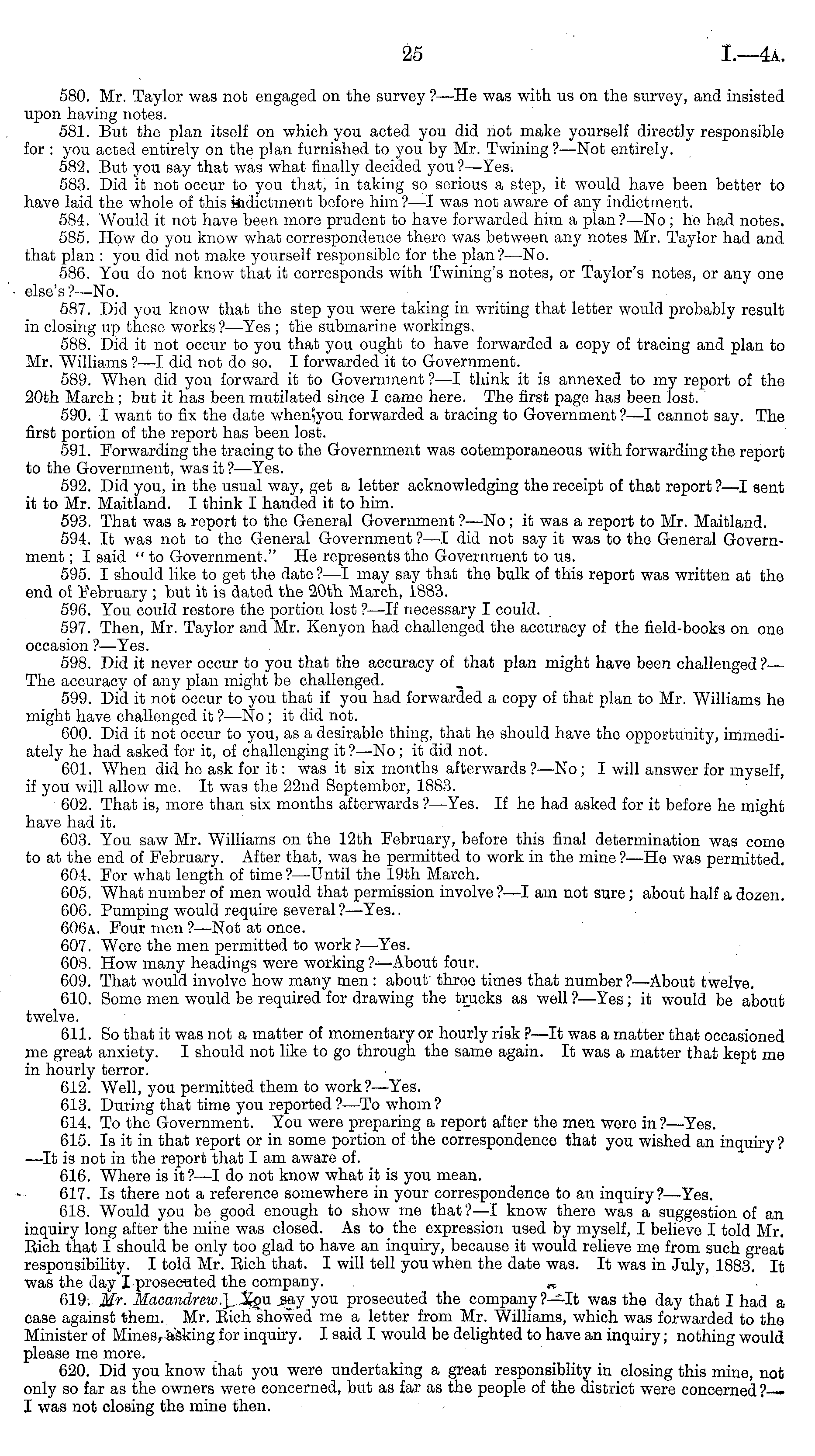 580. Mr. Taylor was not engaged on the survey ?—He was with us on the survey, and insisted upon having notes. 581. But the plan itself on which you acted you did not make yourself directly responsible for : you acted entirely on the plan furnished to you by Mr. Twining ?—Not entirely. 582. But you say that was what finally decided you? —Yes. 583. Did it not occur to you that, in taking so serious a step, it would have been better to have laid the whole of this indictment before him ? —I was not aware of any indictment. 584. Would it not have been more prudent to have forwarded him a plan?—No; he had notes. 585. How do you know what correspondence there was between any notes Mr. Taylor had and that plan : you did not make yourself responsible for the plan ? —No. 586. You do not know that it corresponds with Twining's notes, or Taylor's notes, or any one else's?—No. 587. Did you know that the step you were taking in writing that letter would probably result in closing up these works ? —Yes ; the submarine workings. 588. Did it not occur to you that you ought to have forwarded a copy of tracing and plan to Mr. Williams ? —I did not do so. I forwarded it to Government. 589. When did you forward it to Government ? —I think it is annexed to my report of the 20th March; but it has been mutilated since I came here. The first page has been lost. 590. I want to fix the date whentyou forwarded a tracing to Government ? —I cannot say. The first portion of the report has been lost. 591. Forwarding the tracing to the Government was cotemporaneous with forwarding the report to the Government, was it ?—Yes. 592. Did you, in the usual way, get a letter acknowledging the receipt of that report ?—I sent it to Mr. Maitiand. I think I handed it to him. 593. That was a report to the General Government ?—No; it was a report to Mr. Maitiand. 594. It was not to the General Government ?—-I did not say it was to the General Government; I said "to Government." He represents the Government to us. 595. I should like to get the date?—l may say that the bulk of this report was written at the end of February ; but it is dated the 2,oth March, 1883. 596. You could restore the portion lost ? —lf necessary I could. 597. Then, Mr. Taylor and Mr. Kenyon had challenged the accuracy of the field-books on one occasion ?—Yes. 598. Did it never occur to you that the accuracy of that plan might have been challenged ?— The accuracy of any plan might be challenged. 599. Did it not occur to you that if you had forwarded a copy of that plan to Mr. Williams he might have challenged it ?—No; it did not. 600. Did it not occur to you, as a desirable thing, that he should have the opportunity, immediately he had asked for it, of challenging it?—No; it did not. 601. When did he ask for it: was it six months afterwards ?—No; I will answer for myself, if you will allow me. It was the 22nd September, 1883. 602. That is, more than six months afterwards ? —Yes. If he had asked for it before he might have had it. 603. You saw Mr. Williams on the 12th February, before this final determination was come to at the end of February. After that, was he permitted to work in the mine ? —He was permitted. 604. For what length of time?—Until the 19th March. 605. What number of men would that permission involve?—l am not sure; about half a dozen. 606. Pumping would require several?—Yes.. 606a. Four men ?—Not at once. 607. Were the men permitted to work ?—Yes. 608. How many headings were working ?—About four. 609. That would involve how many men : about' three times that number?—About twelve. 610. Some men would be required for drawing the trucks as well ?—Yes; it would be about twelve. 611. So that it was not a matter of momentary or hourly risk P—lt was a matter that occasioned me great anxiety. I should not like to go through the same again. It was a matter that kept me in hourly terror. 612. Well, you permitted them to work?—Yes. 613. During that time you reported?—To whom? 614. To the Government. You were preparing a report after the men were in?—Yes. 615. Is it in that report or in some portion of the correspondence that you wished an inquiry ? —It is not in the report that lam aware of. 616. Where is it?—l do not know what it is you mean. 617. Is there not a reference somewhere in your correspondence to an inquiry?—Yes. 618. Would you be good enough to show me that ?—I know there was a suggestion of an inquiry long after the mine was closed. As to the expression used by myself, I believe I told Mr. Eich that I should be only too glad to have an inquiry, because it would relieve me from such great responsibility. I told Mr. Eich that. I will tell you when tho date was. It was in July, 1883. It was tho day I prosecuted the company. 619. Mr. Macandrew.] You say you prosecuted the company?—lt was the day that I had a case against them. Mr. Eich showed me a letter from Mr. Williams, which was forwarded to the Minister of Mines, asking for inquiry. I said I would be delighted to have an inquiry; nothing would please me more. 620. Did you know that you were undertaking a great responsiblity in closing this mine, not only so far as the owners were concerned, but as far as the people of the district were concerned ?—- I was not closing the mine then.