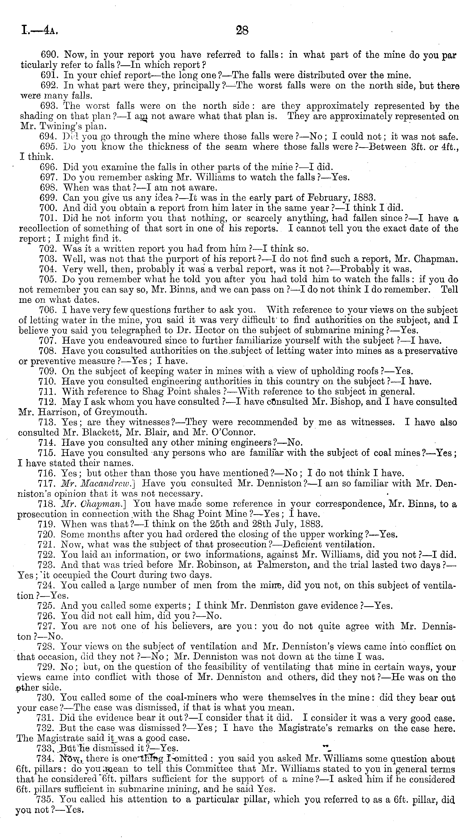 690. Now, in your report you have referred to falls: in what part of the mine do you particularly refer to falls ?—ln which report ? 691. In your chief report—the long one? —The falls were distributed over the mine. 692. In what part were they, principally?—The worst falls were on the north side, but there were many falls. 693. The worst falls were on the north side : are they approximately represented by the shading on that plan?—l am not aware what that plan is. They are approximately represented on Mr. Twining's plan. 694. Did you go through the mine where those falls were ?—No ; I could not; it was not safe. 695. Do vou know the thickness of the seam where those falls were ?—Between 3ft. or 4ft., I think. 696. Did you examine the falls in other parts of the mine ?—I did. 697. Do you remember asking Mr. Williams to watch the falls ? —Yes. 698. When was that ?•—I am not aware. 699. Can you give us any idea ?—lt was in the early part of February, 1883. 700. And did you obtain a report from him later in the same year ? —I think I did. 701. Did he not inform you that nothing, or scarcely anything, had fallen since ?—I have a recollection of something of that sort in one of his reports. I cannot tell you the exact date of the report; I might find it. 702. Was it a written report you had from him ? —I think so. 703. Well, was not that the purport of his report ? —I do not find, such a report, Mr. Chapman. 704. Very well, then, probably it was a verbal report, was it not ?—Probably it was. 705. Do you remember what he told you after you had told him to watch the falls : if you do not remember you can say so, Mr. Binns, and we can pass on ? —I do not think Ido remember. Tell me on what dates. 706. I have very few questions further to ask you. With reference to your views on the subject of letting water in the mine, you said it was very difficult to find authorities on the subject, and I believe you said you telegraphed to Dr. Hector on the subject of submarine mining ? —Yes. 707. Have you endeavoured since to further familiarize yourself with the subject ?—I have. 708. Have you consulted authorities on the .subject of letting water into mines as a preservative or preventive measure ? —Yes; I have. 709. On the subject of keeping water in mines with a view of upholding roofs ?—Yes. 710. Have you consulted engineering authorities in this country on the subject ?—I have. 711. With reference to Shag Point shales ?—With reference to the subject in general. 712. May I ask whom you have consulted ?—I have consulted Mr. Bishop, and I have consulted Mr. Harrison, of Greymouth. 713. Yes; are they witnesses? —They were recommended by me as witnesses. I have also consulted Mr. Blackett, Mr. Blair, and Mr. O'Connor. 714. Have you consulted any other mining engineers?—No. 715. Have you consulted any persons who are familiar with the subject of coal mines?—Yes; I have stated their names. 716. Yes; but other than those you have mentioned?—No ;I do not think I have. 717. Mr. Macandrew.] Have you consulted Mr. Denniston?—l am so familiar with Mr. Denniston's opinion that it was not necessary. 718. Mr. Chapman/] You have made some reference in your correspondence, Mr. Binns, to a prosecution in connection with the Shag Point Mine ? —Yes; I have. 719. When was that?—l think on the 25th and 28th July, 1883. 720. Some months after you had ordered the closing of the upper working ?—Yes. 721. Now, what was the subject of that prosecution?—Deficient ventilation. 722. You laid an information, or two informations, against Mr. Williams, did you not ?—I did. 723. And that was tried before Mr. Bobinson, at Palmerston, and the trial lasted two days ?— Yes; 'it occupied the Court during two days. 724. You called a large number of men from the mine, did you not, on this subject of ventilation ?—Yes. 725. And you called some experts; I think Mr. Denniston gave evidence ? —Yes. 726. You did not call him, did you ?—No. 727. You are not one of his believers, are you: you do not quite agree with Mr. Denniston ?—No. 728. Your views on the subject of ventilation and Mr. Denniston's views came into conflict on that occasion, did. they not ?—No; Mr. Denniston was not down at the time I was. 729. No; but, on the question of the feasibility of ventilating that mine in certain ways, your views came into conflict with those of Mr. Denniston and others, did they not ? —He was on the other side. 730. You called some of the coal-miners who were themselves in the mine : did they bear out your case? —The case was dismissed, if that is what you mean. 731. Did the evidence bear it out?—l consider that it did. I consider it was a very good case. 732. But the case was dismissed? —Yes; I have the Magistrate's remarks on the case here. Tlie Magistrate said it was a good case. 733. But he dismissed it ? —Yes. "*_ 734. Now, there is one tiling I-omitted : you said you asked Mr. Williams some question about 6ft. pillars : do you .mean to tell this Committee that Mr. Williams stated to you in general terms that he considered'6ft. pillars sufficient for the support of a mine?—l asked him if he considered 6ft. pillars sufficient in submarine mining, and he said Yes. 735. You called his attention to a particular pillar, which you referred to as a 6ft. pillar, did you not ? —Yes.