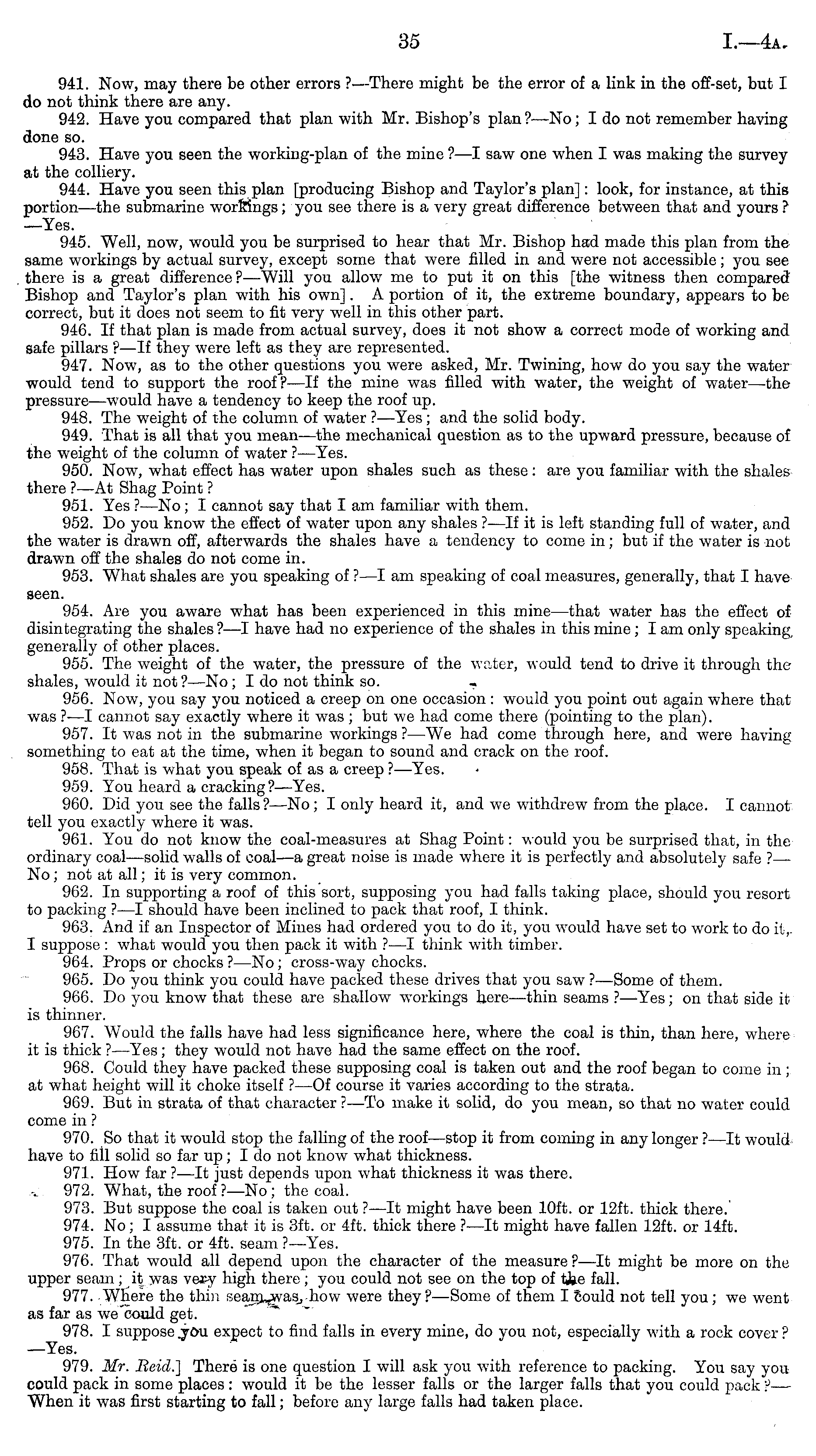 941. Now, may there be other errors ?—There might be the error of a link in the off-set, but I do not think there are any. 942. Have you compared that plan with Mr. Bishop's plan?—No; I do not remember having done so. 943. Have you seen the working-plan of the mine ?—I saw one when I was making the survey at the colliery. 944. Have you seen this plan [producing Bishop and Taylor's plan]: look, for instance, at this portion—the submarine workings; you see there is a very great difference between that and yours ? —Yes. 945. Well, now, would you be surprised to hear that Mr. Bishop had made this plan from the same workings by actual survey, except some that were filled in and were not accessible; you see there is a great difference ? —Will you allow me to put it on this [the witness then compared Bishop and Taylor's plan with his own]. A portion of it, the extreme boundary, appears to be correct, but it does not seem to fit very well in this other part. 946. If that plan is made from actual survey, does it not show a correct mode of working and safe pillars ?—lf they were left as they are represented. 947. Now, as to the other questions you were asked, Mr. Twining, how do you say the water would tend to support the roof?—lf the mine was filled with water, the weight of water —the pressure —would have a tendency to keep the roof up. 948. The weight of the column of water ?—Yes; and the solid body. 949. That is all that you mean —the mechanical question as to the upward pressure, because of the weight of the column of water ? —Yes. 950. Now, what effect has water upon shales such as these: are you familiar with the shales there ?—At Shag Point ? 951. Yes ?—No ; I cannot say that I am familiar with them. 952. Do you know the effect of water upon any shales ?—lf it is left standing full of water, and the water is drawn off, afterwards the shales have a tendency to come in; but if the water is not drawn off the shales do not come in. 953. What shales are you speaking of ? —I am speaking of coal measures, generally, that I have seen. 954. Are you aware what has been experienced in this mine—that water has the effect of disintegrating the shales?—l have had no experience of the shales in this mine; lam only speaking, generally of other places. 955. The weight of the water, the pressure of the water, would tend to drive it through the shales, would it not?—No; I do not think so. 956. Now, you say you noticed a creep on one occasion : would you point out again where that was ?■ —I cannot say exactly where it was ; but we had come there (pointing to the plan). 957. It was not in the submarine workings ? —We had come through here, and were having something to eat at the time, when it began to sound and crack on the roof. 958. That is what you speak of as a creep ?—Yes. 959. You heard a cracking ?—Yes. 960. Did you see the falls?—No; I only heard it, and we withdrew from the place. I cannot tell you exactly where it was. 961. You do not know the coal-measures at Shag Point: would you be surprised that, in the ordinary coal—solid walls of coal —a great noise is made where it is perfectly and absolutely safe ?— No; not at all; it is very common. 962. In supporting a roof of this sort, supposing you had falls taking place, should you resort to packing ?—I should have been inclined to pack that roof, I think. 963. And if an Inspector of Mines had ordered you to do it, you would have set to work to do it r I suppose : what would you then pack it with ?—I think with timber. 964. Props or chocks ? —No ; cross-way chocks. 965. Do you think you could have packed these drives that you saw ? —Some of them. 966. Do you know that these are shallow workings here—thin seams ? —Yes; on that side it is thinner. 967. W'ould the falls have had less significance here, where the coal is thin, than here, where it is thick ? —Yes; they would not have had the same effect on the roof. 968. Could they have packed these supposing coal is taken out and the roof began to come in ; at what height will it choke itself ? —Of course it varies according to the strata. 969. But in strata of that character ? —To make it solid, do you mean, so that no water could come in ? 970. So that it would stop the falling of the roof—stop it from coming in any longer ?—lt would have to fill solid so far up; Ido not know what thickness. 971. How far ?—lt just depends upon what thickness it was there. 972. What, the roof ?—No ; the coal. 973. But suppose the coal is taken out ?—lt might have been 10ft. or 12ft. thick there. 974. No; I assume that it is 3ft. or 4ft. thick there ?—lt might have fallen 12ft. or 14ft. 975. In the 3ft. or 4ft. seam ?—Yes. 976. That would all depend upon the character of the measure ? —lt might be more on the upper seam; it was very high there; you could not see on the top of the fall. 977. Where the thin seam was, how were they?—Some of them I could not tell you; we went as far as we could get. 978. I suppose you expect to find falls in every mine, do you not, especially with a rock cover ? —Yes. 979. Mr. Beid.] There is one question I will ask you with reference to packing. You say you could pack in some places : would it be the lesser falls or the larger falls that you could pack ? — When it was first starting to fall; before any large falls had taken place.