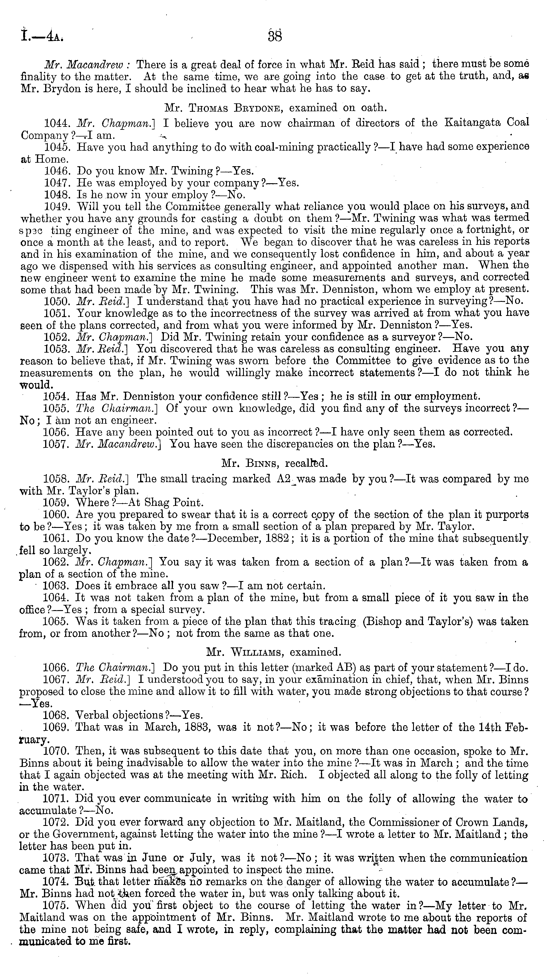 Mr. Macandrew : There is a great deal of force in what Mr. Eeid has said ; there must be some finality to the matter. At the same time, we are going into the case to get at the truth, and, as Mr. Brydon is here, I should be inclined to hear what he has to say. Mr. Thomas Brydone, examined on oath. 1044. Mr. Chapman.] I believe you are now chairman of directors of the Kaitangata Coal Company ?—»I am. *; 1045. Have you had anything to do with coal-mining practically ?—I have had some experience at Home. 1046. Do you know Mr. Twining ? —Yes. 1047. He was employed by your company?—Yes. 1048. Is he now in your employ ?—No. 1049. Will you tell the Committee generally what reliance you would place on his surveys, and whether you have any grounds for casting a doubt on them ? —Mr. Twining was what was termed spec ting engineer of the mine, and w*as expected to visit the mine regularly once a fortnight, or once a month at the least, and to report. We began to discover that he was careless in his reports and in his examination of the mine, and we consequently lost confidence in him, and about a year ago we dispensed with his services as consulting engineer, and appointed another man. When the new engineer went to examine the mine he made some measurements and surveys, and corrected some that had been made by Mr. Twining. This was Mr. Denniston, whom we employ at present. 1050. Mr. Beid.] I understand that you have had no practical experience in surveying ?—No. 1051. Your knowledge as to the incorrectness of the survey was arrived at from what you have seen of the plans corrected, and from what you were informed by Mr. Denniston ?—Yes. 1052. Mr. Chapman.] Did Mr. Twining retain your confidence as a surveyor ? —No. 1053. Mr. Beid.] You discovered that he was careless as consulting engineer. Have you any reason to believe that, if Mr. Twining was sworn before the Committee to give evidence as to the measurements on the plan, he would willingly make incorrect statements ?—I do not think he would. 1054. Has Mr. Denniston your confidence still ?—Yes ; he is still in our employment. 1055. The Chairman.] Of your own knowledge, did you find any of the surveys incorrect ?— No; lam not an engineer. 1056. Have any been pointed out to you as incorrect ?—I have only seen them as corrected. 1057. Mr. Macandrew.] You have seen the discrepancies on the plan?—Yes. Mr. Binns, recalled. 1058. Mr. Beid.] The small tracing marked A2 was made by you ?—lt was compared by me with Mr. Taylor's plan. 1059. Where ?—At Shag Point. 1060. Are you prepared to swear that it is a correct copy of the section of the plan it purports to be ?—Yes; it was taken by me from a small section of a plan prepared by Mr. Taylor. 1061. Do you know the date?—December, 1882 ; it is a portion of the mine that subsequently . fell so largely. 1062. Mr. Chapman.] You say it was taken from a section of a plan?—lt was taken from a plan of a section of the mine. 1063. Does it embrace all you saw ?—I am not certain. 1064. It was not taken from a plan of the mine, but from a small piece of it you saw in the office ? —Yes ; from a special survey. 1065. Was it taken from a piece of the plan that this tracing (Bishop and Taylor's) was taken from, or from another?—No ; not from the same as that one. Mr. Williams, examined. 1066. The Chairman.] Do you put in this letter (marked AB) as part of your statement ?—I do. 1067. Mr. Beid.] I understood you to say, in your examination in chief, that, when Mr. Binns proposed to close the mine and allow it to fill with water, you made strong objections to that course ? —Yes. 1068. Verbal objections ? —Yes. 1069. That was in March, 1883, was it not ?—No; it was before the letter of the 14th February. 1070. Then, it was subsequent to this date that you, on more than one occasion, spoke to Mr. Binns about it being inadvisable to allow the water into the mine ? —lt was in March ; and the time that I again objected was at the meeting with Mr. Eich. I objected all along to the folly of letting in the water. 1071. Did you ever communicate in writing with him on the folly of allowing the water to accumulate ?—No. 1072. Did you ever forward any objection to Mr. Maitiand, the Commissioner of Crown Lands, or the Government, against letting the water into the mine ?—I wrote a letter to Mr. Maitiand ; the letter has been put in. 1073. That was in June or July, was it not?—No ; it was written when the communication came that Mr. Binns had been appointed to inspect the mine. 1074. But that letter makes no remarks on the danger of allowing the water to accumulate ?— Mr. Binns had not then forced the water in, but was only talking about it. 1075. When did you first object to the course of letting the water in?—My letter to Mr. Maitiand was on the appointment of Mr. Binns. Mr. Maitiand wrote to me about the reports of the mine not being safe, and I wrote, in reply, complaining that the matter had not been communicated to me first.