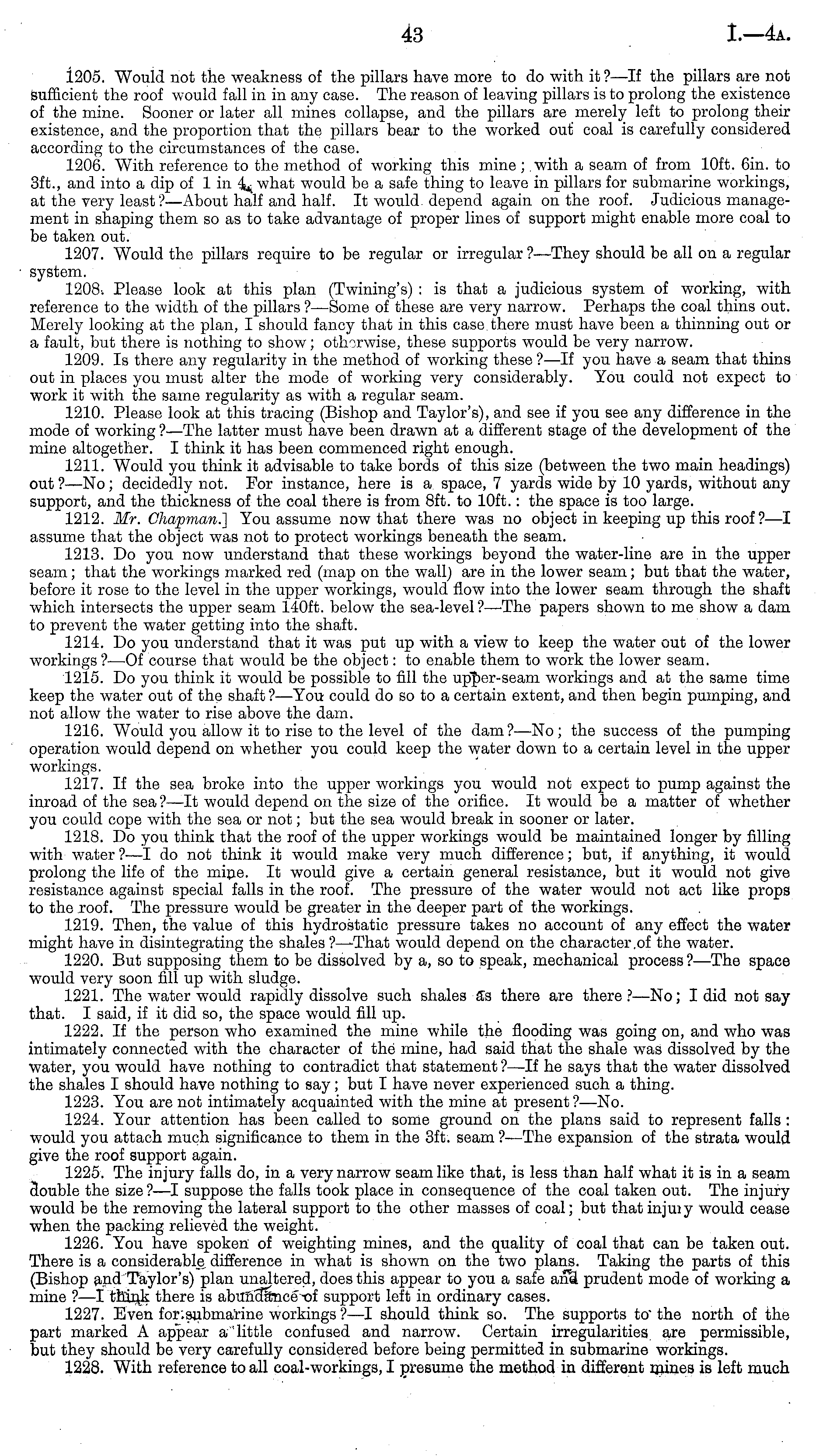 1205. Would not the weakness of the pillars have more to do with it ? —lf the pillars are not sufficient the roof would fall in in any case. The reason of leaving pillars is to prolong the existence of tho mine. Sooner or later all mines collapse, and the pillars are merely left to prolong their existence, and the proportion that the pillars bear to the worked out coal is carefully considered according to the circumstances of the case. 1206. With reference to the method of working this mine ; with a seam of from 10ft. 6in. to 3ft., and into a dip of 1 in 4» what would be a safe thing to leave in pillars for submarine workings, at the very least ?—About half and half. It would, depend again on the roof. Judicious management in shaping them so as to take advantage of proper lines of support might enable more coal to be taken out. 1207. Would the pillars require to be regular or irregular ?—They should be all on a regular system. 1208-. Please look at this plan (Twining's) : is that a judicious system of working, with reference to the width of the pillars ?—Some of these are very narrow. Perhaps the coal thins out. Merely looking at the plan, I should fancy that in this case.there must have been a thinning out or a fault, but there is nothing to show; otherwise, these supports would be very narrow. 1209. Is there any regularity in the method of working these ?—lf you have a seam that thins out in places you must alter the mode of working very considerably. You could not expect to work it with the same regularity as with a regular seam. 1210. Please look at this tracing (Bishop and Taylor's), and see if you see any difference in the mode of working ?—The latter must have been drawn at a different stage of the development of the mine altogether. I think it has been commenced right enough. 1211. Would you think it advisable to take bords of this size (between the two main headings) out ?—No; decidedly not. For instance, here is a space, 7 yards wide by 10 yards, without any support, and the thickness of the coal there is from Bft. to 10ft.: the space is too large. 1212. Mr. Chapman.] You assume now that there was no object in keeping up this roof?—I assume that the object was not to protect workings beneath the seam. 1213. Do you now understand that these workings beyond the water-line are in the upper seam; that the workings marked red (map on the wall) are in the lower seam; but that the water, before it rose to the level in the upper workings, would flow into the lower seam through the shaft which intersects the upper seam 140ft. below the sea-level?—The papers shown to me show a dam to prevent the water getting into the shaft. 1214. Do you understand that it was put up with a view to keep the water out of the lower workings ?—Of course that would be the object: to enable them to work the lower seam. 1215. Do you think it would be possible to fill the upper-seam workings and at the same time keep the water out of the shaft ?—You could do so to a certain extent, and then begin pumping, and not allow the water to rise above the dam. 1216. Would you allow it to rise to the level of the dam? —No; the success of the pumping operation would depend on whether you could keep the water down to a certain level in the upper workings. 1217. If the sea broke into the upper workings you would not expect to pump against the inroad of the sea? —It would depend on the size of the orifice. It would be a matter of whether you could cope with the sea or not; but the sea would break in sooner or later. 1218. Do you think that the roof of the upper workings would be maintained longer by filling with water ?—I do not think it would make very much difference; but, if anything, it would prolong the life of the mine. It would give a certain general resistance, but it would not give resistance against special falls in the roof. The pressure of the water would not act like props to the roof. The pressure would be greater in the deeper part of the workings. 1219. Then, the value of this hydrostatic pressure takes no account of any effect the water might have in disintegrating the shales ?—That would depend on the character.of the water. 1220. But supposing them to be dissolved by a, so to speak, mechanical process ?—The space would very soon fill up with sludge. 1221. The water would rapidly dissolve such shales as there are there?—No; I did not say that. I said, if it did so, the space would fill up. 1222. If the person who examined the mine while the flooding was going on, and who was intimately connected with the character of the mine, had said that the shale was dissolved by the water, you would have nothing to contradict that statement ?—lf he says that the water dissolved the shales I should have nothing to say; but I have never experienced such a thing. 1223. You are not intimately acquainted with the mine at present?—No. 1224. Your attention has been called to some ground on the plans said to represent falls : would you attach much significance to them in the 3ft. seam ?—The expansion of the strata would give the roof support again. 1225. The injury falls do, in a very narrow seam like that, is less than half what it is in a seam double the size?—l suppose the falls took place in consequence of the coal taken out. The injury would be the removing the lateral support to the other masses of coal; but thatinjuiy would cease when the packing relieved the weight. 1226. You have spoken of weighting mines, and the quality of coal that can be taken out. There is a considerable difference in what is shown on the two plans. Taking the parts of this (Bishop and Taylor's) plan unaltered, does this appear to you a safe and prudent mode of working a mine ? —I think there is abundance-of support left in ordinary cases. 1227. Even for.submarine workings ?—I should think so. The supports to' the north of the part marked A appear a little confused and narrow. Certain irregularities 