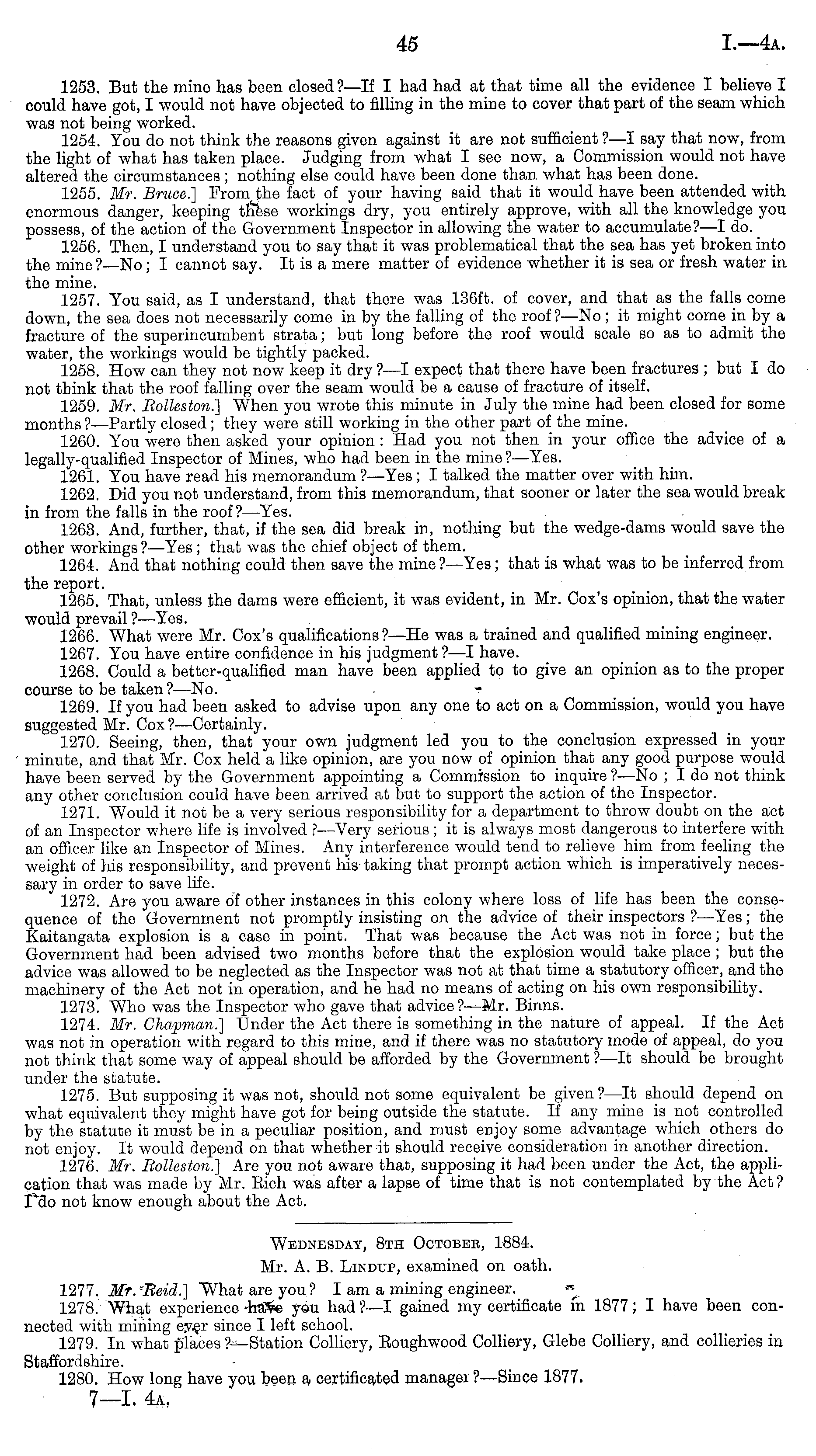 Wednesday, Bth October, 1884. Mr. A. B. Lindup, examined on oath. 1277. Mr. Beid.] What are you? lam a mining engineer. 1278. What experience -have you had ? —I gained my certificate in 1877; I have been connected with mining ey<jr since I left school. 1279. In what places ?—Station Colliery, Eoughwood Colliery, Glebe Colliery, and collieries in Staffordshire. 1280. How long have you been a certificated manager?—Since 1877. 7—L 4a,