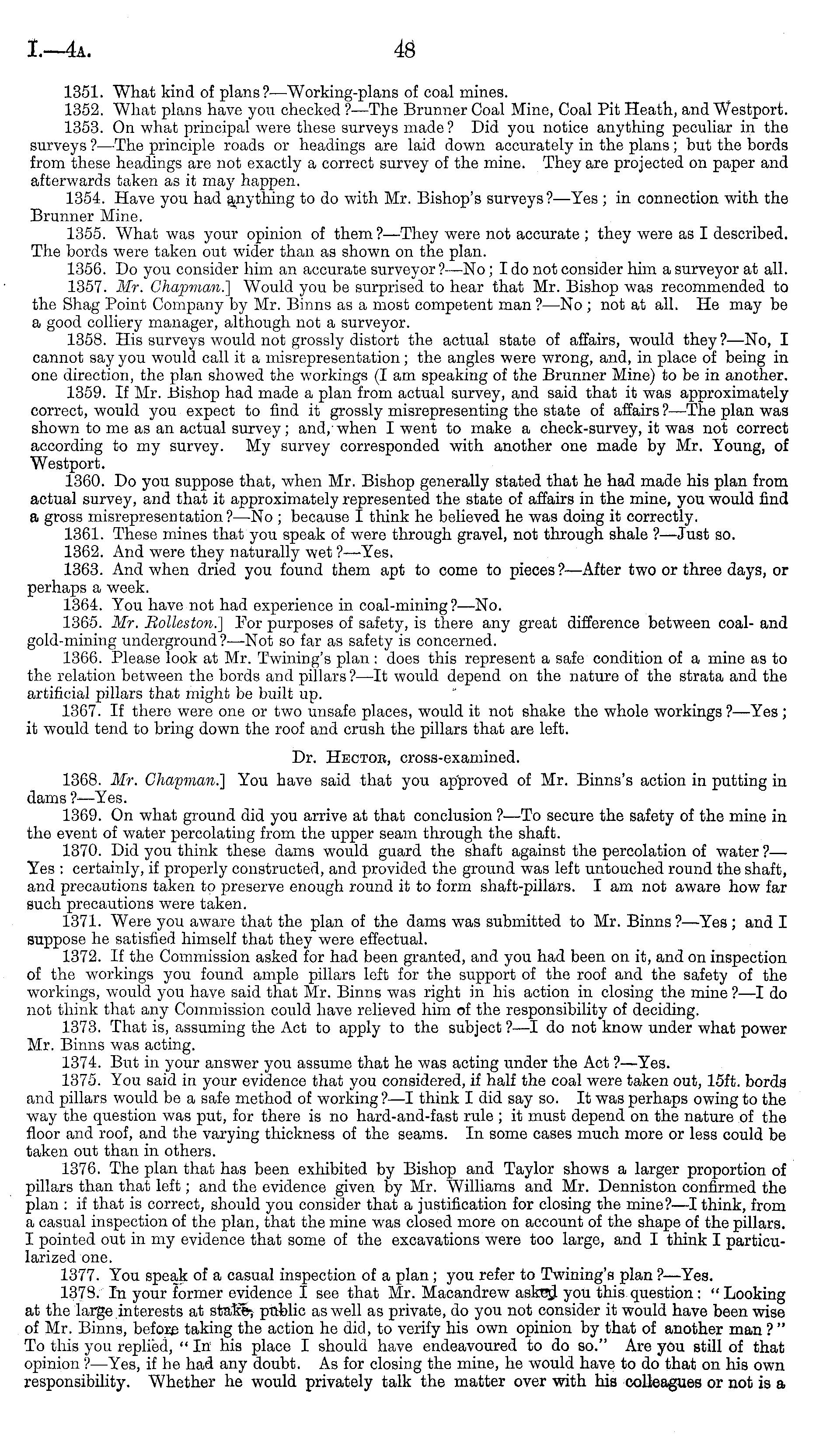 1351. What kind of plans?—Working-plans of coal mines. 1352. What plans have you checked ?—The Brunner Coal Mine, Coal Pit Heath, and Westport. 1353. On what principal were these surveys made ? Did you notice anything peculiar in the surveys ? —The principle roads or headings are laid down accurately in the plans; but the bords from these headings are not exactly a correct survey of the mine. They are projected on paper and afterwards taken as it may happen. 1354. Have you had anything to do with Mr. Bishop's surveys? —Yes ; in connection with the Brunner Mine. 1355. What was your opinion of them ?—They were not accurate ; they were as I described. The bords were taken out wider than as shown on the plan. 1356. Do you consider him an accurate surveyor ? —No; Ido not consider him a surveyor at all. 1357. Mr. Chapman.] Would you be surprised to hear that Mr. Bishop was recommended to the Shag Point Company by Mr. Binns as a most competent man ? —No ; not at all. He may be a good colliery manager, although not a surveyor. 1358. His surveys would not grossly distort the actual state of affairs, would they?—No, I cannot say you would call it a misrepresentation; the angles were wrong, and, in place of being in one direction, the plan showed the workings (I am speaking of the Brunner Mine) to be in another. 1359. If Mr. Bishop had made a plan from actual survey, and said that it was approximately correct, would you expect to find it grossly misrepresenting the state of affairs ?—The plan was shown to me as an actual survey; and,'when I went to make a check-survey, it was not correct according to my survey. My survey corresponded with another one made by Mr. Young, of Westport. 1360. Do you suppose that, when Mr. Bishop generally stated that he had made his plan from actual survey, and that it approximately represented the state of affairs in the mine, you would find a gross misrepresentation?—No ; because I think he believed he was doing it correctly. 1361. These mines that you speak of were through gravel, not through shale ?—Just so. 1362. And were they naturally wet ?—Yes. 1363. And when dried you found them apt to come to pieces?—After two or three days, or perhaps a week. 1364. You have not had experience in coal-mining?—No. 1365. Mr. Bolleston.] For purposes of safety, is there any great difference between coal- and gold-mining underground ?—Not so far as safety is concerned. 1366. Please look at Mr. Twining's plan : does this represent a safe condition of a mine as to the relation between the bords and pillars?—lt would depend on the nature of the strata and the artificial pillars that might be built up. 1367. If there were one or two unsafe places, would it not shake the whole workings ? —Yes ; it would tend to bring down the roof and crush the pillars that are left. Dr. Hector, cross-examined. 1368. Mr. Chapman.] You have said that you approved of Mr. Binns's action in putting in dams ? —Yes. 1369. On what ground did you arrive at that conclusion ?—To secure the safety of the mine in the event of water percolating from the upper seam through the shaft. 1370. Did you think these dams would guard the shaft against the percolation of water ?— Yes : certainly, if properly constructed, and provided the ground w*as left untouched round the shaft, and precautions taken to preserve enough round it to form shaft-pillars. I am not aware how far such precautions were taken. 1371. Were you aware that the plan of the dams was submitted to Mr. Binns?—Yes ; and I suppose he satisfied himself that they were effectual. 1372. If the Commission asked for had been granted, and you had been on it, and on inspection of the workings you found ample pillars left for the support of tho roof and the safety of the workings, would you have said that Mr. Binns was right in his action in closing the mine ?—I do not think that any Commission could have relieved him of the responsibility of deciding. 1373. That is, assuming the Act to apply to the subject ? —I do not know under what power Mr. Binns was acting. 1374. But in your answer you assume that he was acting under the Act ? —Yes. 1375. You said in your evidence that you considered, if half the coal were taken out, 15ft. bords and pillars would be a safe method of working ?—I think I did say so. It was perhaps owing to the way the question was put, for there is no hard-and-fast rule ; it must depend on the nature of the floor and roof, and the varying thickness of the seams. In some cases much more or less could be taken out than in others. 1376. The plan that has been exhibited by Bishop and Taylor shows a larger proportion of pillars than that left; and the evidence given by Mr. Williams and Mr. Denniston confirmed the plan :if that is correct, should you consider that a justification for closing the mine?—l think, from a casual inspection of the plan, that the mine was closed more on account of the shape of the pillars. I pointed out in my evidence that some of the excavations were too large, and I think I particularized one. 1377. You speak of a casual inspection of a plan ; you refer to Twining's plan ?—Yes. 1378. In your former evidence I see that Mr. Macandrew asked you this.question : "Looking at the large interests at stake, public as well as private, do you not consider it would have been wise of Mr. Binns, before taking the action he did, to verify his own opinion by that of another man ? " To this you replied, "In his place I should have endeavoured to do so." Are you still of that opinion ?—Yes, if he had any doubt. As for closing the mine, he would have to do that on his own responsibility. Whether he would privately talk the matter over with his colleagues or not is a
