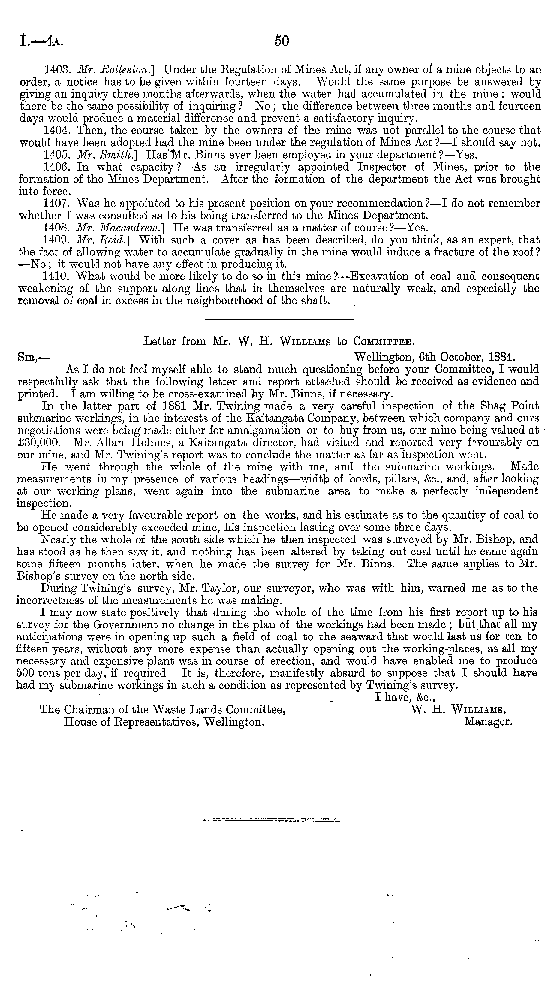 Letter from Mr. W. H. Williams to Committee. Sir,— Wellington, 6th October, 1884. As I do not feel myself able to stand much questioning before your Committee, I would respectfully ask that the following letter and report attached should be received as evidence and printed. lam willing to be cross-examined by Mr. Binns, if necessary. In the latter part of 1881 Mr. Twining made a very careful inspection of the Shag Point submarine workings, in the interests of the Kaitangata Company, between which company and ours negotiations were being made either for amalgamation or to buy from us, our mine being valued at £30,000. Mr. Allan Holmes, a Kaitangata director, had visited and reported very favourably on our mine, and Mr. Twining's report was to conclude the matter as far as inspection went. He went through the whole of the mine with me, and the submarine workings. Made measurements in my presence of various headings—width of bords, pillars, &c, and, after looking at our working plans, went again into the submarine area to make a perfectly independent inspection. He made a very favourable report on the works, and his estimate as to the quantity of coal to be opened considerably exceeded mine, his inspection lasting over some three days. Nearly the whole of the south side which he then inspected was surveyed by Mr. Bishop, and has stood as he then saw it, and nothing has been altered by taking out coal until he came again some fifteen months later, when he made the survey for Mr. Binns. The same applies to Mr. Bishop's survey on the north side. During Twining's survey, Mr. Taylor, our surveyor, who was with him, warned me as to the incorrectness of the measurements he was making. I may now state positively that during the whole of the time from his first report up to his survey for the Government no change in the plan of the workings had been made ; but that all my anticipations were in opening up such a field of coal to the seaward that would last us for ten to fifteen years, without any more expense than actually opening out the working-places, as all my necessary and expensive plant was in course of erection, and would have enabled me to produce 500 tons per day, if required It is, therefore, manifestly absurd to suppose that I should have had my submarine workings in such a condition as represented by Twining's survey. I have, &c, The Chairman of the Waste Lands Committee, W. H. Williams, House of Bepresentatives, Wellington. Manager.