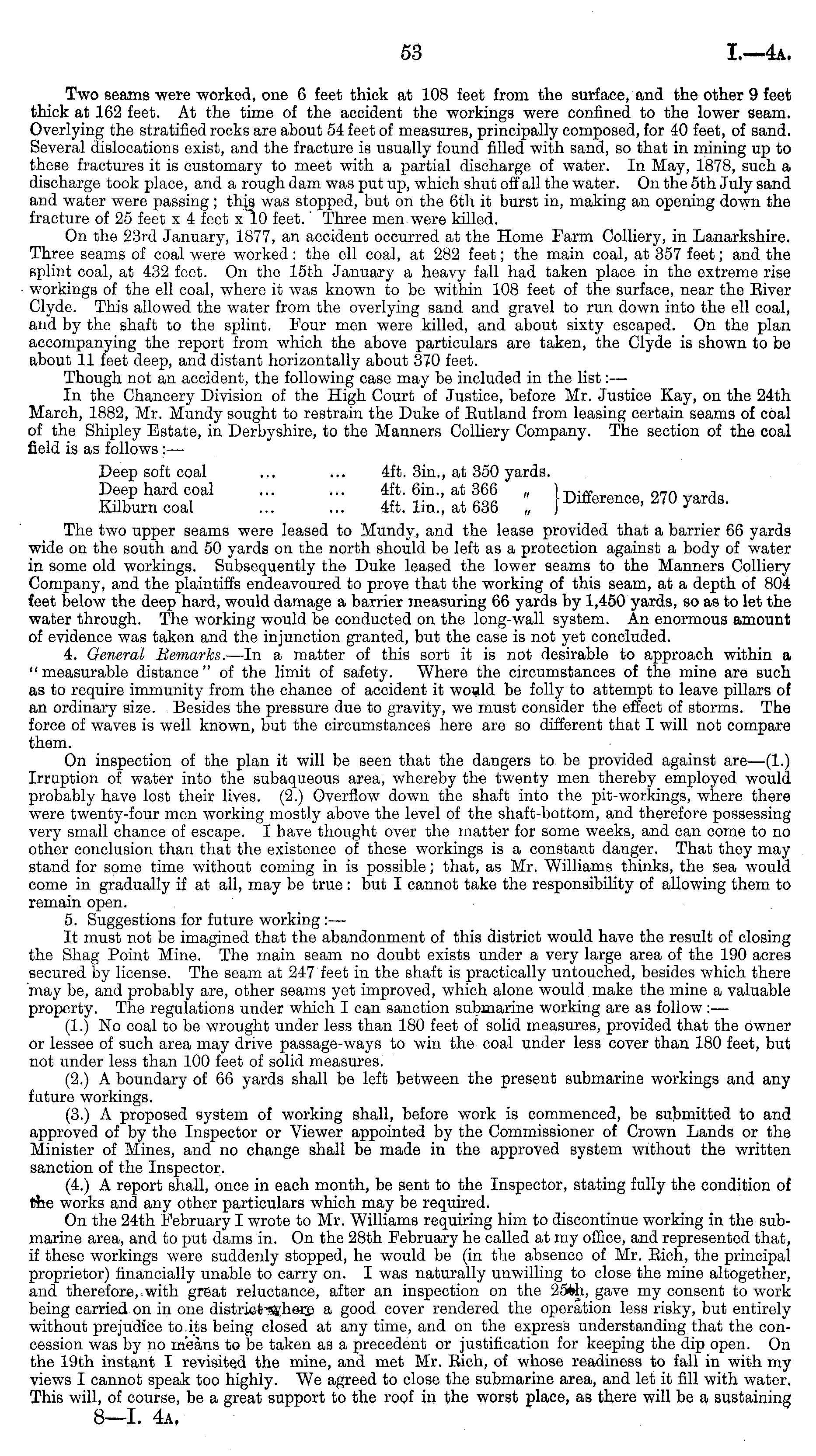 Two seams were worked, one 6 feet thick at 108 feet from the surface, and the other 9 feet thick at 162 feet. At the time of the accident the workings were confined to the lower seam. Overlying the stratified rocks are about 54 feet of measures, principally composed, for 40 feet, of sand. Several dislocations exist, and the fracture is usually found filled with sand, so that in mining up to these fractures it is customary to meet with a partial discharge of water. In May, 1878, such a discharge took place, and a rough dam was put up, which shut off all the water. On the sth July sand and water were passing ; this was stopped, but on the 6th it burst in, making an opening down the fracture of 25 feet x 4 feet xlO feet.' Three men were killed. On the 23rd January, 1877, an accident occurred at the Home Farm Colliery, in Lanarkshire. Three seams of coal were worked: the ell coal, at 282 feet; the main coal, at 357 feet; and the splint coal, at 432 feet. On the 15th January a heavy fall had taken place in the extreme rise workings of the ell coal, where it was known to be within 108 feet of the surface, near the Eiver Clyde. This allowed the water from the overlying sand and gravel to run down into the ell coal, and by the shaft to the splint. Four men were killed, and about sixty escaped. On the plan accompanying the report from which the above particulars are taken, the Clyde is shown to be about 11 feet deep, and distant horizontally about 370 feet. Though not an accident, the following case may be included in the list: — In the Chancery Division of the High Court of Justice, before Mr. Justice Kay, on the 24th March, 1882, Mr. Mundy sought to restrain the Duke of Eutland from leasing certain seams of coal of the Shipley Estate, in Derbyshire, to the Manners Colliery Company. The section of the coal field is as follows :— Deep soft coal ... ... 4ft. 3in., at 350 yards. Deep hard coal ... ... 4ft. 6in., at 366 „ lr)* ffprprlt>p Q7O vards Kilburncoal 4ft. lin., at 636 „ } Ultterence, <S/U yarda. The two upper seams were leased to Mundy, and the lease provided that a barrier 66 yards wide on the south and 50 yards on the north should be left as a protection against a body of water in some old workings. Subsequently the Duke leased the lower seams to the Manners Colliery Company, and the plaintiffs endeavoured to prove that the working of this seam, at a depth of 804 feet below the deep hard, would damage a barrier measuring 66 yards by 1,450 yards, so as to let the water through. The working would be conducted on the long-wall system. An enormous amount of evidence was taken and the injunction granted, but the case is not yet concluded. 4. General Bemarhs. —ln a matter of this sort it is not desirable to approach within a "measurable distance" of the limit of safety. Where the circumstances of the mine are such as to require immunity from the chance of accident it would be folly to attempt to leave pillars of an ordinary size. Besides the pressure due to gravity, we must consider the effect of storms. The force of waves is well known, but the circumstances here are so different that I will not compare them. On inspection of the plan it will be seen that the dangers to be provided against are—(l.) Irruption of water into the subaqueous area, whereby the twenty men thereby employed would probably have lost their lives. (2.) Overflow down the shaft into the pit-workings, where there were twenty-four men working mostly above the level of the shaft-bottom, and therefore possessing very small chance of escape. I have thought over the matter for some weeks, and can come to no other conclusion than that the existence of these workings is a constant danger. That they may stand for some time without coming in is possible; that, as Mr. Williams thinks, the sea would come in gradually if at all, may be true: but I cannot take the responsibility of allowing them to remain open. 5. Suggestions for future working : — It must not be imagined that the abandonment of this district would have the result of closing the Shag Point Mine. The main seam no doubt exists under a very large area of the 190 acres secured by license. The seam at 247 feet in the shaft is practically untouched, besides which there may be, and probably are, other seams yet improved, which alone would make the mine a valuable property. The regulations under which I can sanction submarine working are as follow: — (1.) No coal to be wrought under less than 180 feet of solid measures, provided that the owner or lessee of such area may drive passage-ways to win the coal under less cover than 180 feet, but not under less than 100 feet of solid measures. (2.) A boundary of 66 yards shall be left between the present submarine workings and any future workings. (3.) A proposed system of working shall, before work is commenced, be submitted to and approved of by the Inspector or Viewer appointed by the Commissioner of Crown Lands or the Minister of Mines, and no change shall be made in the approved system without the written sanction of the Inspector. (4.) A report shall, once in each month, be sent to the Inspector, stating fully the condition of the works and any other particulars which may be required. On the 24th February I wrote to Mr. Williams requiring him to discontinue working in the submarine area, and to put dams in. On the 28th February he called at my office, and represented that, if these workings were suddenly stopped, he would be (in the absence of Mr. Eich, the principal proprietor) financially unable to carry on. I was naturally unwilling to close the mine altogether, and therefore, with great reluctance, after an inspection on the 25*h, gave my consent to work being carried on in one district whei*j3 a good cover rendered the operation less risky, but entirely without prejudice to its being closed at any time, and on the express understanding that the concession was by no means to be taken as a precedent or justific