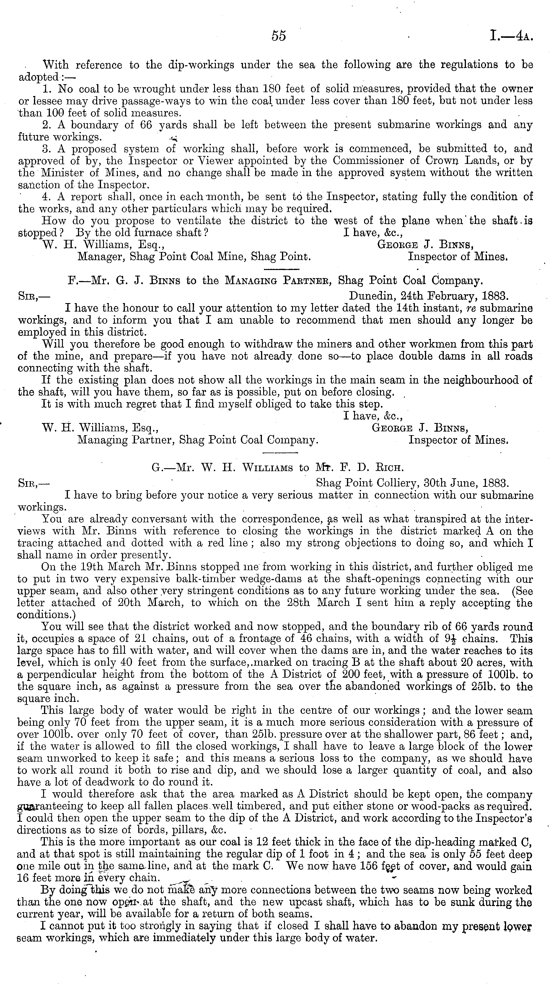 F.—Mr. G. J. Binns to the Managing Partner, Shag Point Coal Company. Sir, — Dunedin, 24th February, 1883. I have the honour to call your attention to my letter dated the 14th instant, re submarine workings, and to inform you that I am unable to recommend that men should any longer be employed in this district. Will you therefore be good enough to withdraw the miners and other workmen from this part of the mine, and prepare —if you have not already done so —to place double dams in all roads connecting with the shaft. If the existing plan does not show all the workings in the main seam in the neighbourhood of the shaft, will you have them, so far as is possible, put on before closing. It is with much regret that I find myself obliged to take this step. I have, &c, W. H. Williams, Esq., George J. Binns, Managing Partner, Shag Point Coal Company. Inspector of Mines.