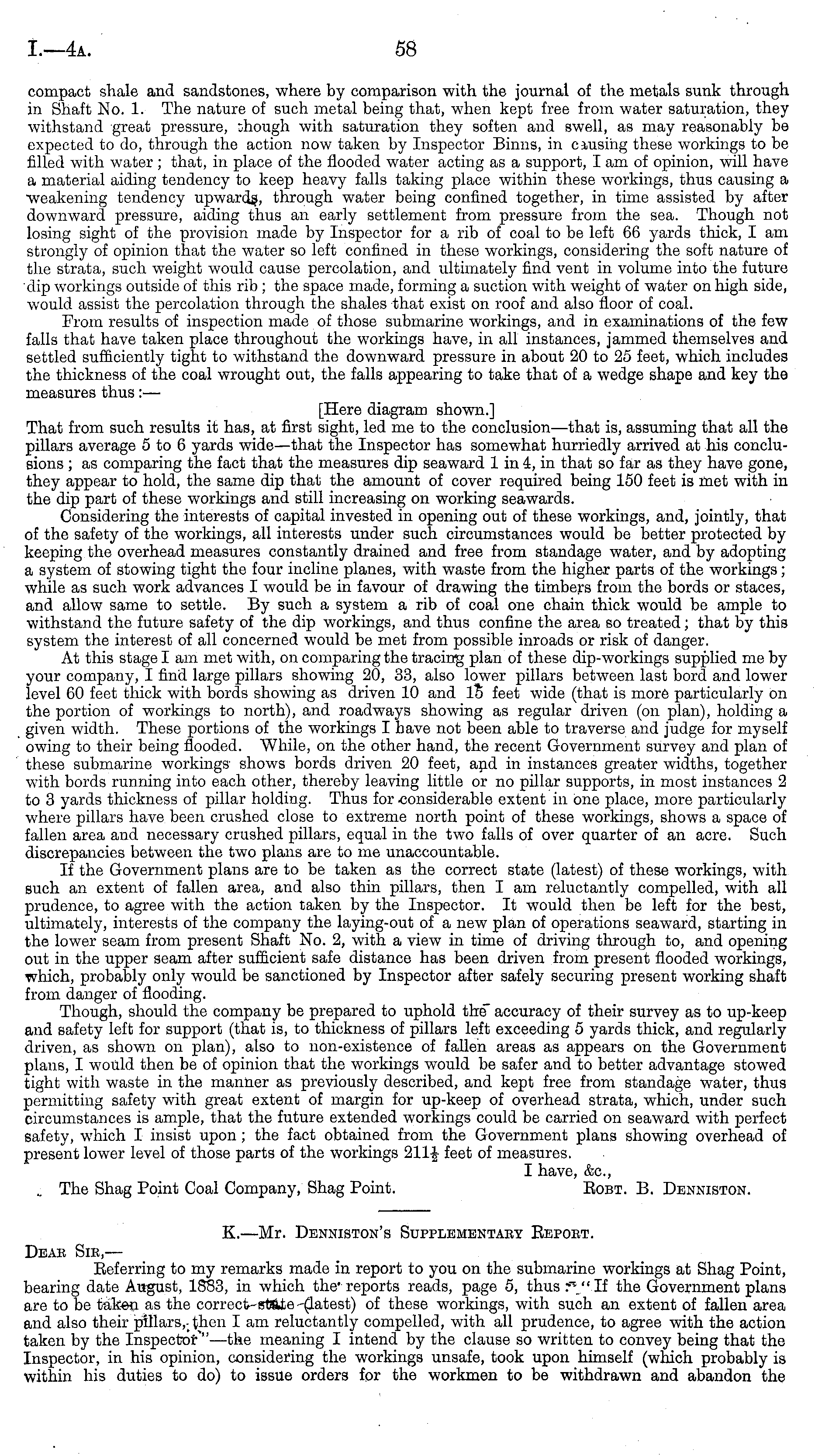 K.—Mr. Denniston's Supplementary Eeport. Dear Sir,— Eeferring to my remarks made in report to you on the submarine workings at Shag Point, bearing date August, 1883, in which the' reports reads, page 5, thus : "If the Government plans are to be taken as the correct state (latest) of these workings, with such an extent of fallen area and also their pillars, then I am reluctantly compelled, with all prudence, to agree with the action taken by the Inspector"—the meaning I intend by the clause so written to convey being that the Inspector, in his opinion, considering the workings unsafe, took upon himself (which probably is within his duties to do) to issue orders for the workmen to be withdrawn and abandon the