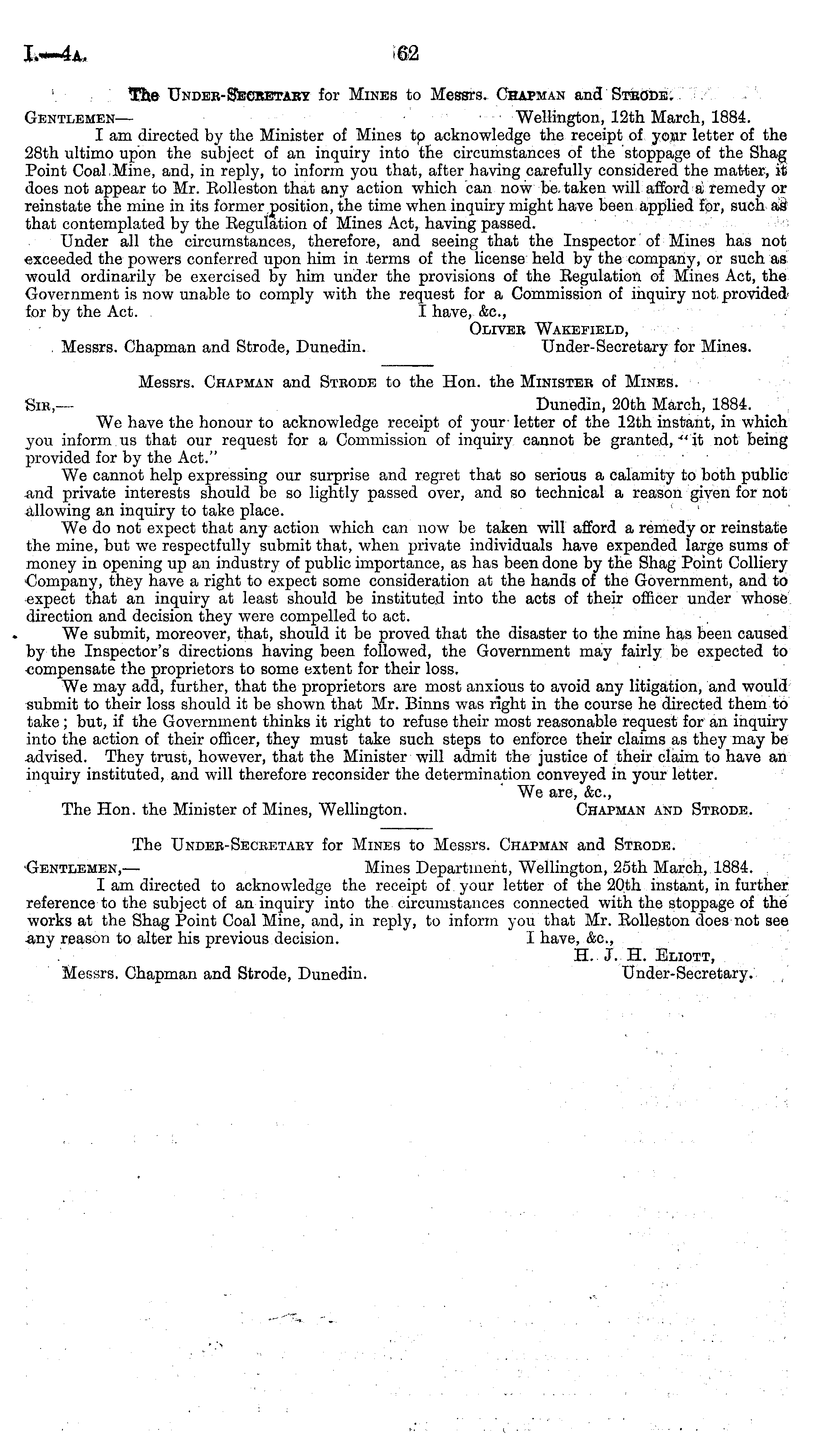 Messrs. Chapman and Strode to the Hon. the Minister of Mines. Sir,— Dunedin, 20th March, 1884. We have the honour to acknowledge receipt of your letter of the 12th instant, in which you inform us that our request for a Commission of inquiry cannot be granted, "it not being provided for by the Act." We cannot help expressing our surprise and regret that so serious a calamity to both public and private interests should be so lightly passed over, and so technical a reason given for not allowing an inquiry to take place. We do not expect that any action which can now be taken will afford a remedy or reinstate the mine, but we respectfully submit that, when private individuals have expended large sums of money in opening up an industry of public importance, as has been done by the Shag Point Colliery Company, they have a right to expect some consideration at the hands of the Government, and to expect that an inquiry at least should be instituted into the acts of their officer under whose direction and decision they were compelled to act. We submit, moreover, that, should it be proved that the disaster to the mine has been caused by the Inspector's directions having been followed, the Government may fairly be expected to compensate the proprietors to some extent for their loss. We may add, further, that the proprietors are most anxious to avoid any litigation, and would submit to their loss should it be shown that Mr. Binns was right in the course he directed them to take; but, if the Government thinks it right to refuse their most reasonable request for an inquiry into the action of their officer, they must take such steps to enforce their claims as they may be advised. They trust, however, that the Minister will admit the justice of their claim to have an inquiry instituted, and will therefore reconsider the determination conveyed in your letter. We are, &c, The Hon. the Minister of Mines, Wellington. Chapman and Strode.
