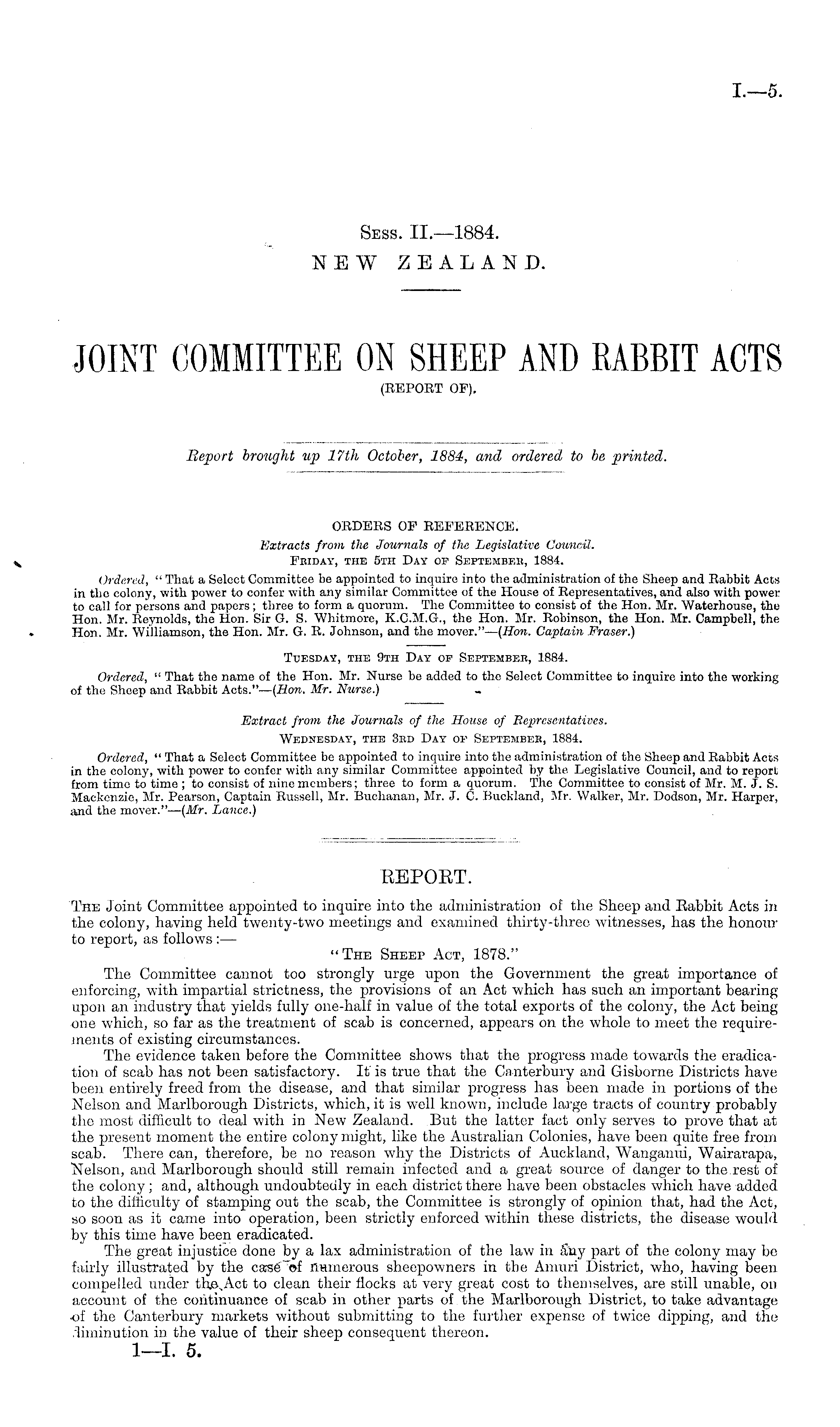 ORDERS OP REFERENCE. Extracts from the Journals of the Legislative Council. Friday, the sth Day op September, 1884. Ordered, " That a Select Committee be appointed to inquire into the administration of the Sheep and Rabbit Acts in the colony, with power to confer with any similar Committee of the House of Representatives, and also with power to call for persons and papers ; three to form a quorum. The Committee to consist of the Hon. Mr. Waterhouse, the Hon. Mr. Reynolds, the Hon. Sir G. S. Whitmore, K.C.M.G., the Hon. Mr. Robinson, the Hon. Mr. Campbell, the Hon. Mr. Williamson, the Hon. Mr. G. R. Johnson, and the mover."— (Hon. Captain Eraser.)